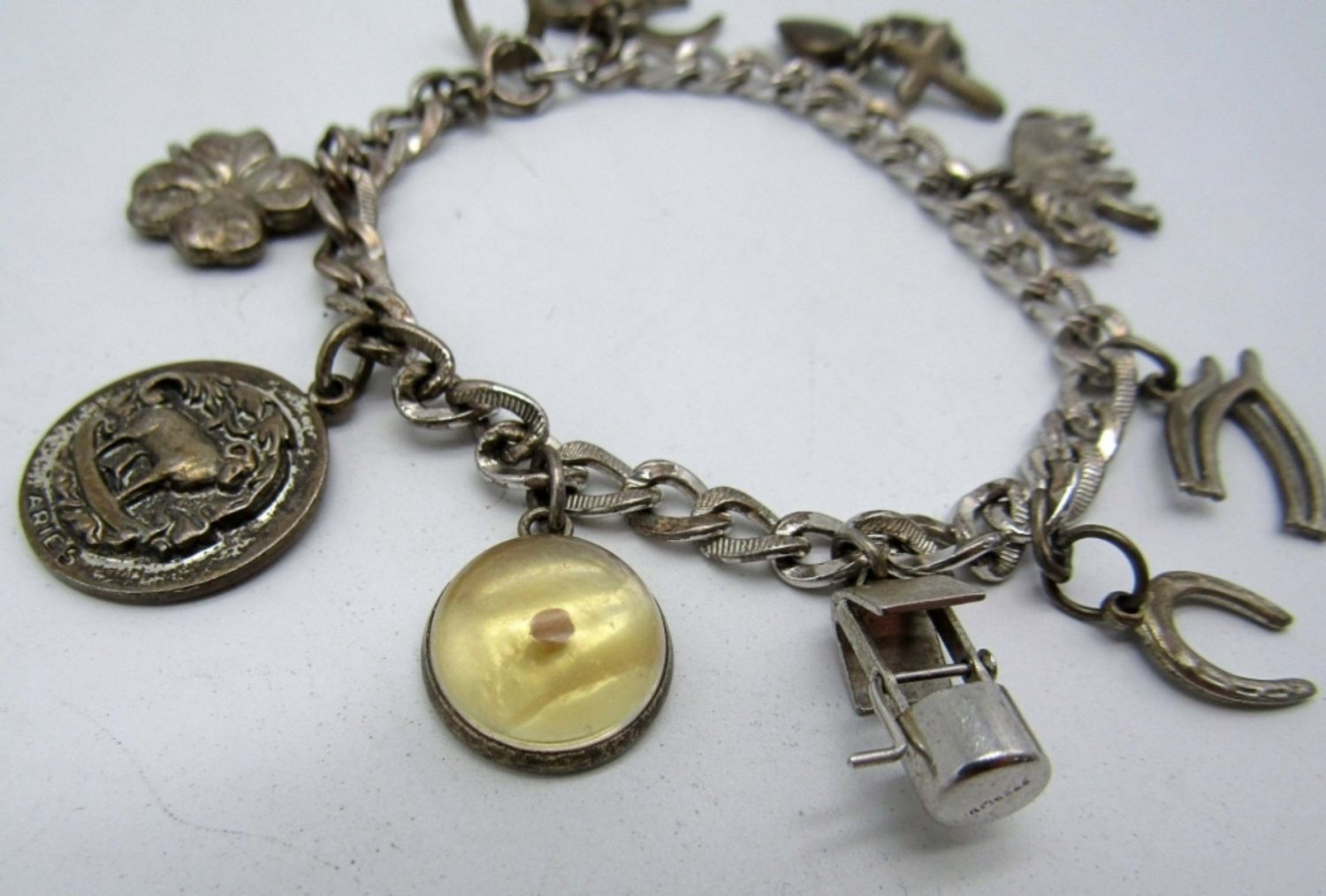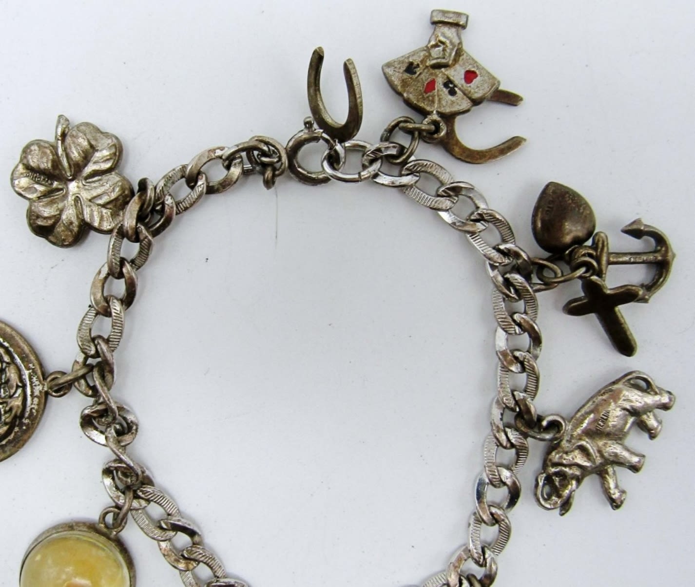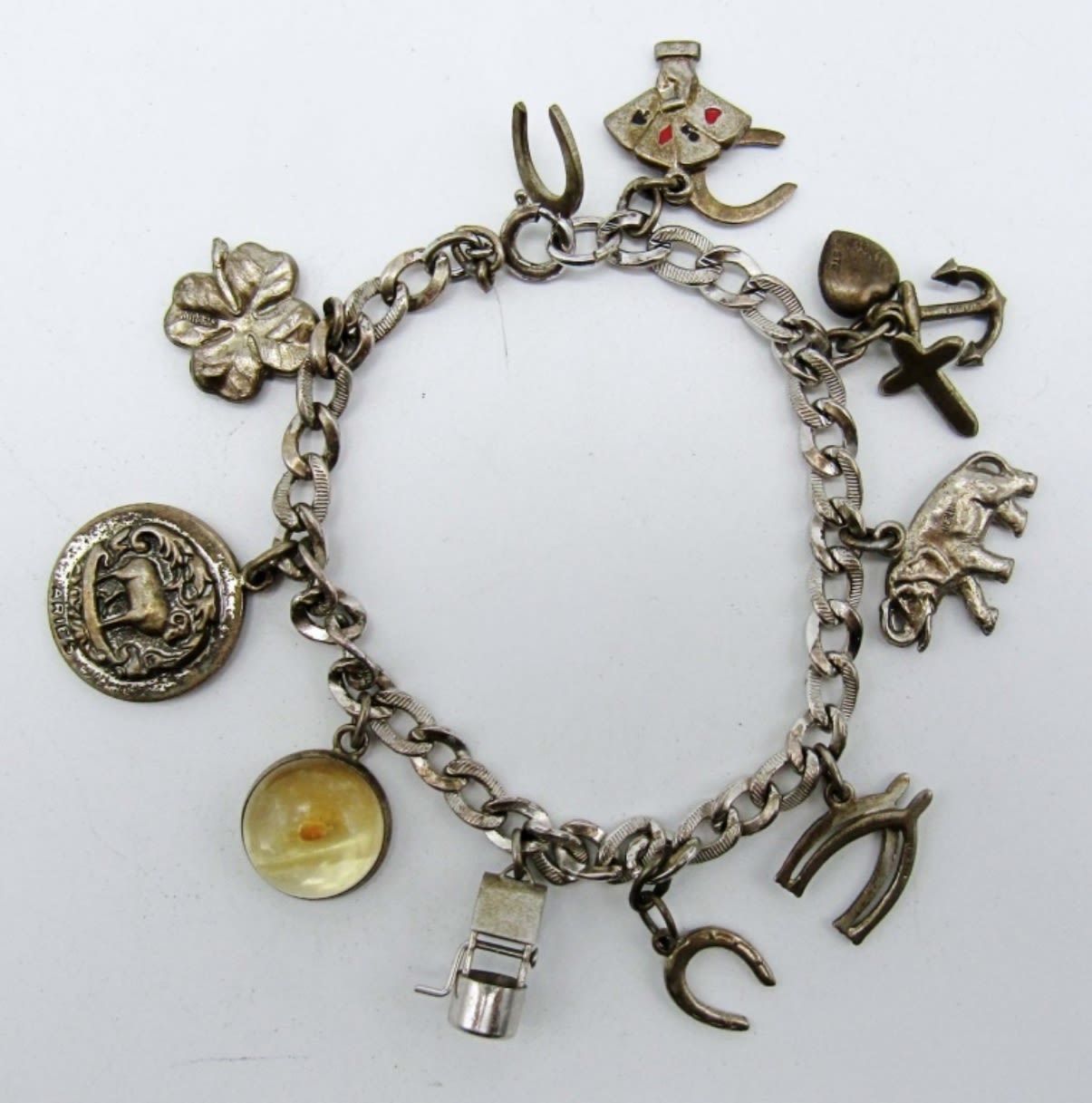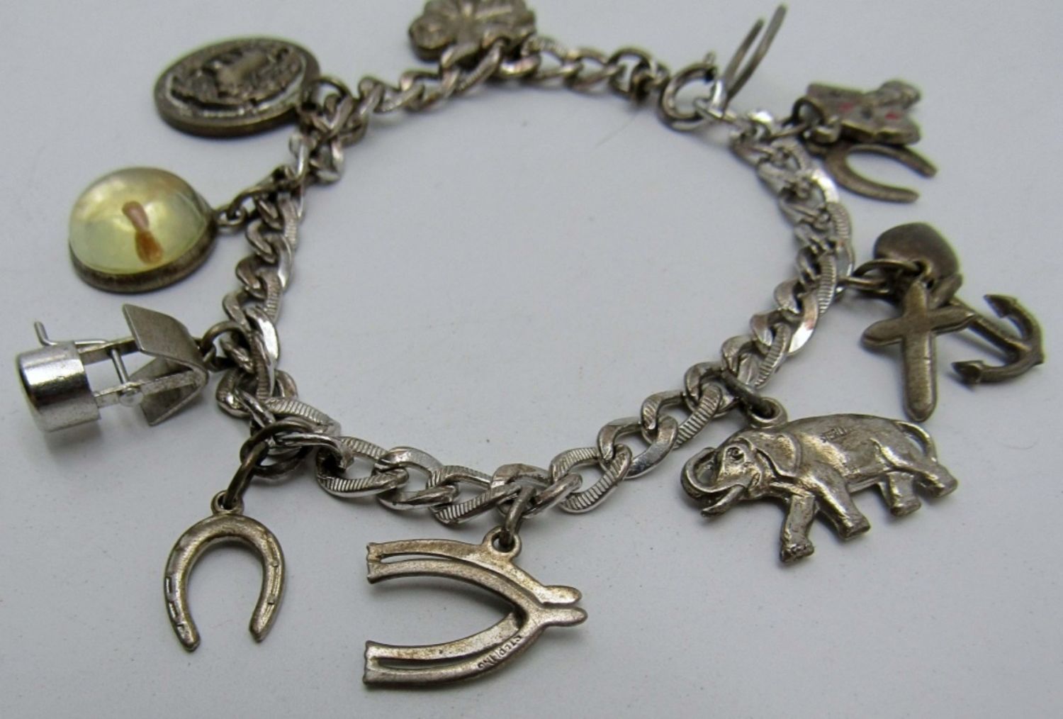 14dwt,7in 13 charms some charms include horse shoes, playing cards, a well,elephant etc.., all marked charms and chain sterling