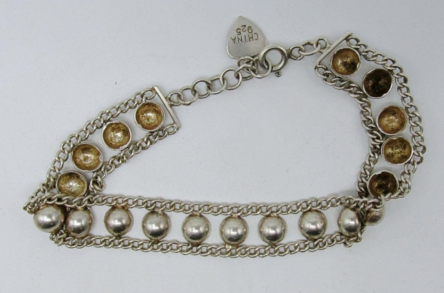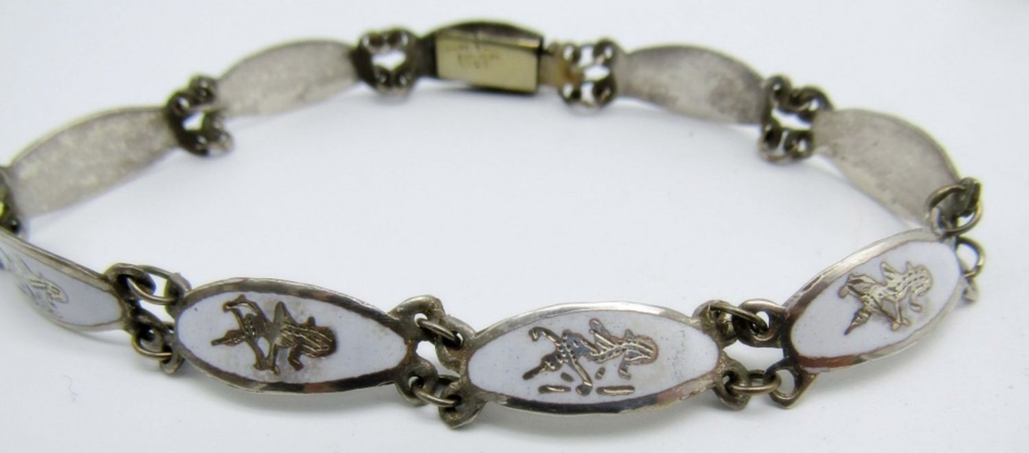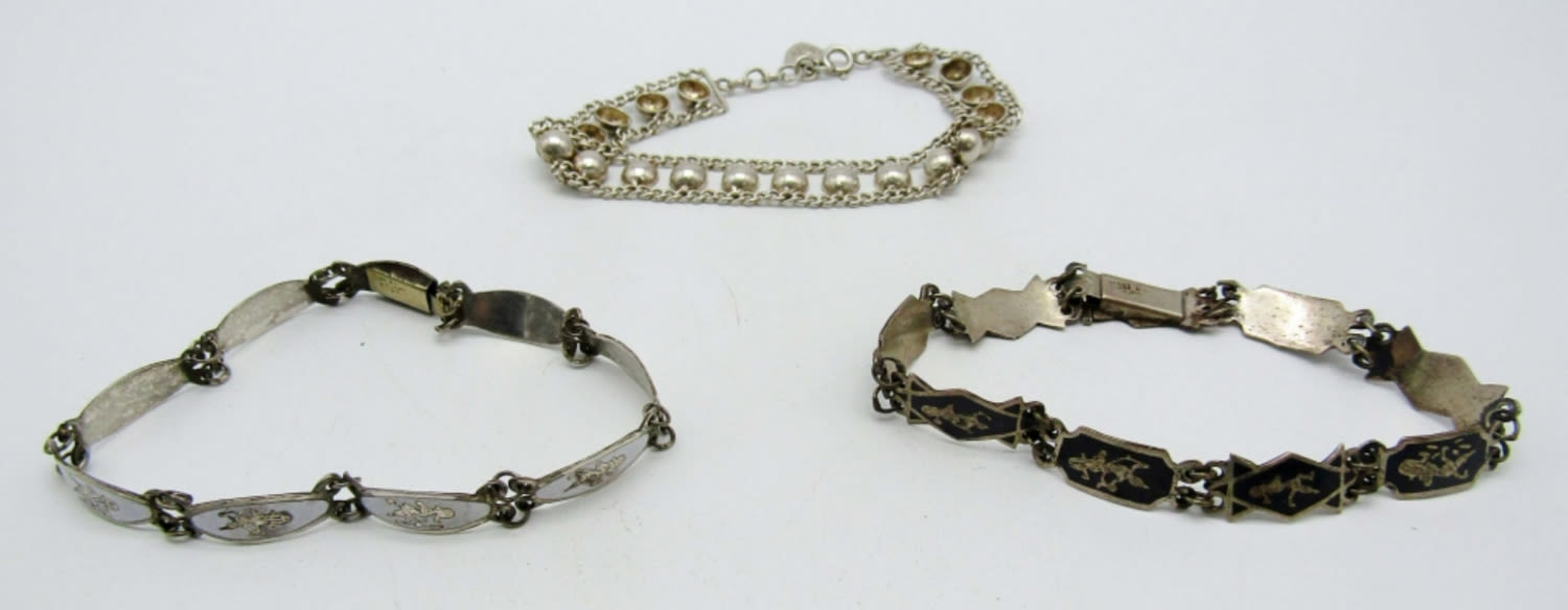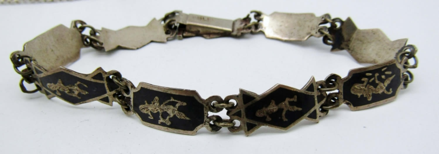 16dwt, 2 siam bracelets one has a black background the other a white both 7 1/2 in, open box clasps, stamped siam sterling on back, sliver bracelet has a chain along both sides with circles all in the middle