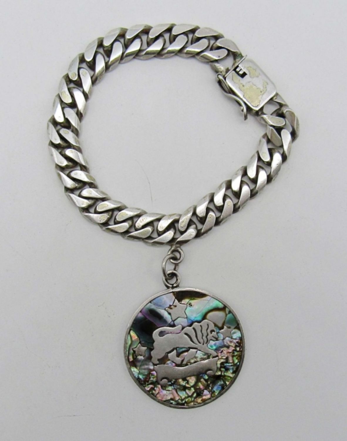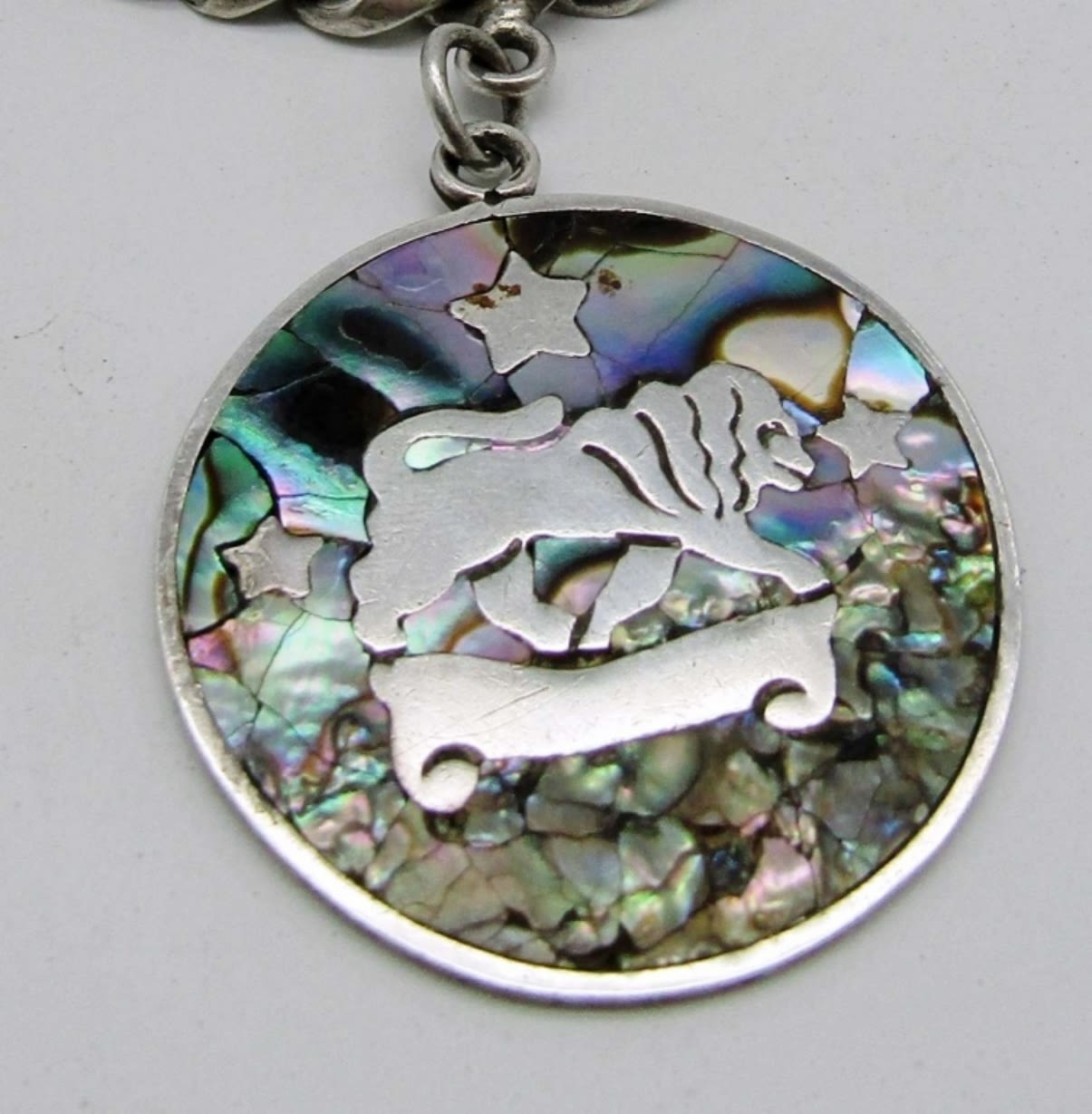 29dwt,8in chain stamped with logo can read and 925 on open box clasp, large circle pendant with abalone stones for the background a lion with starts around it. Stamped with “talleres de los ballesteros