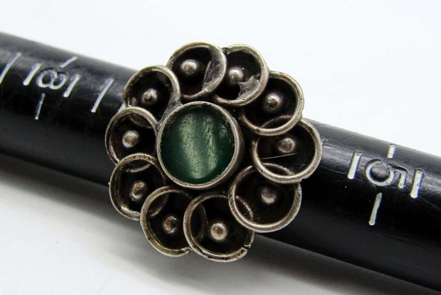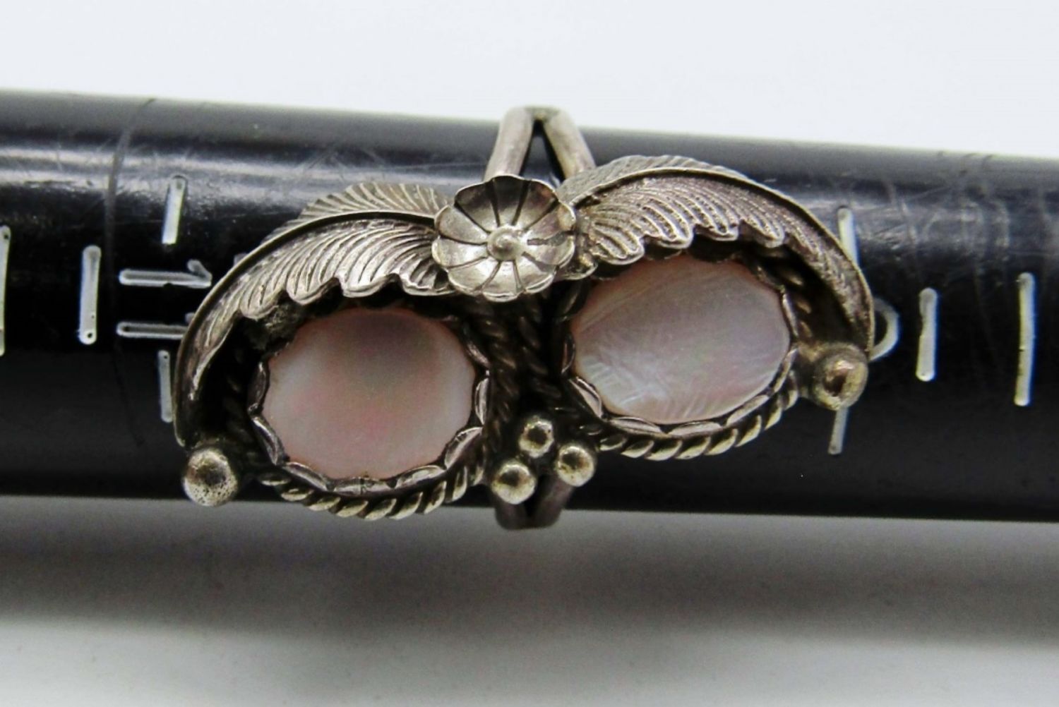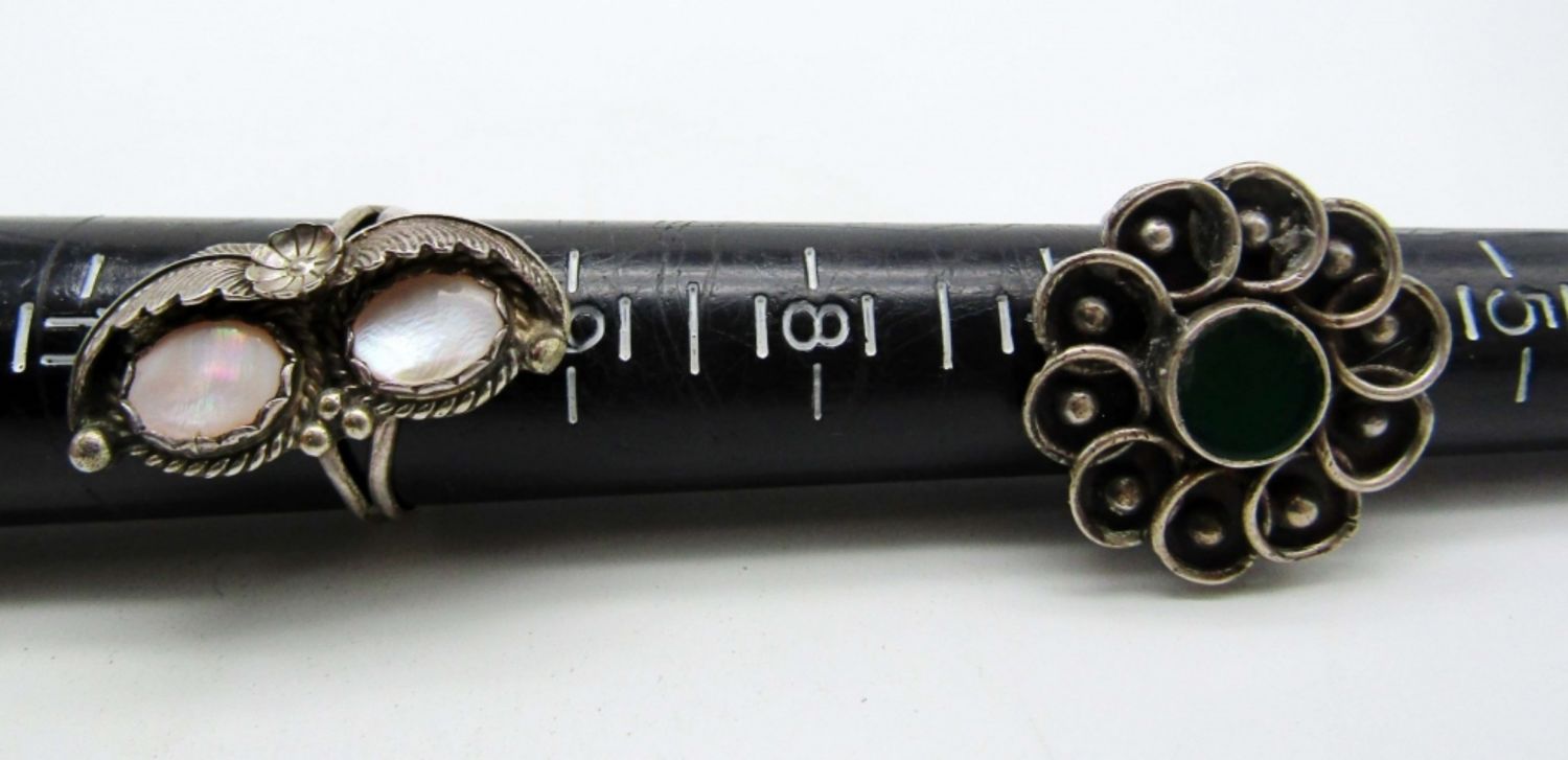 9.2 dwt, size 10 the mother of pearl ring has two leaves along the side on ring, size 7 the flower design ring with a green inlay stone in the middle, stamped 925