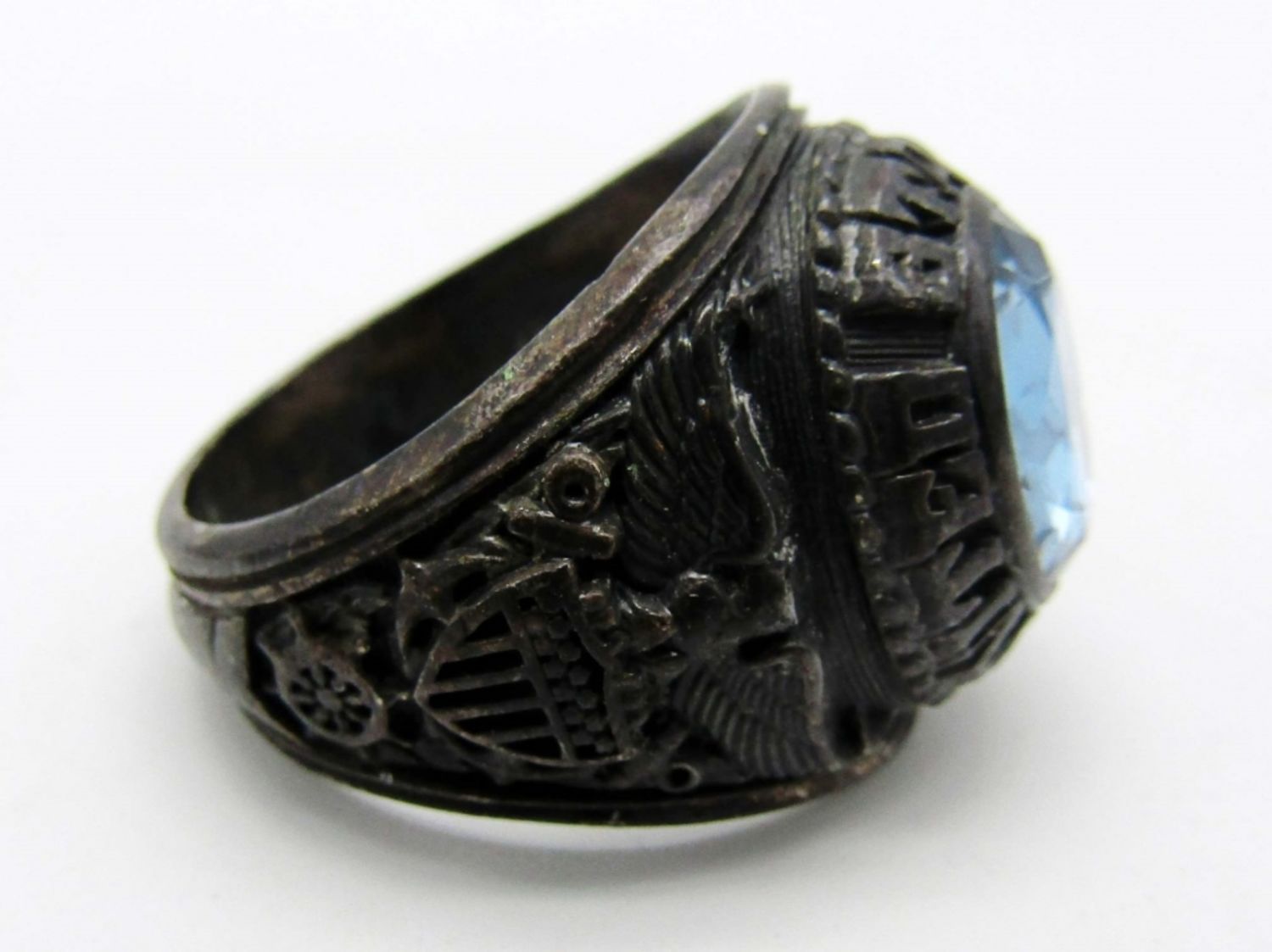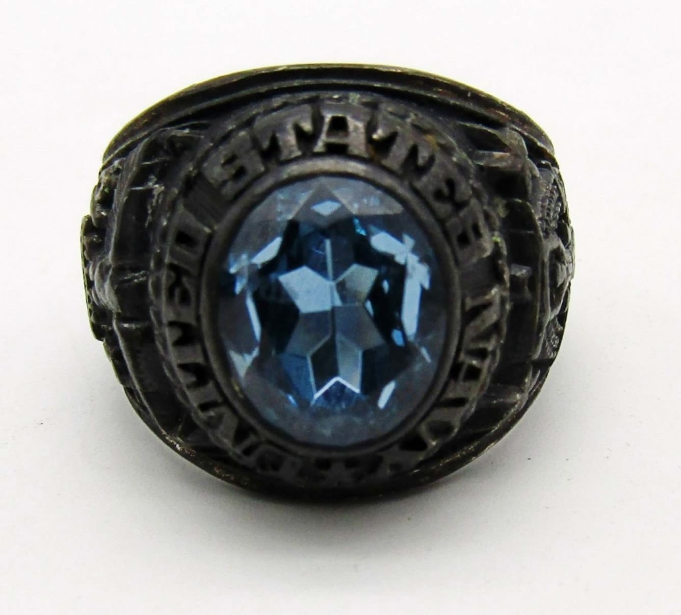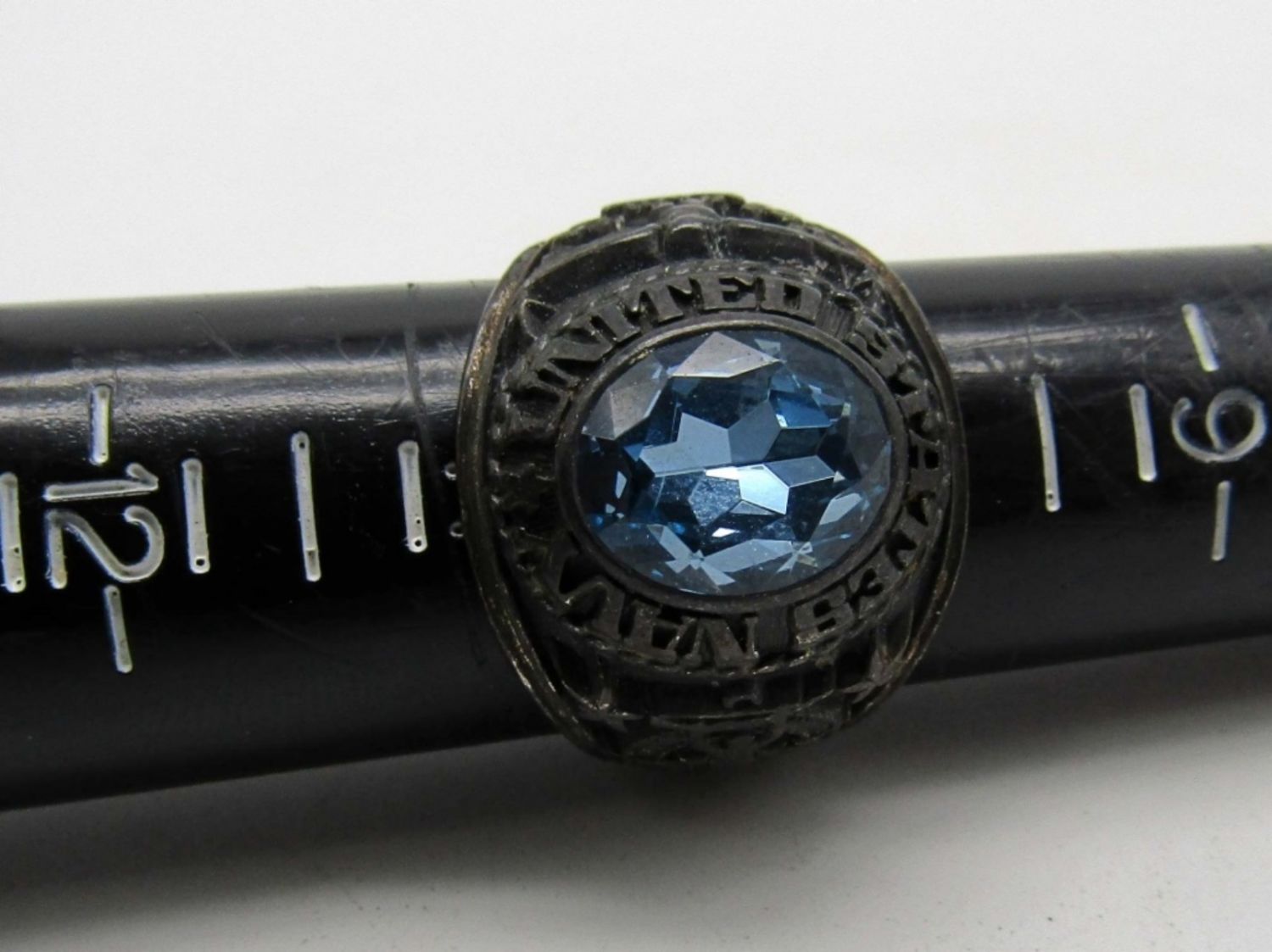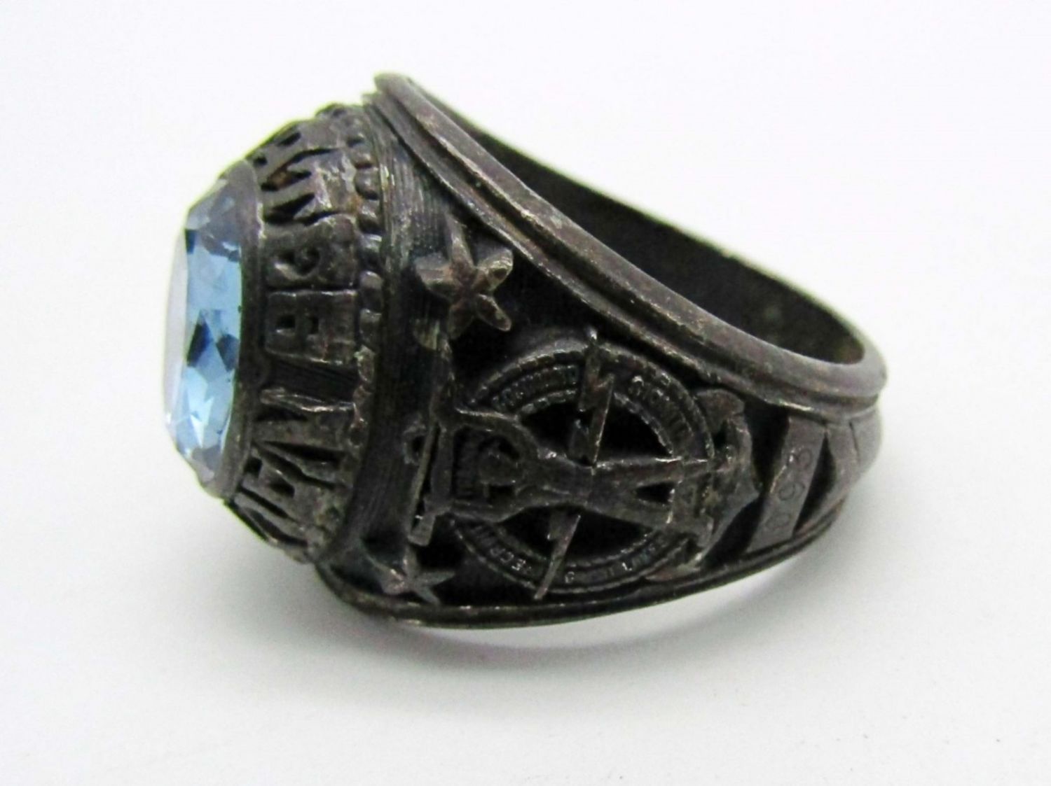 12dwt, size 11 with a topaz stone in the middle, stamped josten’s sterling, initials G.A.B 75
