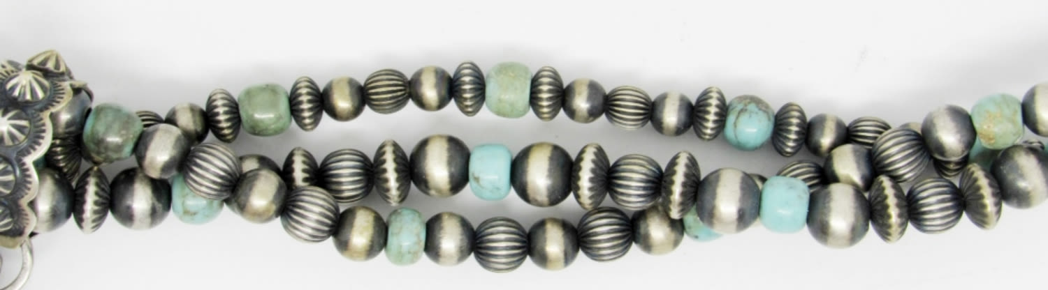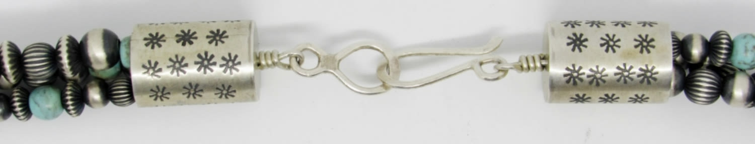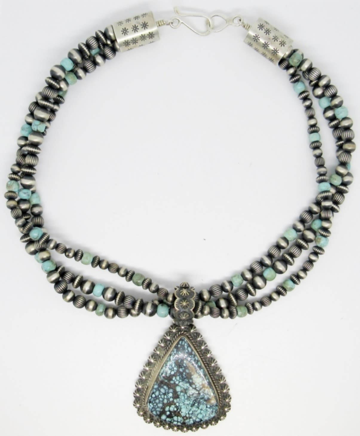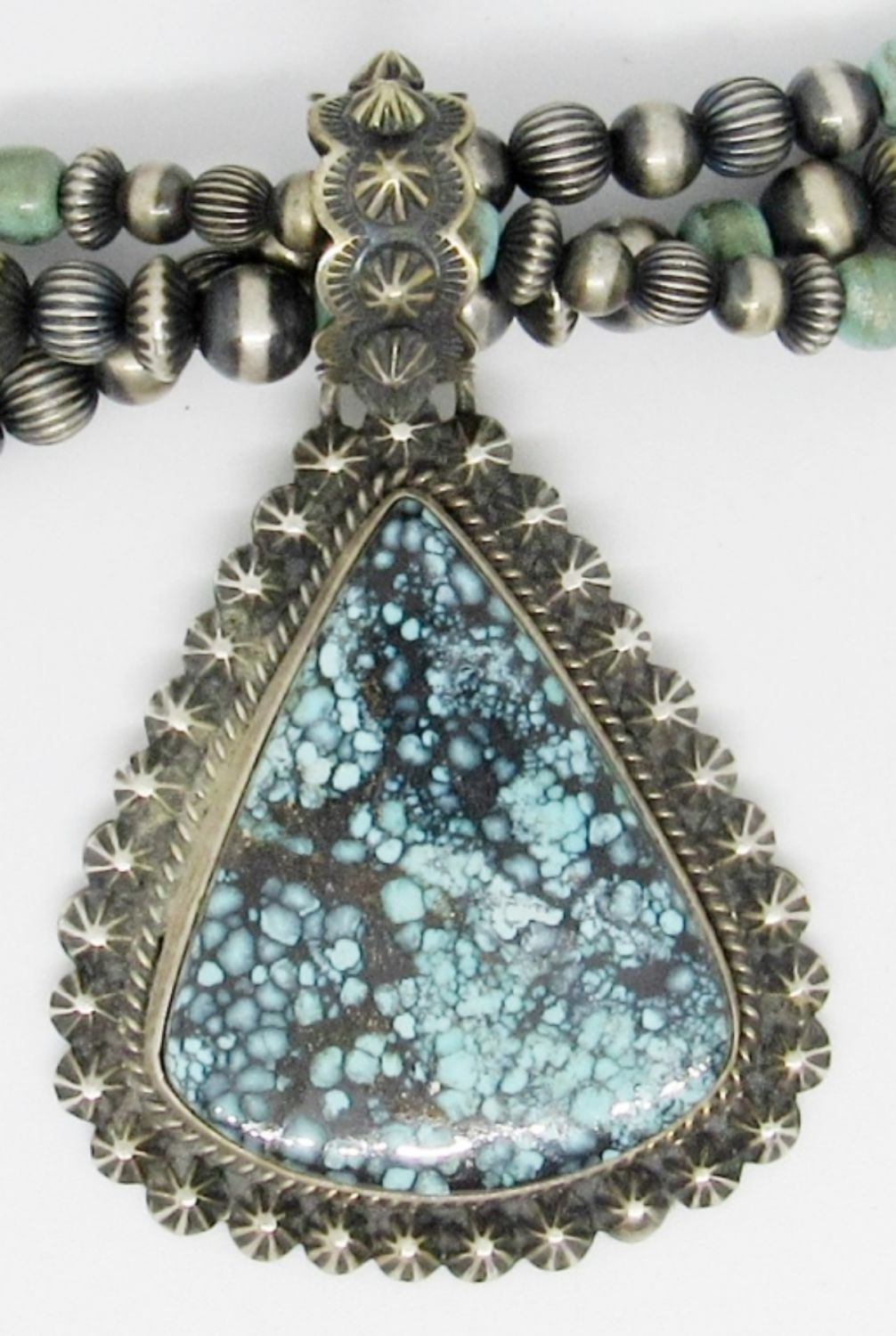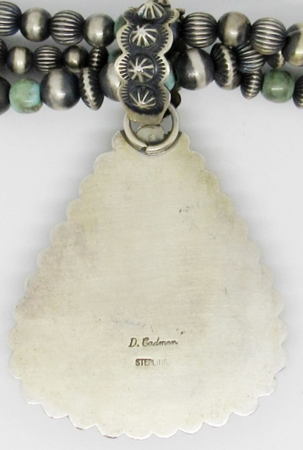 64.6dwt, 18in in chain length,sliver and turquoise beading along the necklace, marked 925 at the hook clasp, Large Turquoise pendant stamped with the sterling and the D. CADMAN marking