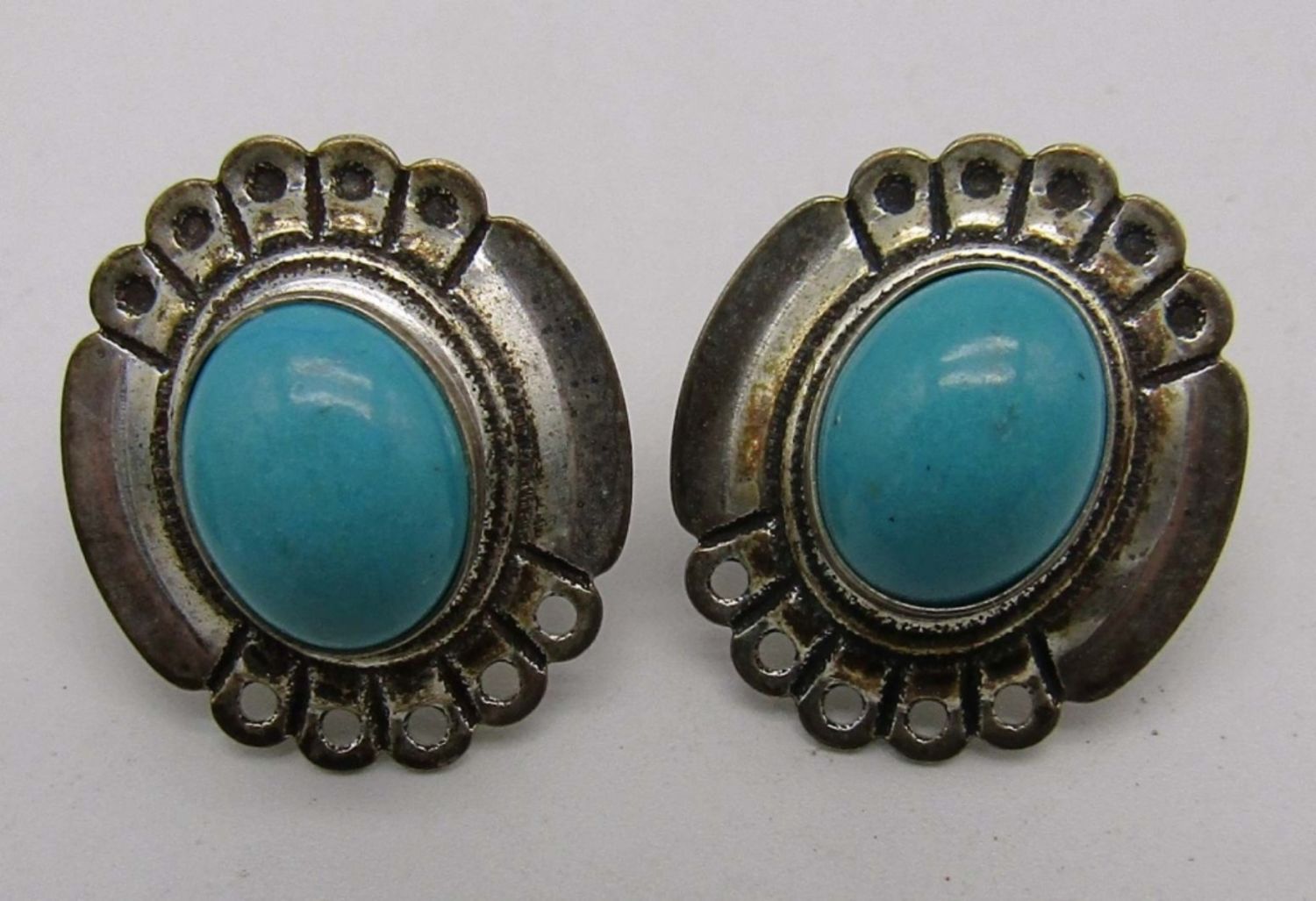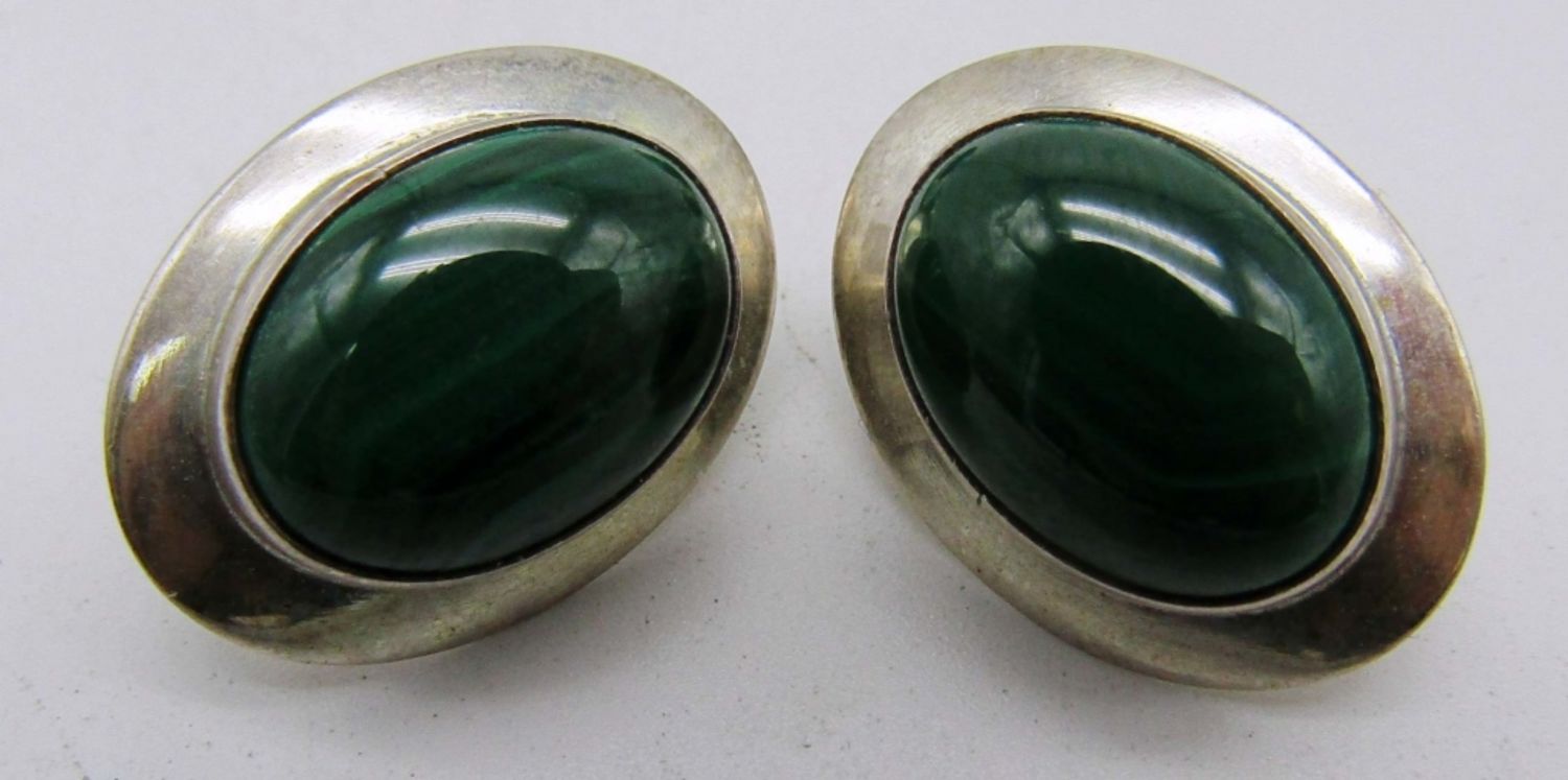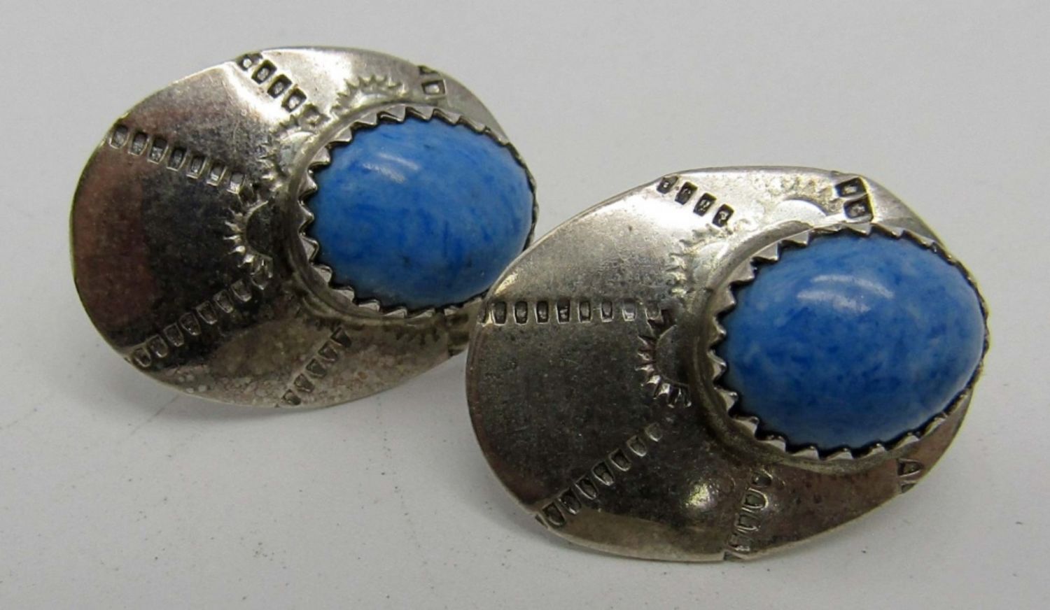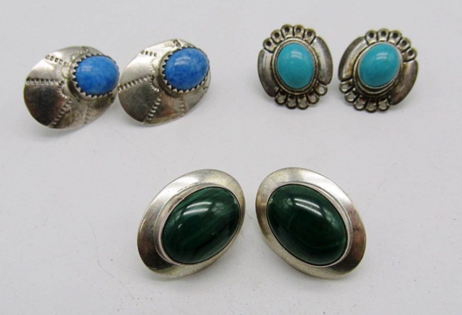 7.6dwt, one jade pair stamped sterling on back, one pair turquoise stamped sterling, third pair blue stone (missing backings)