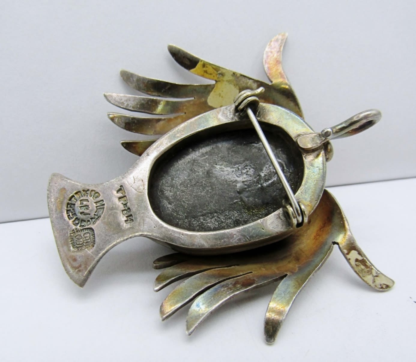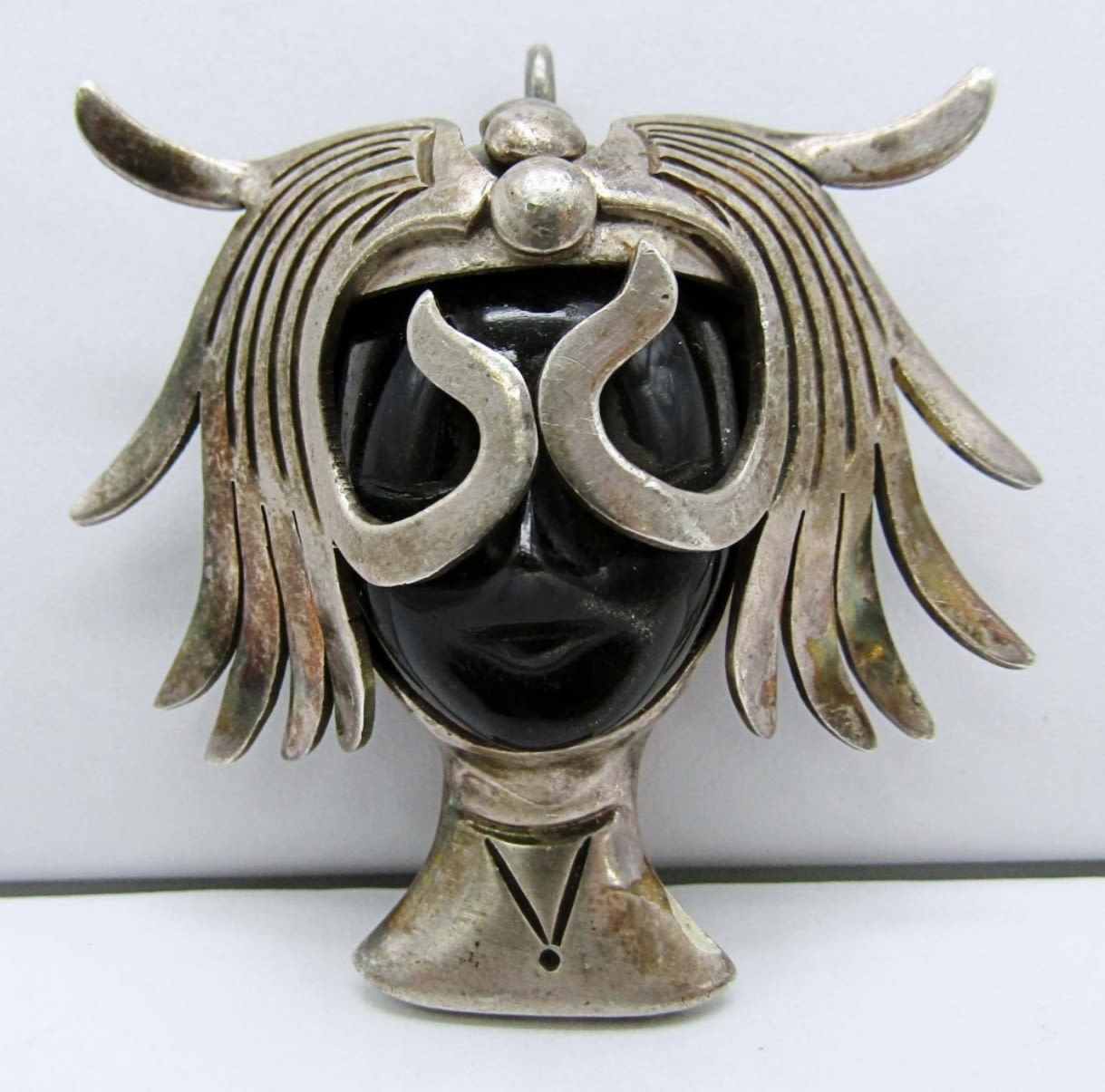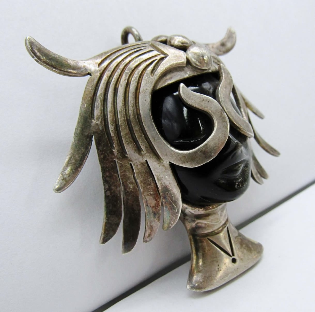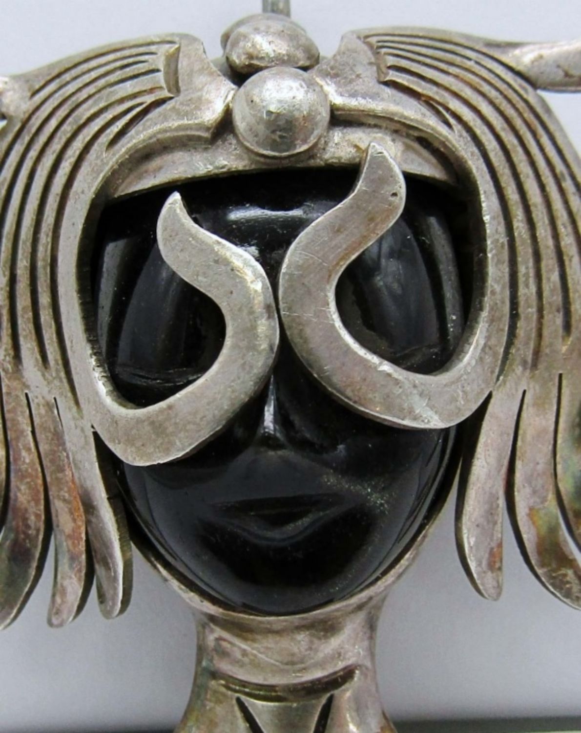 28.5dwt, craved face into a Hypersthene stone with sterling as the neck and the head piece, stamped tp-34 Taxco mexico 925 LPJ, Could be used for a brooch or a pendant
