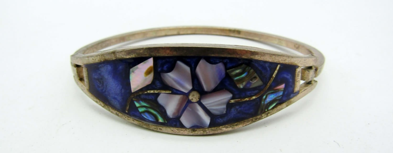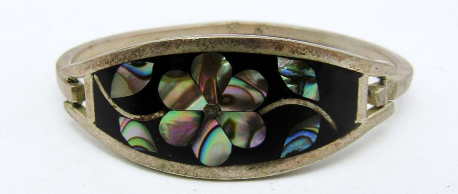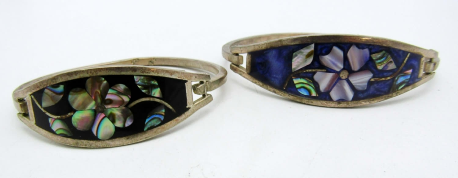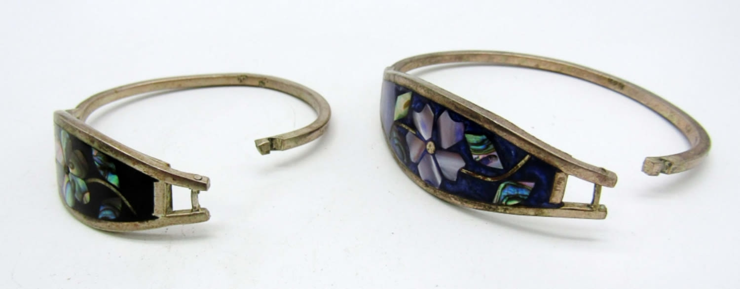 17dwt, one adult size about 6 1/2in all around, has inlay stones to make up a flower scene, stamped mexico sterling, child size about 5 1/2in around, with black onyx and abalone inlay make up the flower scene,