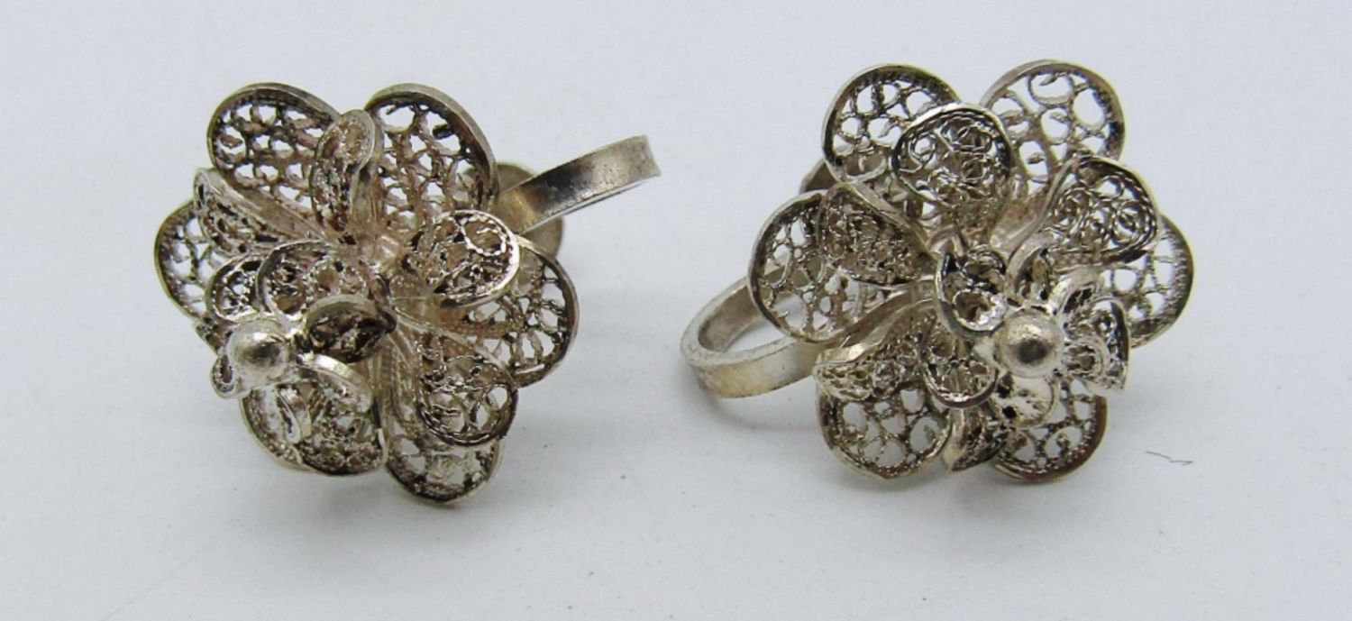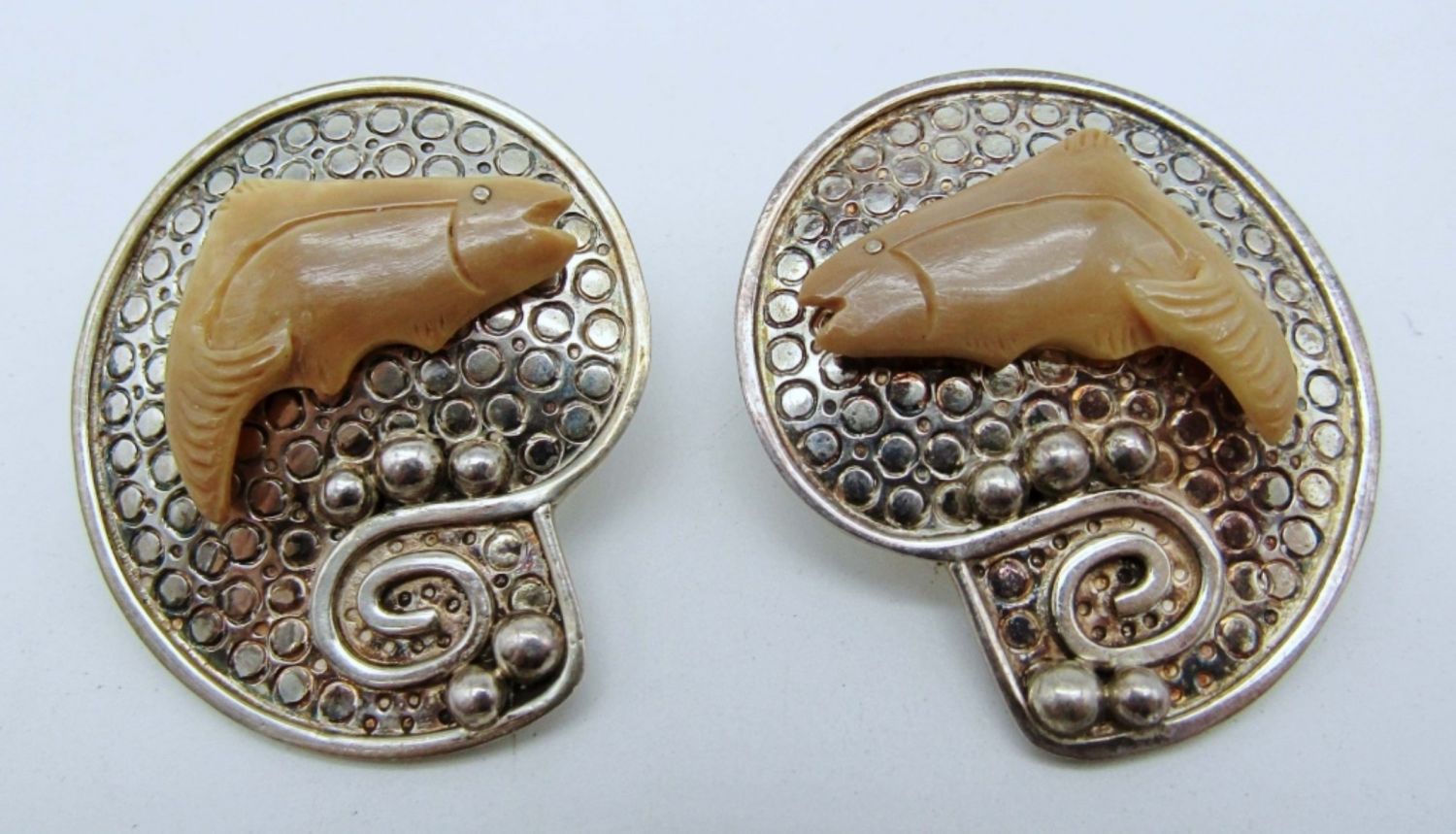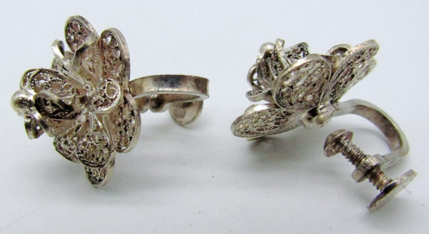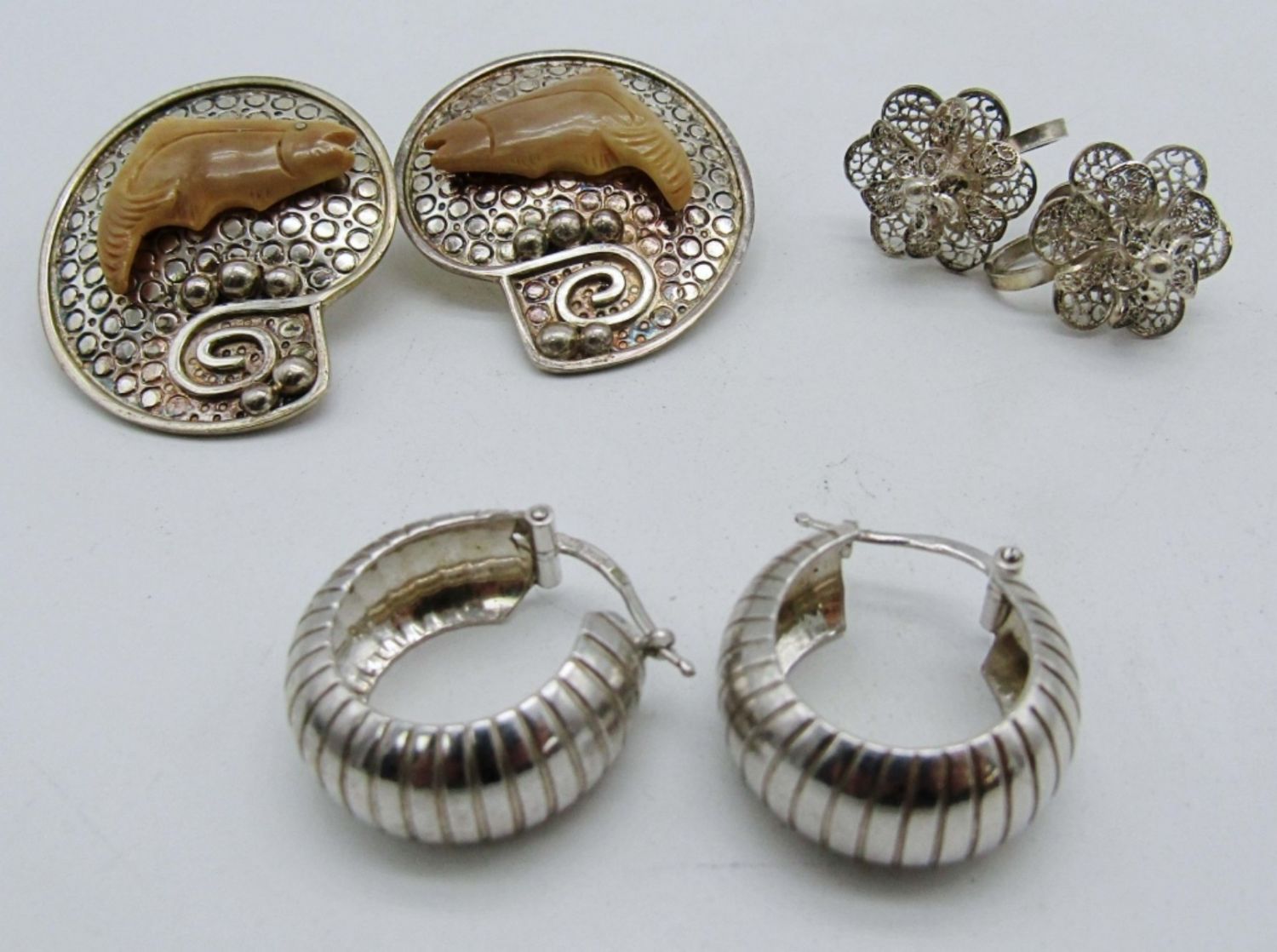 16.7dwt, shell shape with a fish on it, pirced stamped Zealandia 925 on back, 1 pair of huggies stamped 925, last pair Flower vintage screw backs