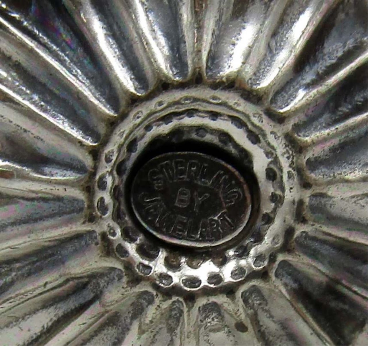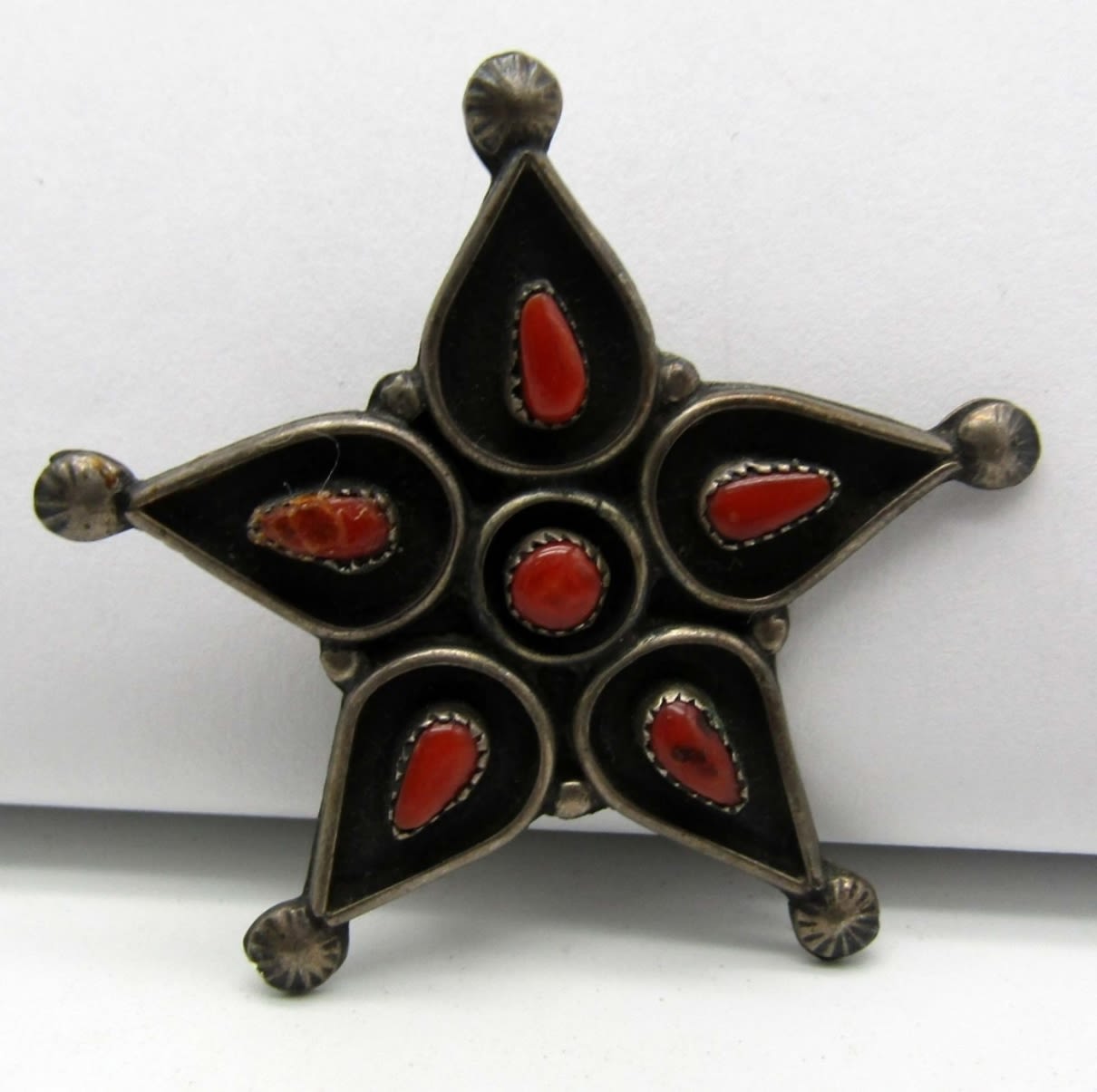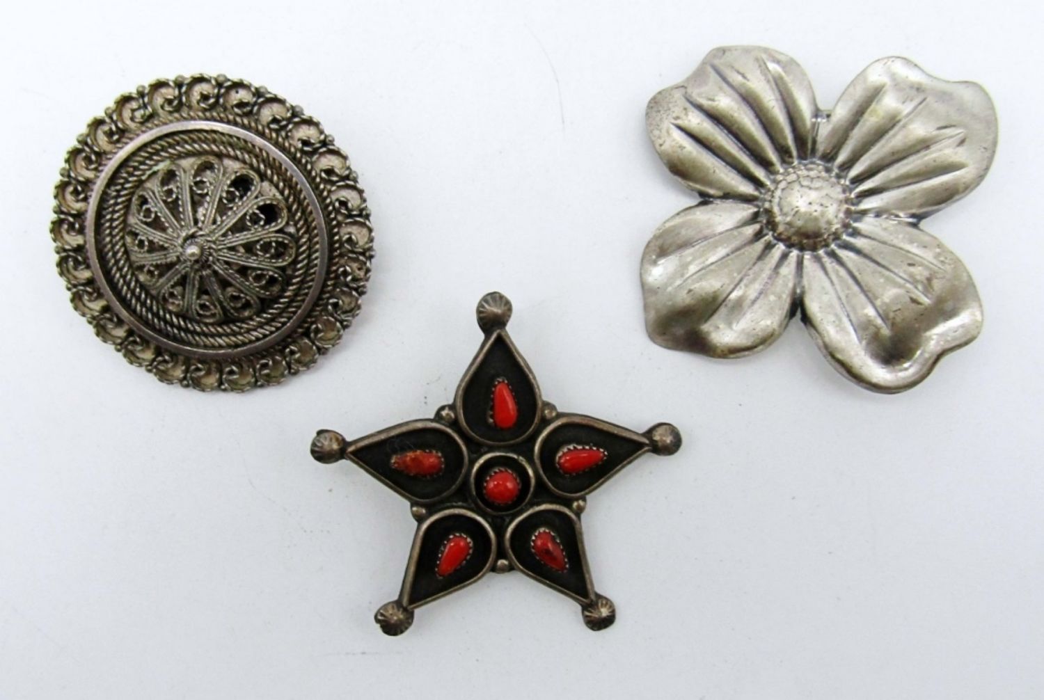 16.3dwt, all pins at under 2in, a star with coral stones, a flower pin stamped sterling by jewelart, a cricle lace stamped but can read it out