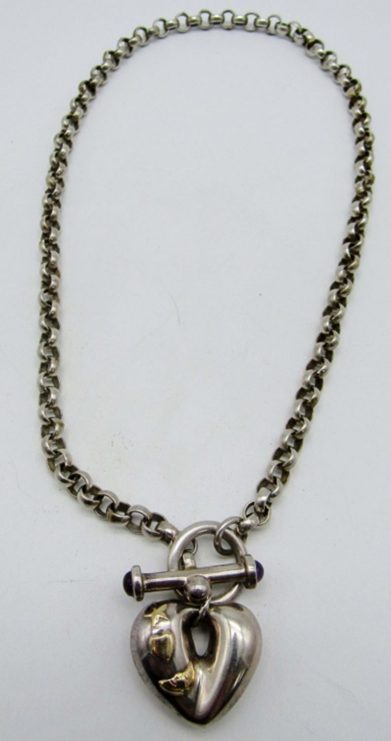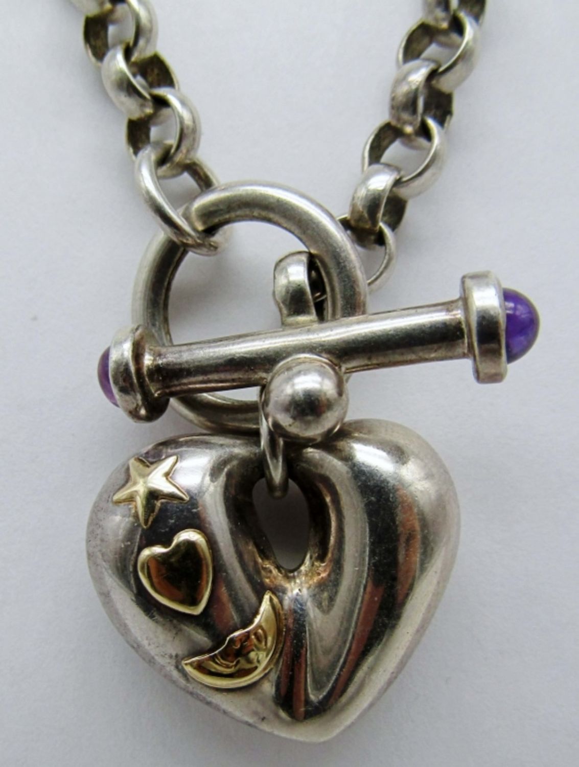 30dwt, 20in, toggle clasp, Heart pendant at 18k fill of a heart,moon, and star, stamped on back with 925 and 18k