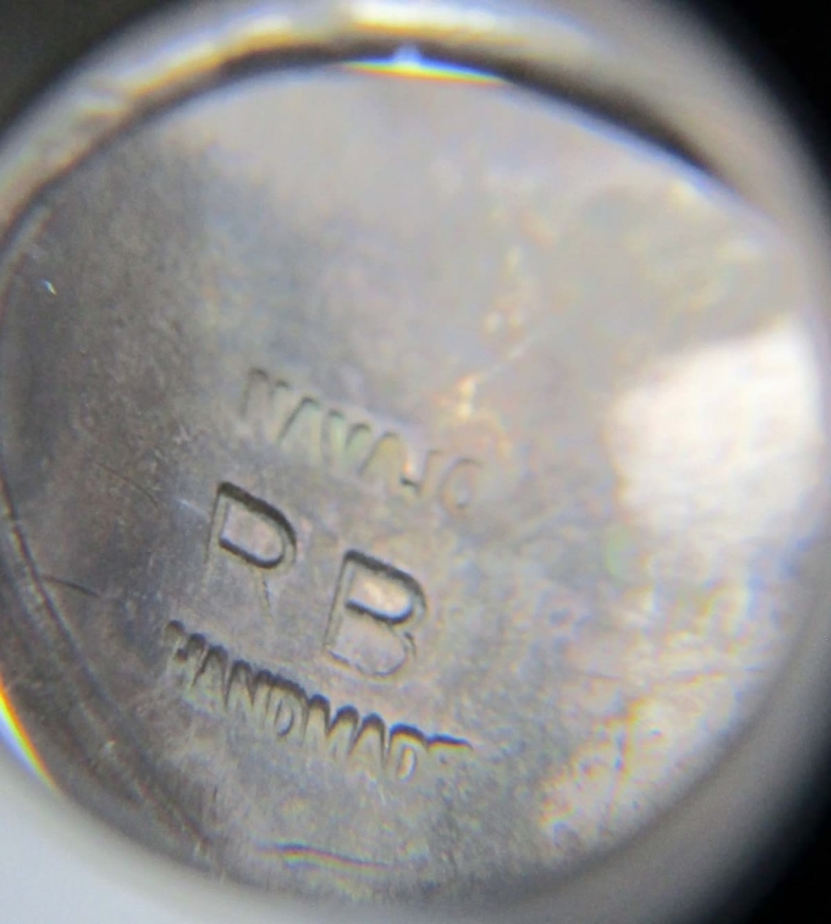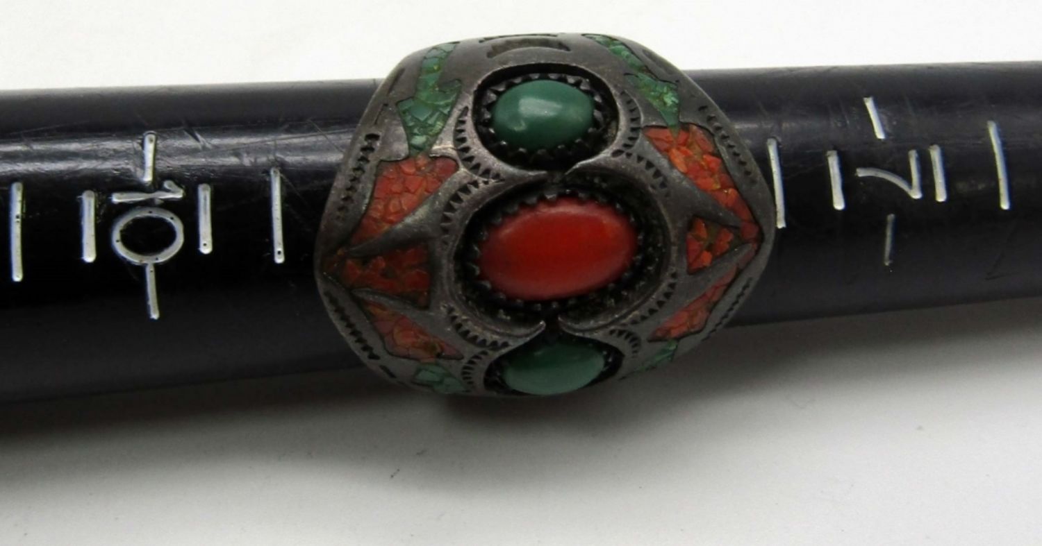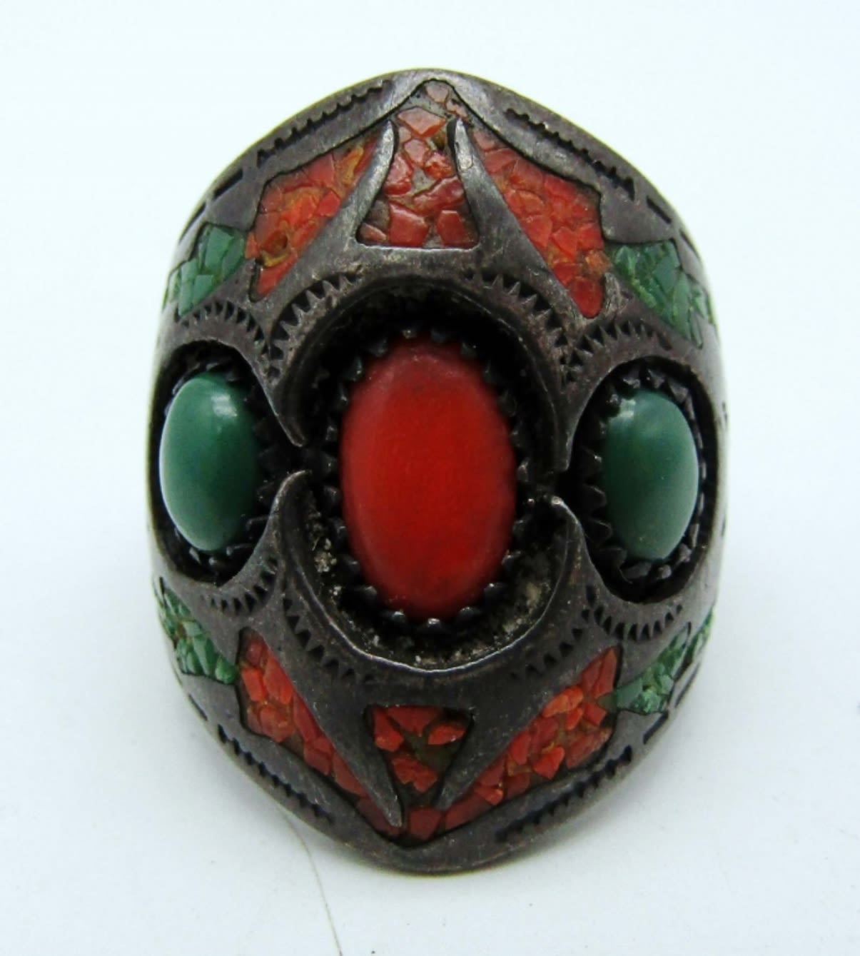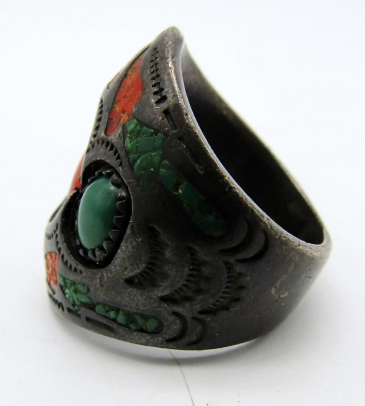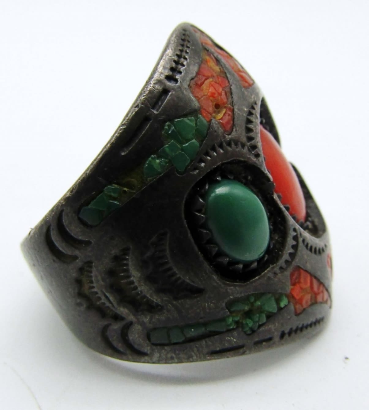 10dwt, size 8 1/2 has crushed coral and jade stones, stamped navajo RB handmand