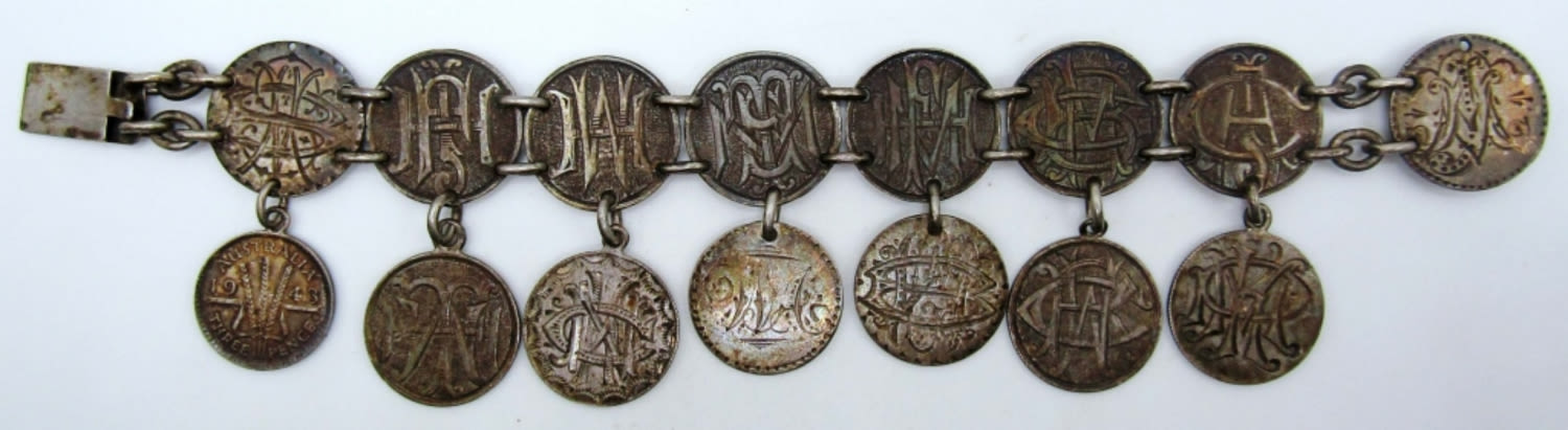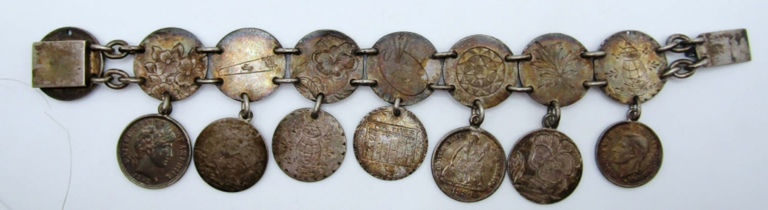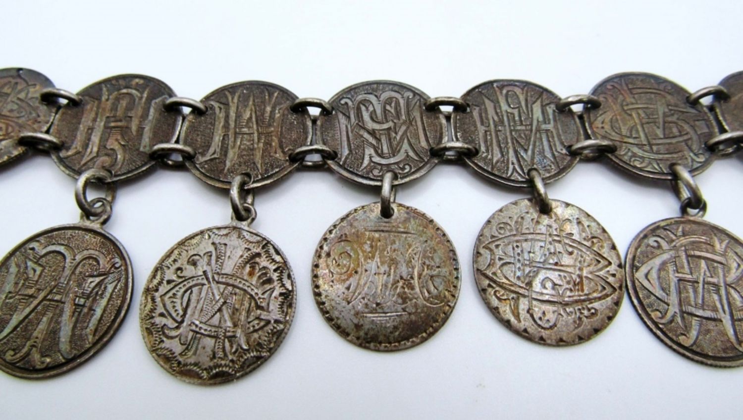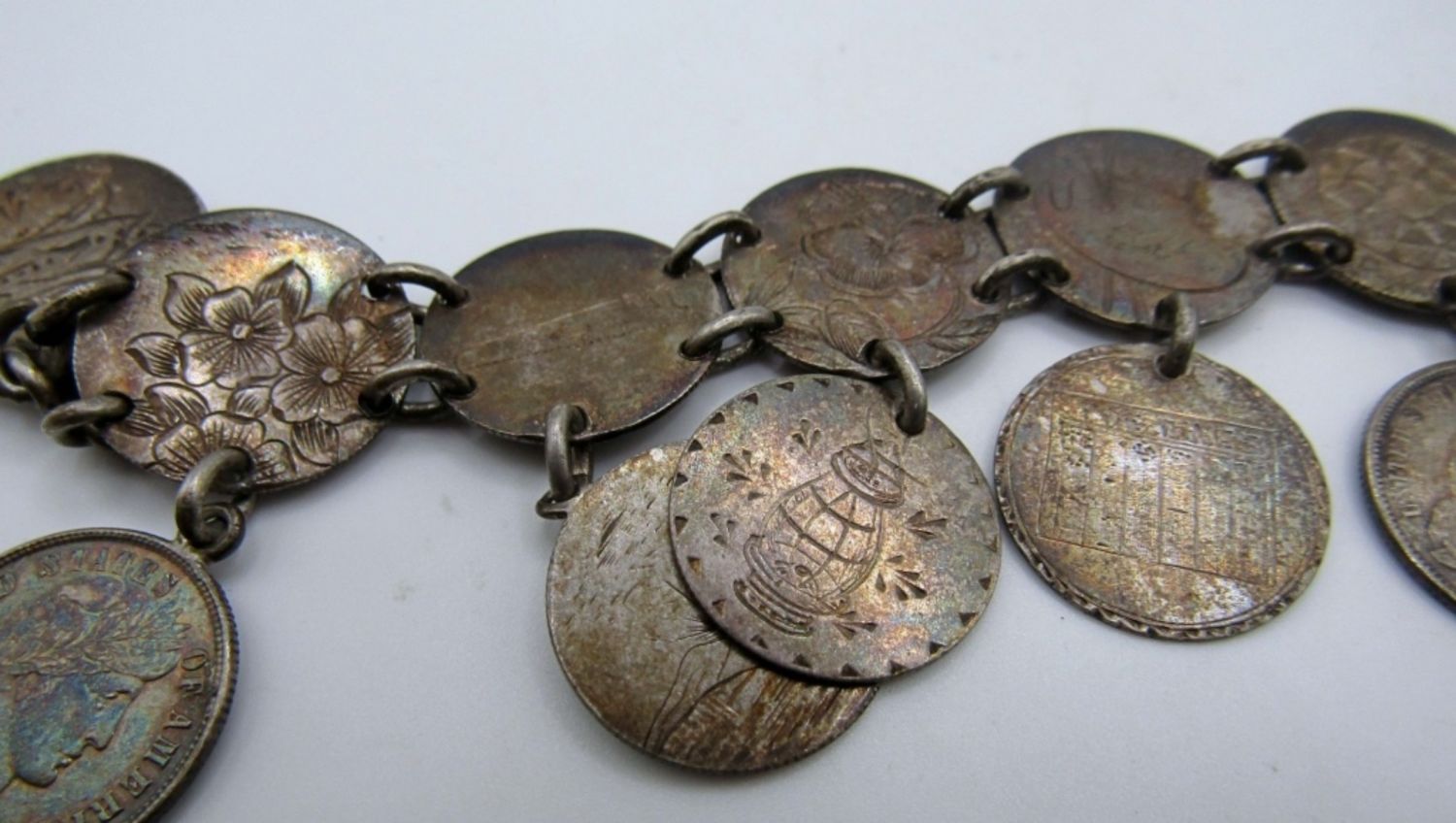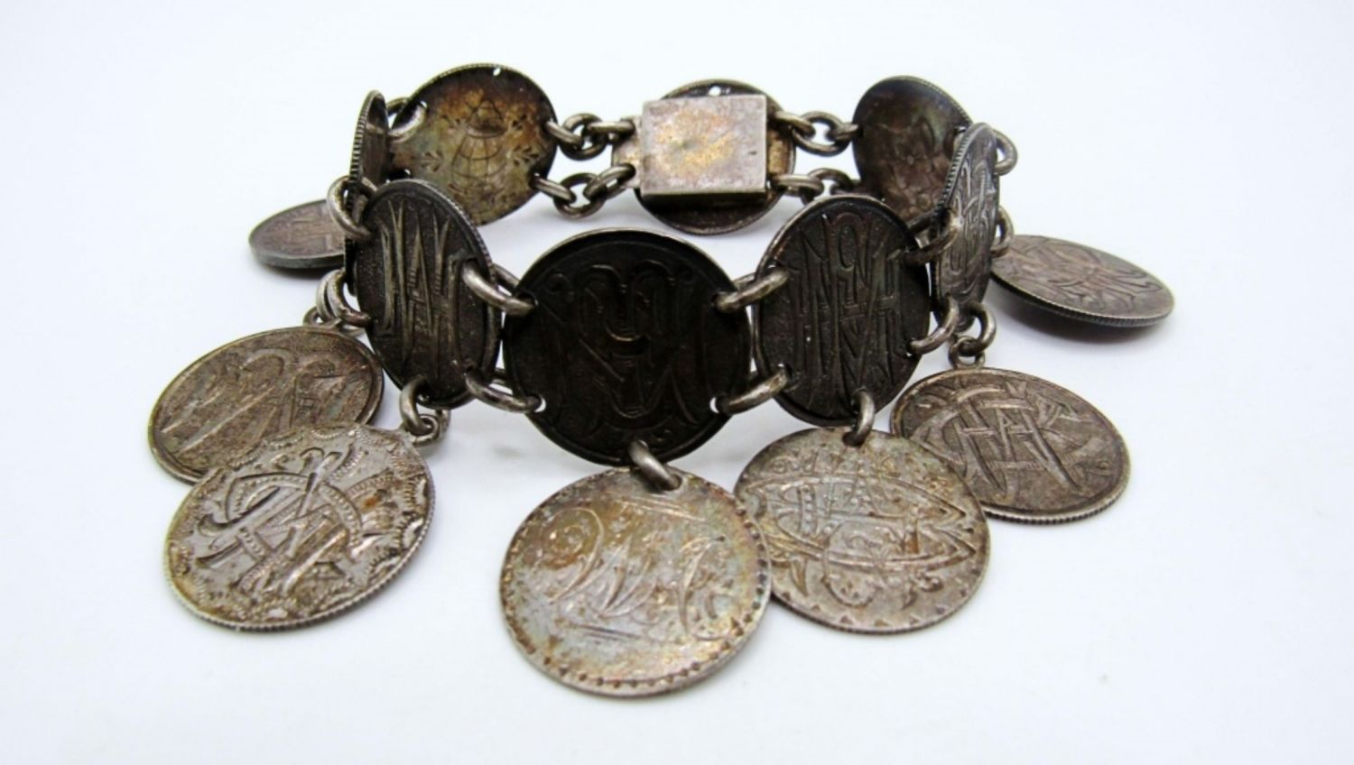 20.8dwt, 7in in length with opened, open box clasp, has different stamps like a charm bracelet