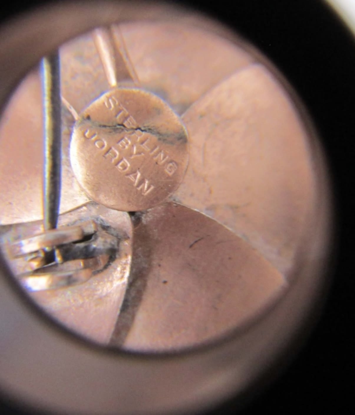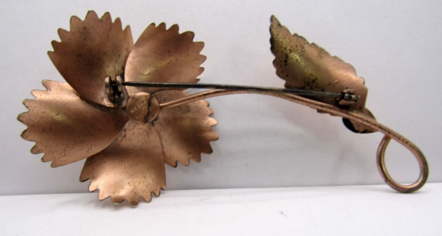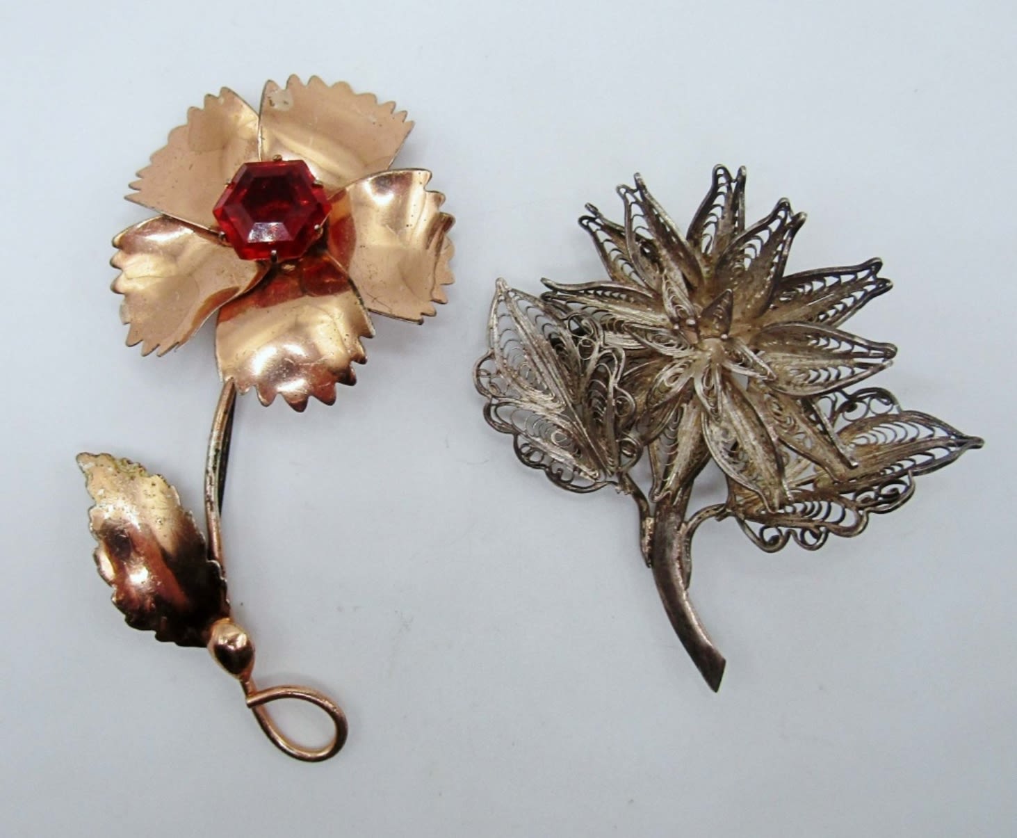 12.5dwt, gold tone with red stone in the middle of flower, stamped Sterling By Jordan about 3in, second is about 2in stamped sterling sliver