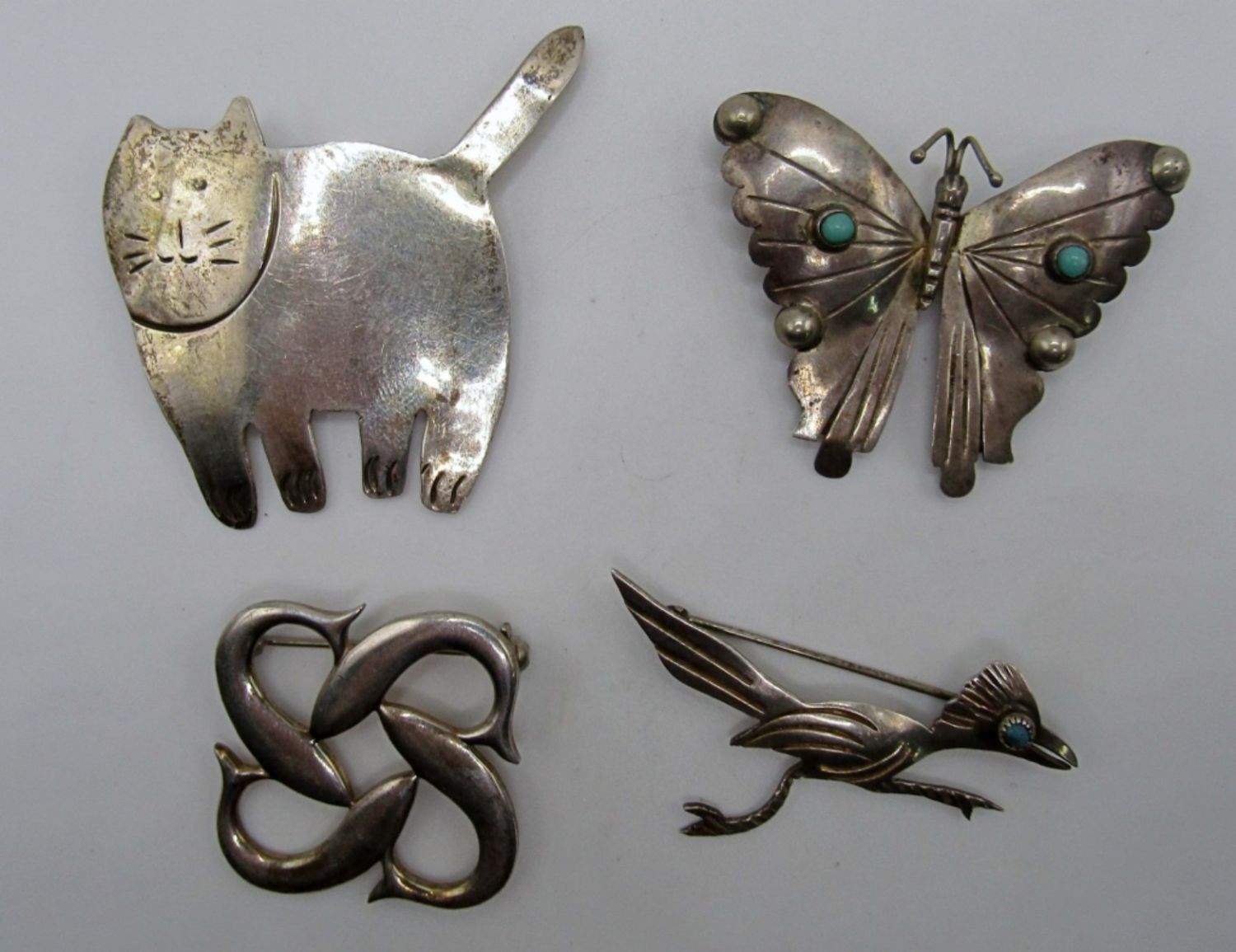 15dwt,a bird, fishes stamped sterling, a cat stemped mexico 925 and a butterfly with turquoise beads stamped mexico 925