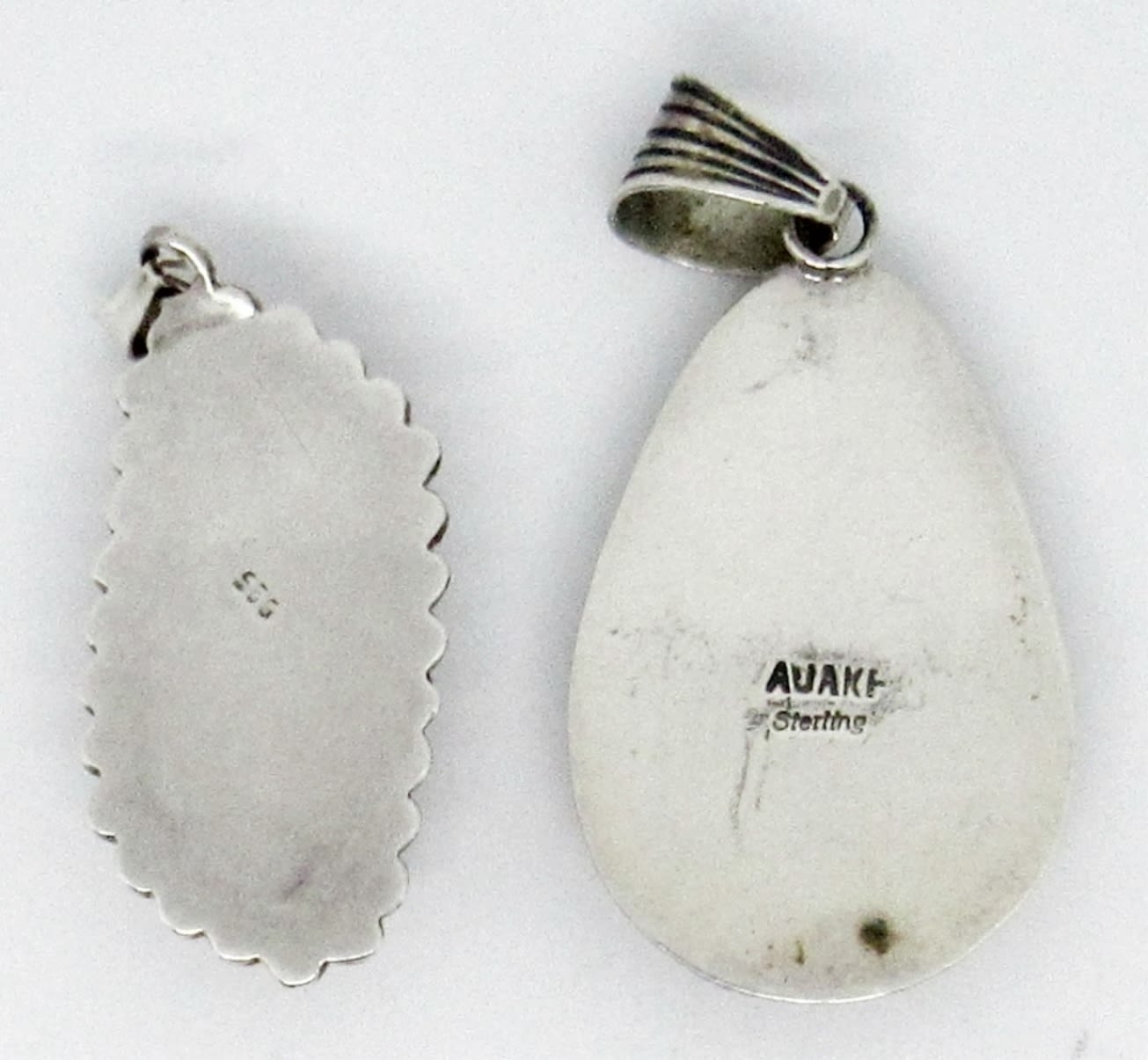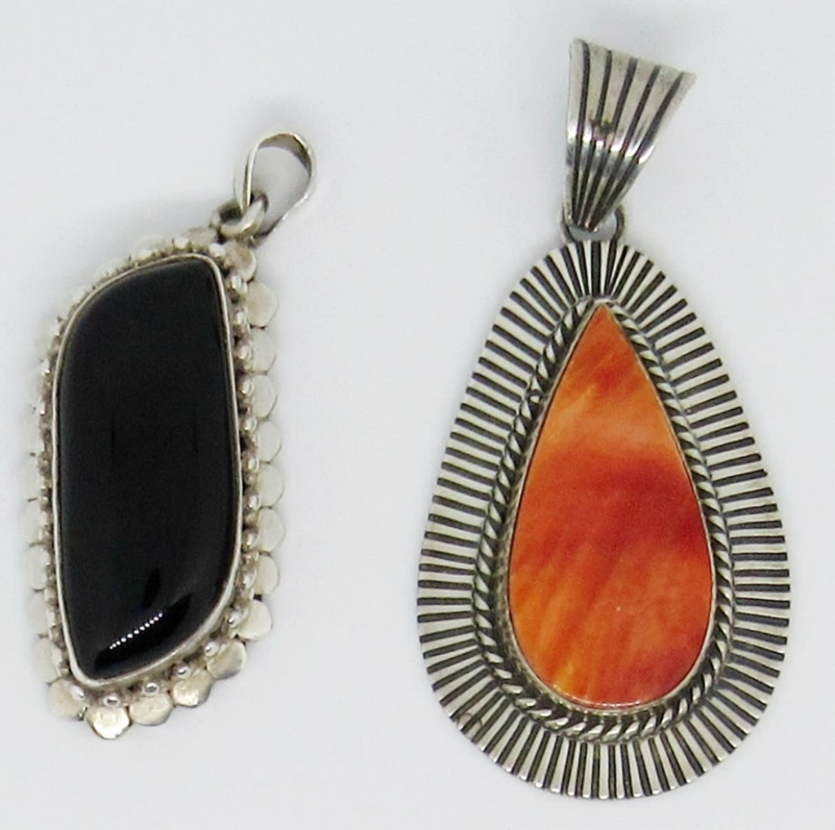 24.8dwt, 1 is a black onyx stone with a sterling deisgn around, stamped 925 on back, 1 tear drop shape orange natural stone pendant, stamped with AUAKE