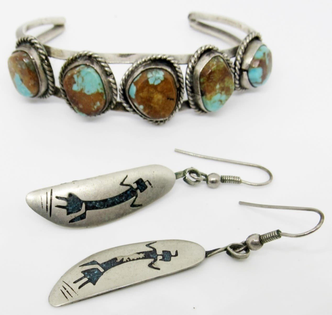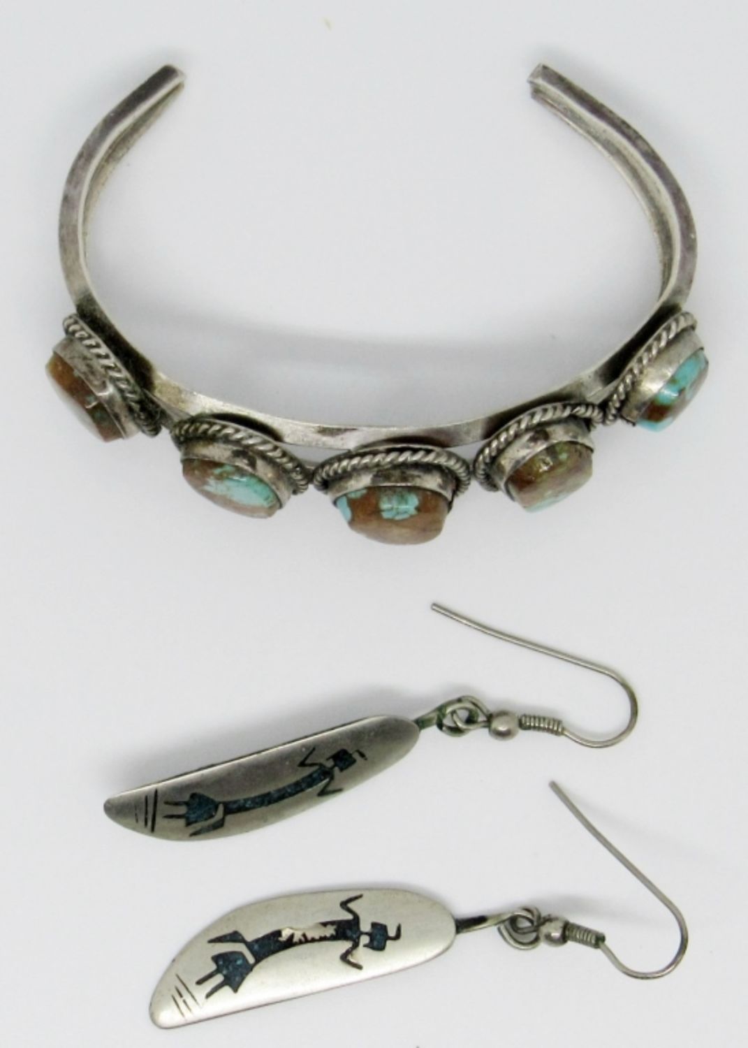 14.7dwt, earrings has a dancing zuni symbol on them, the cuff bracelet has 5 turquoise stones along it, 6in with gap