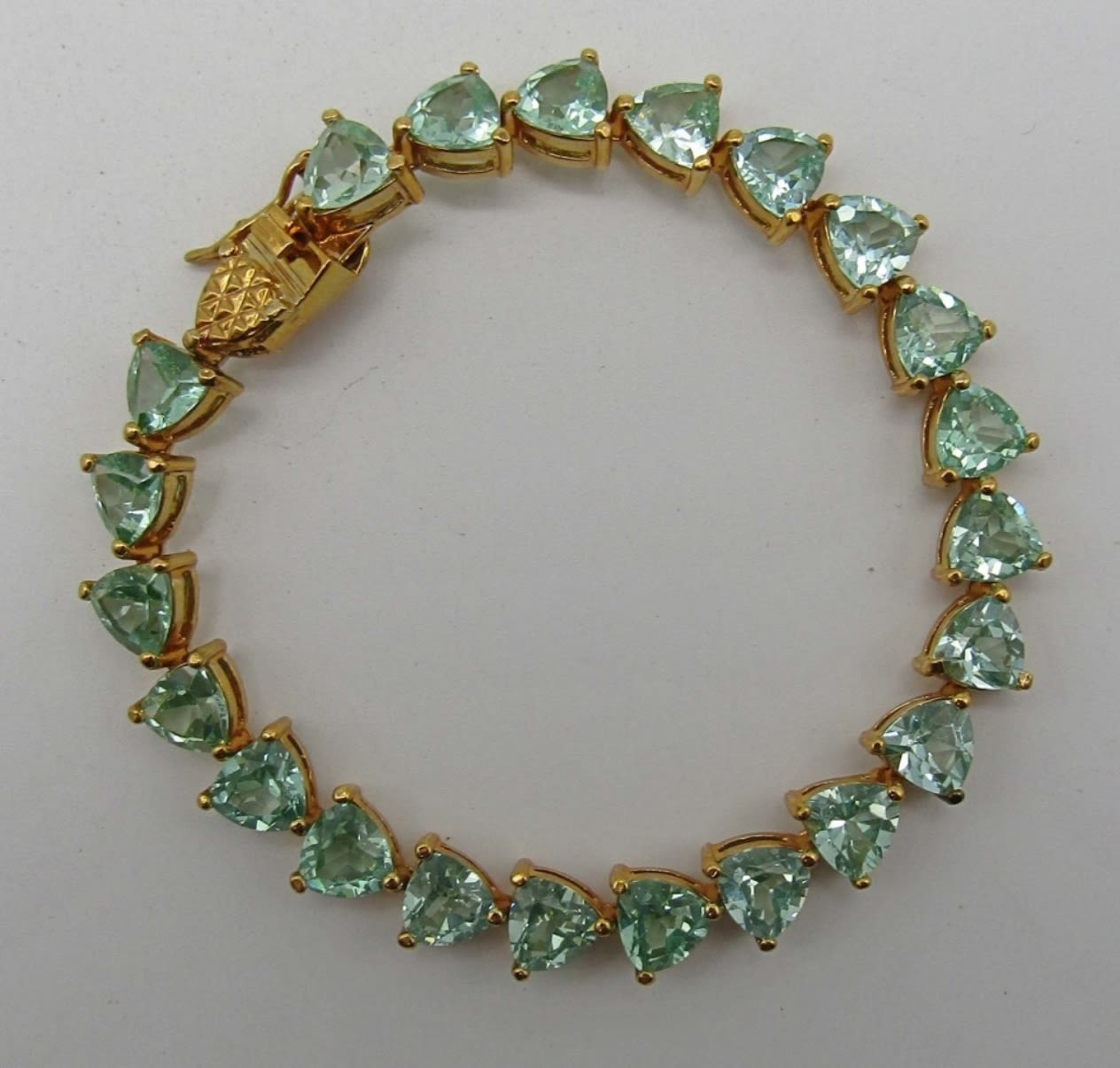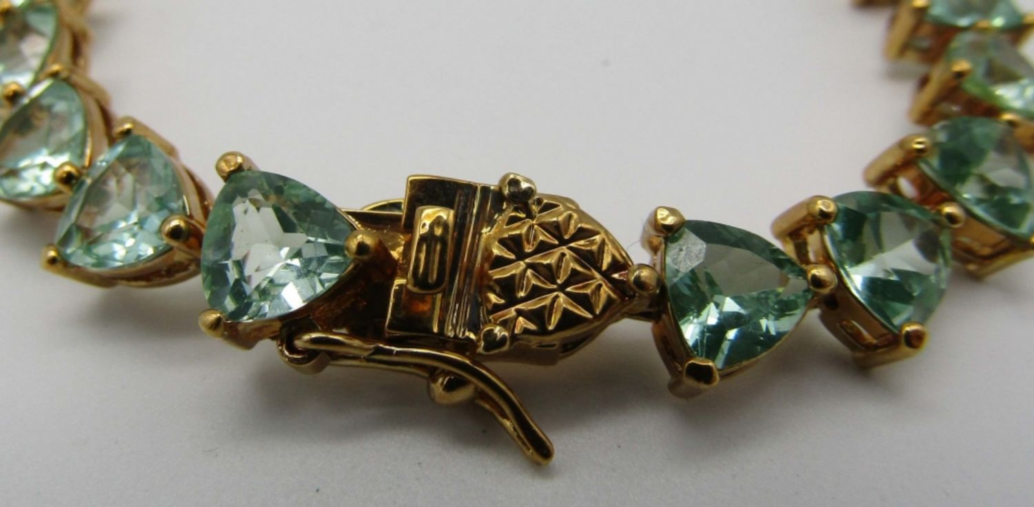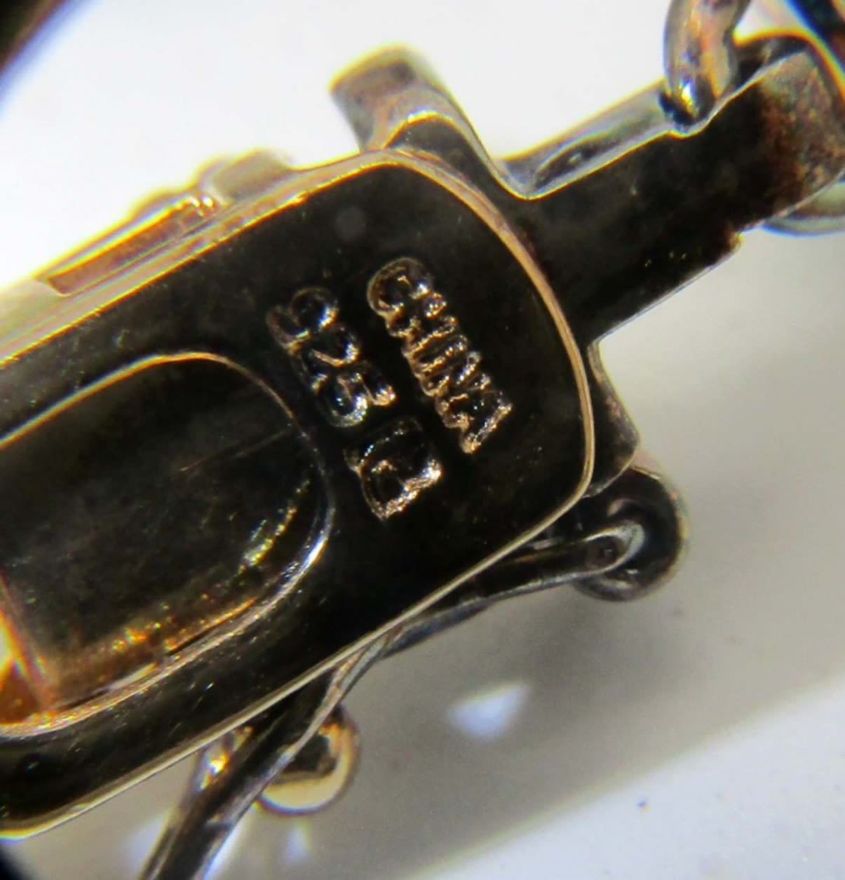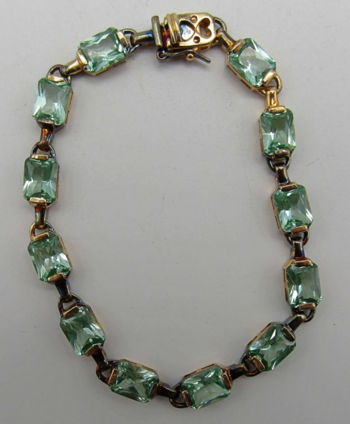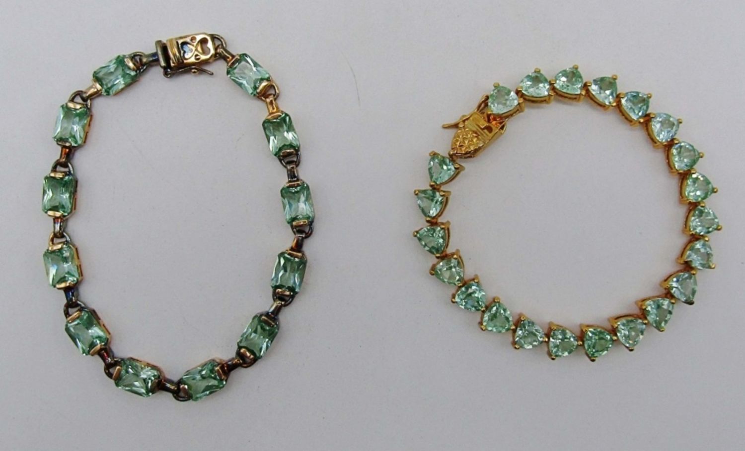 18.8dwt, gold filled both ,green square stone all around 8in in length , stamped with 925, second is 7in in length stamped with 925 w/, both have a open box clasp