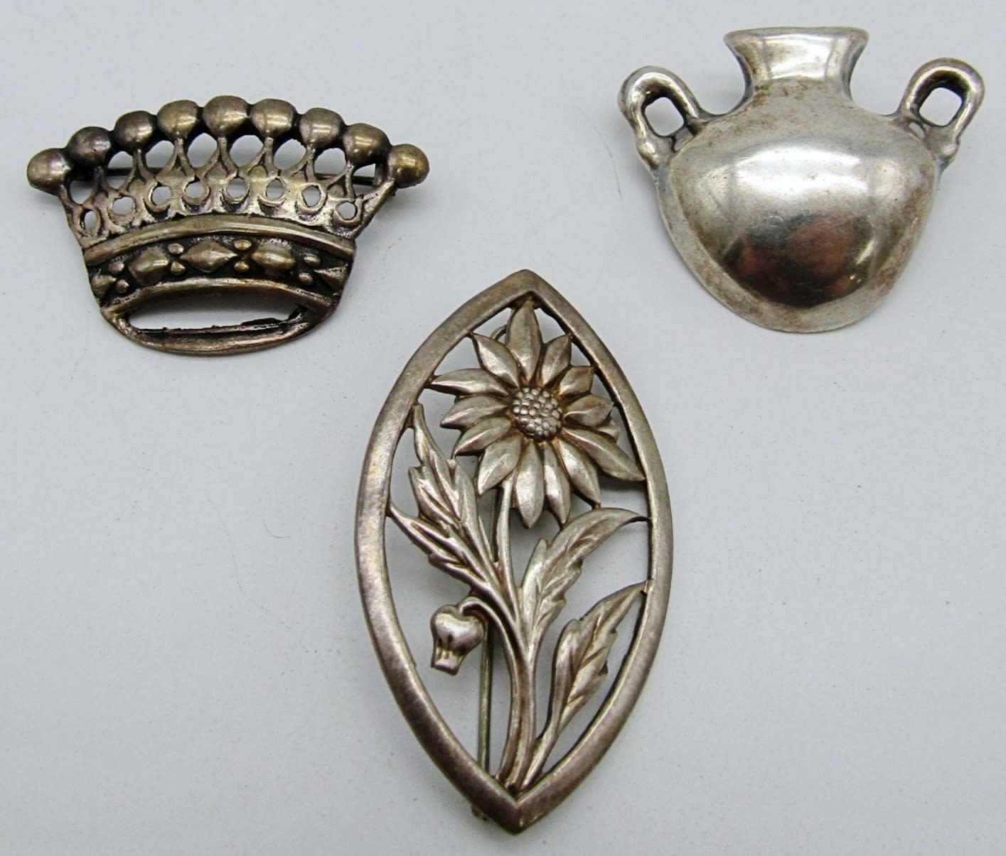 14.8dwt, all about 2in in length, crown, and vase are pins, Sunflower pin is also a pendant, all marked sterling on the back,