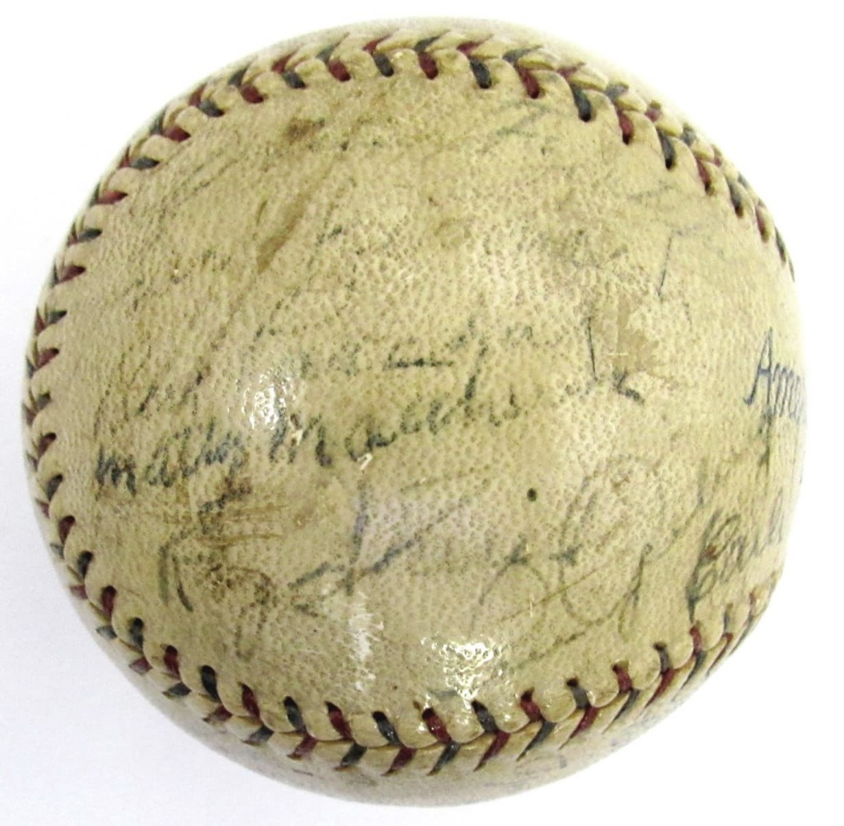 1929 NEW YORK YANKEES TEAM SIGNED BASEBALL with BABE RUTH, LOU GEHRIG, EARLE COMBS, TONY LAZZERI, LEO DUROCHER, WAITE HOYT, BILL DICKEY, MILLER HUGGINS, A. FLETCHER, B.BENGOUGH, B.SHAWKEY, W.MOORE, C.EGAR,
