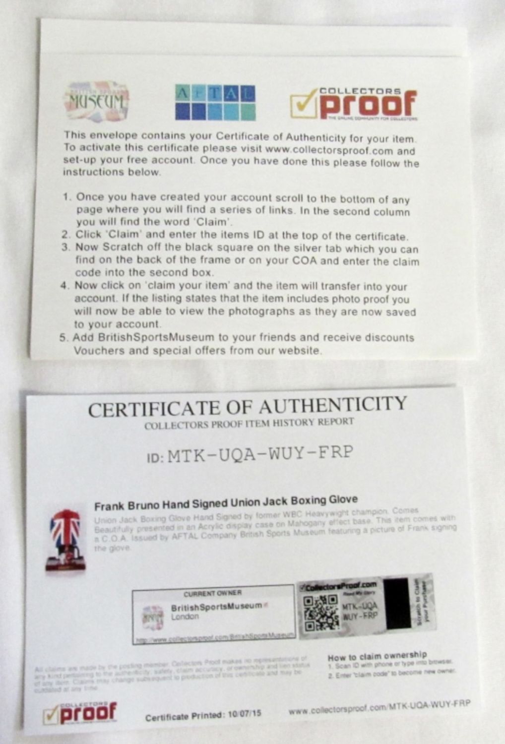 BRITISH BOXING GLOVE – COA on BACK with QR CODE COA