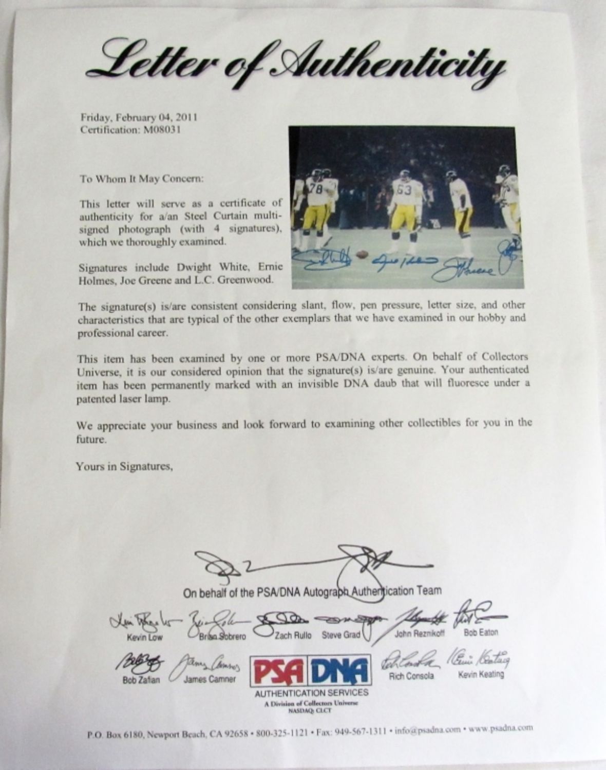 DWIGHT WHITE, ERNIE HOLMES, JOE GREENE & L.C. GREENWOOD – 22 x 18 FRAME – PSA/DNA CERTIFIED