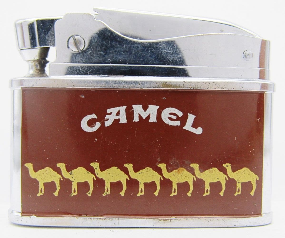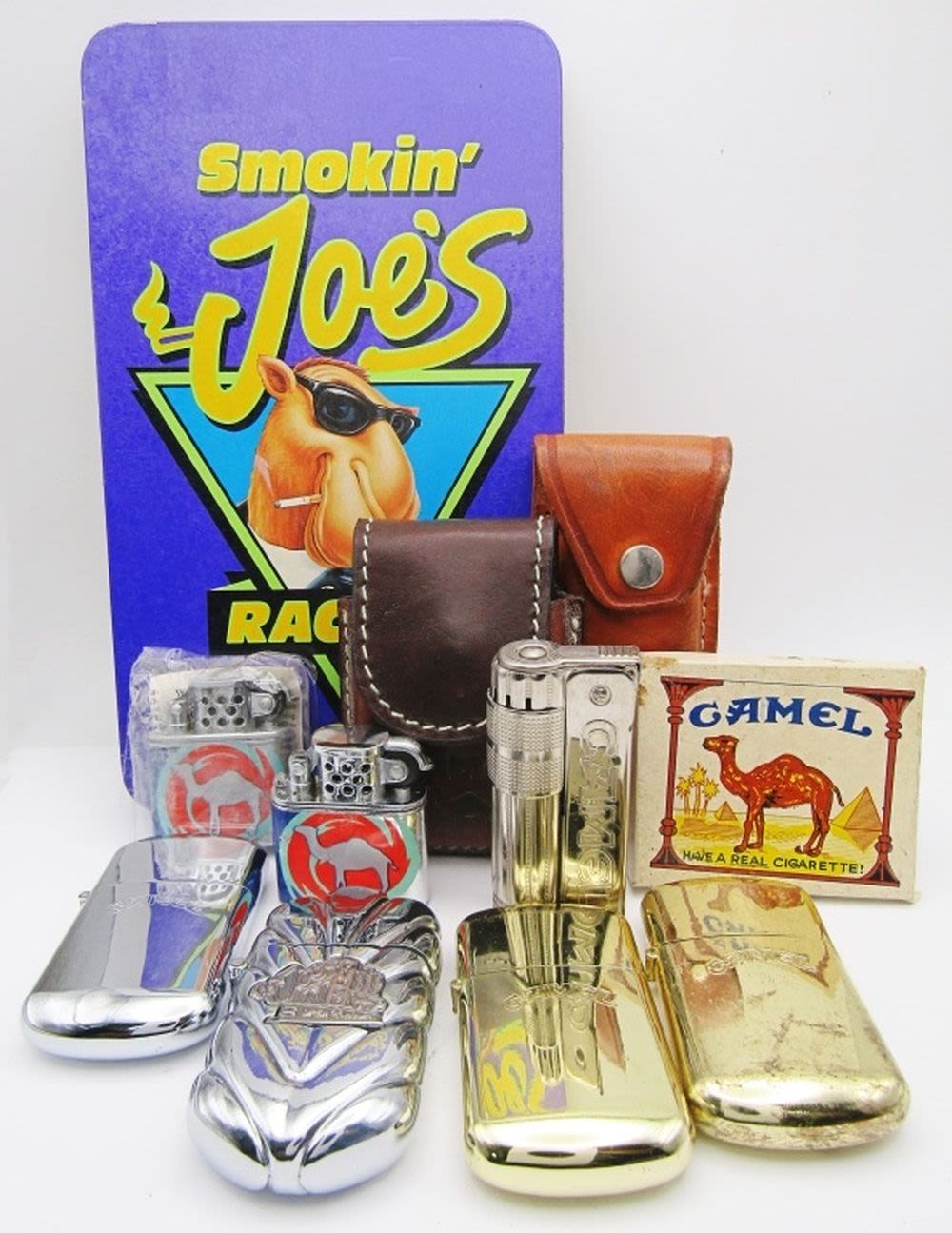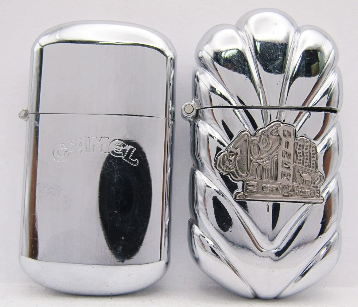 2 Bronze Camel Joe Refillable Lighters (1 Unfired), 1 Silver Tone Camel Joe Refillable Lighter, Camel Joe’s Diner Open 24 Hours High Polish Chrome, Firebird Camel Lighter, Sarome Swallow Advertising Camel Lighter (For