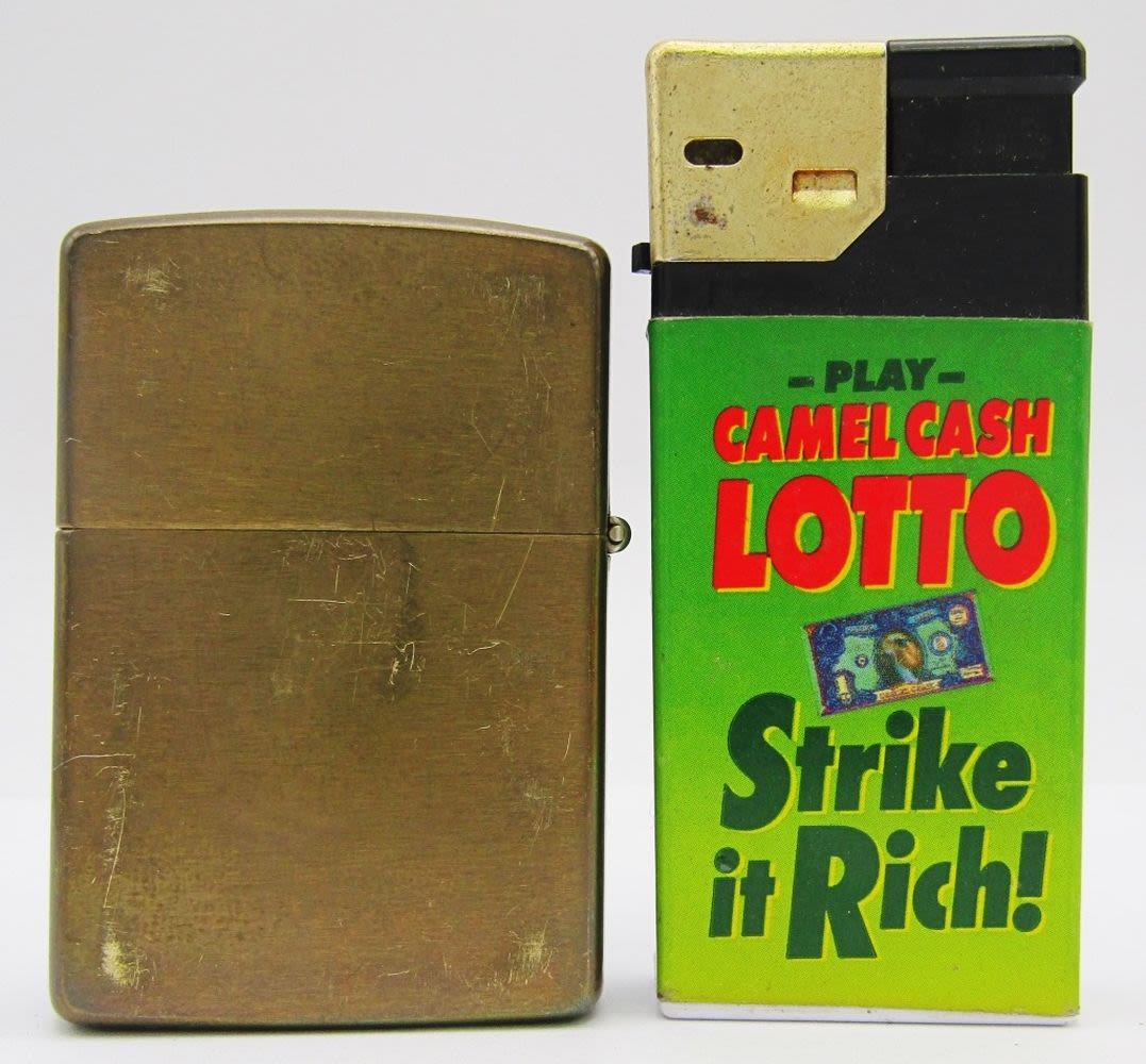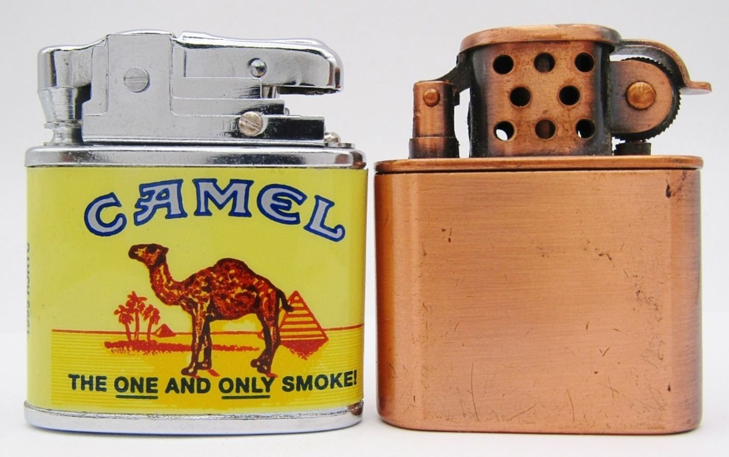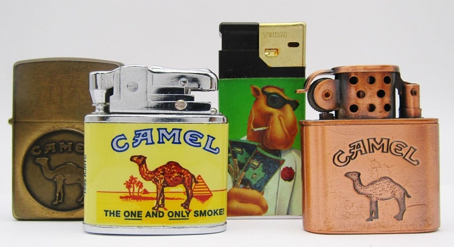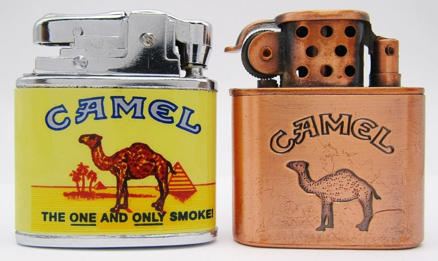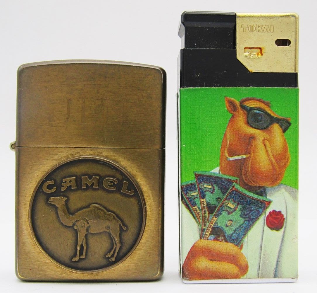 Camel “The One And Only Smoke!” Refillable, Flip-Top Bronze Colored Camel Lighter, Vintage Tokai Lotto Camel Disposable Lighter; All Used Conditions!
