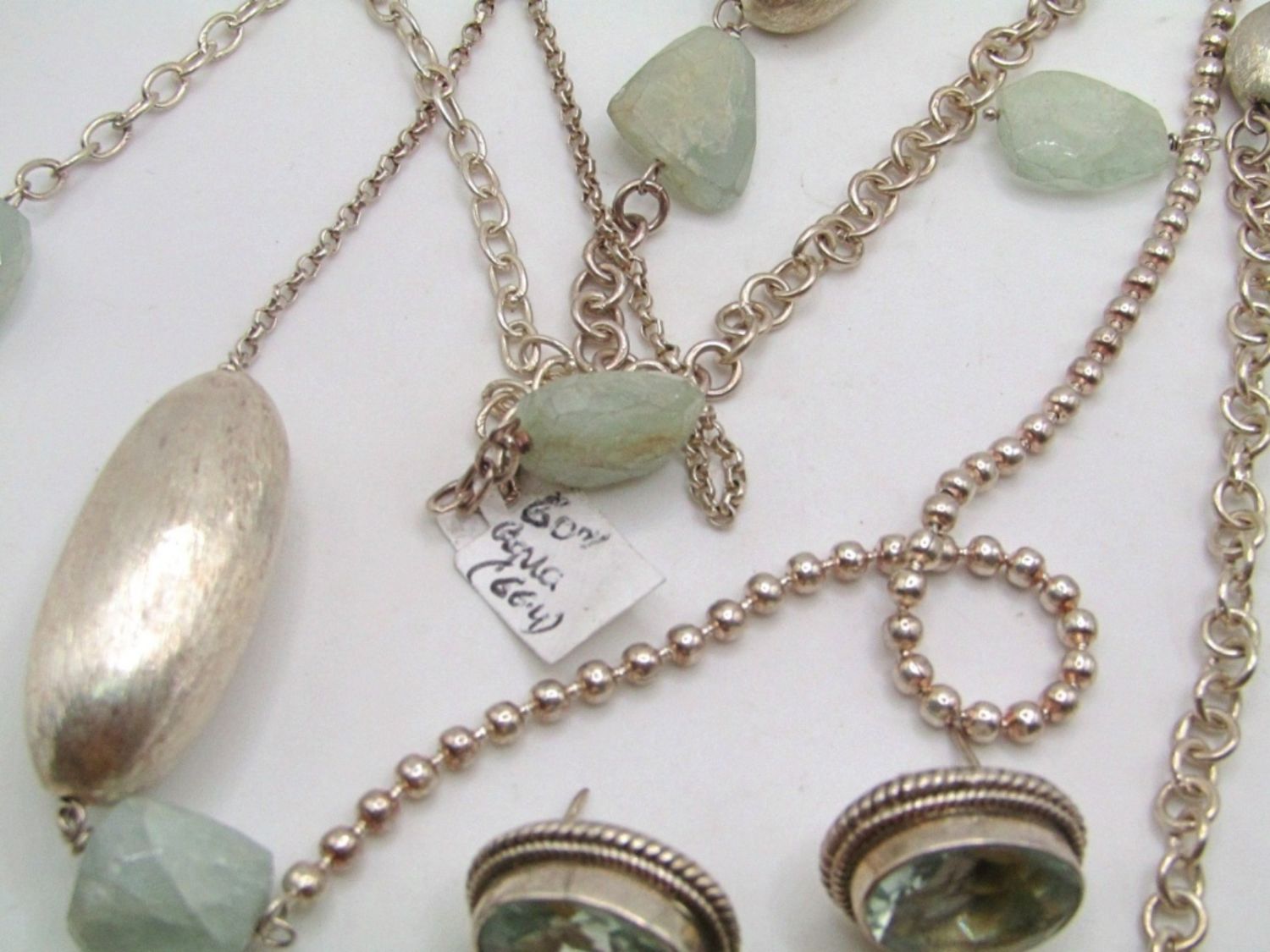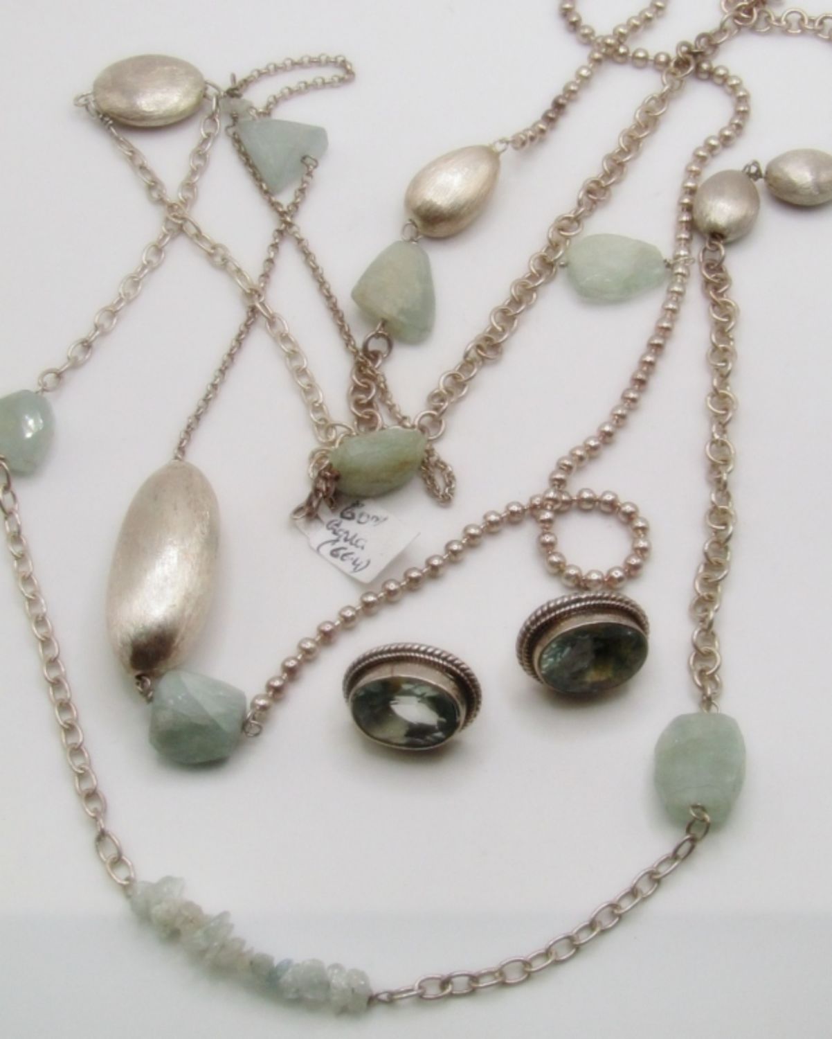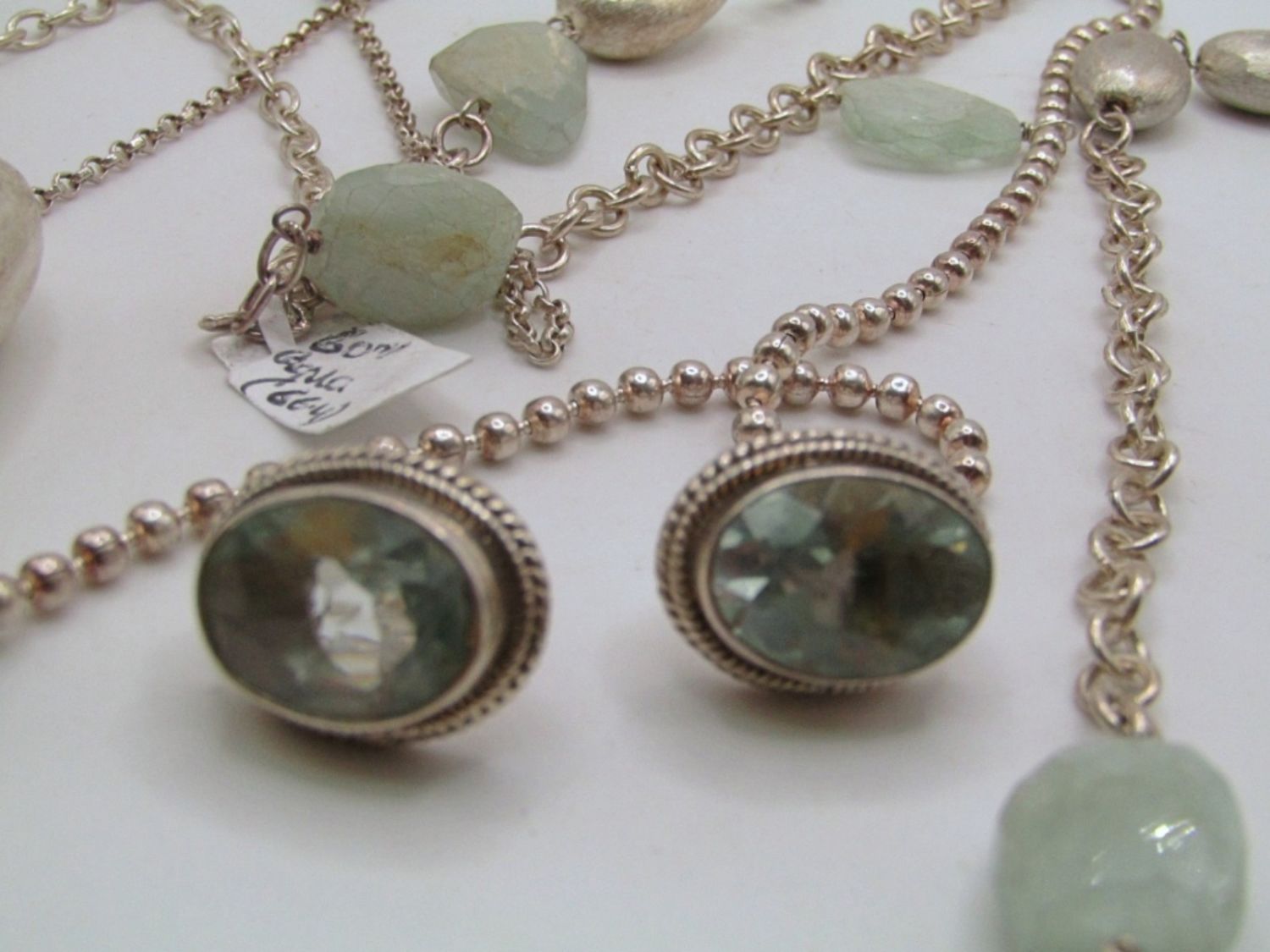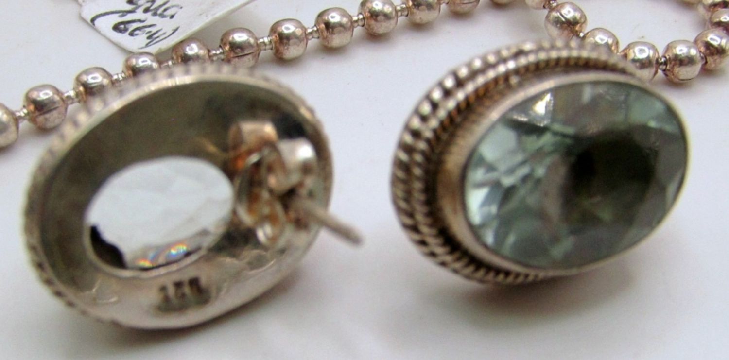 50 dwt, 30 in chain length wih light green natural stones and sliver beads, clear green stones for the earring stamped 925 on back