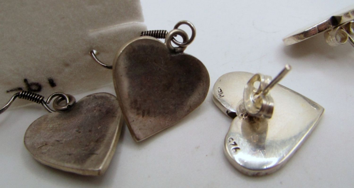 18.3dwt,1 pair is a hammered heart drop earrings stamped 925 on hooks, 1 pair of hammered studs stamped 925 on the back, 1 pair of dangle earrings stamped 925