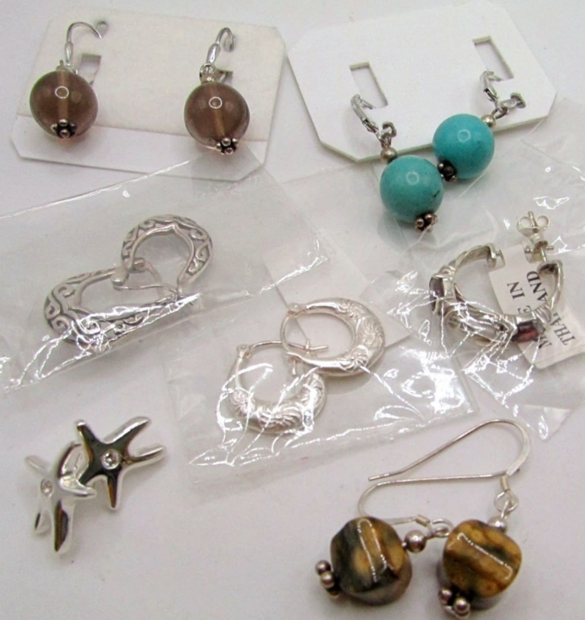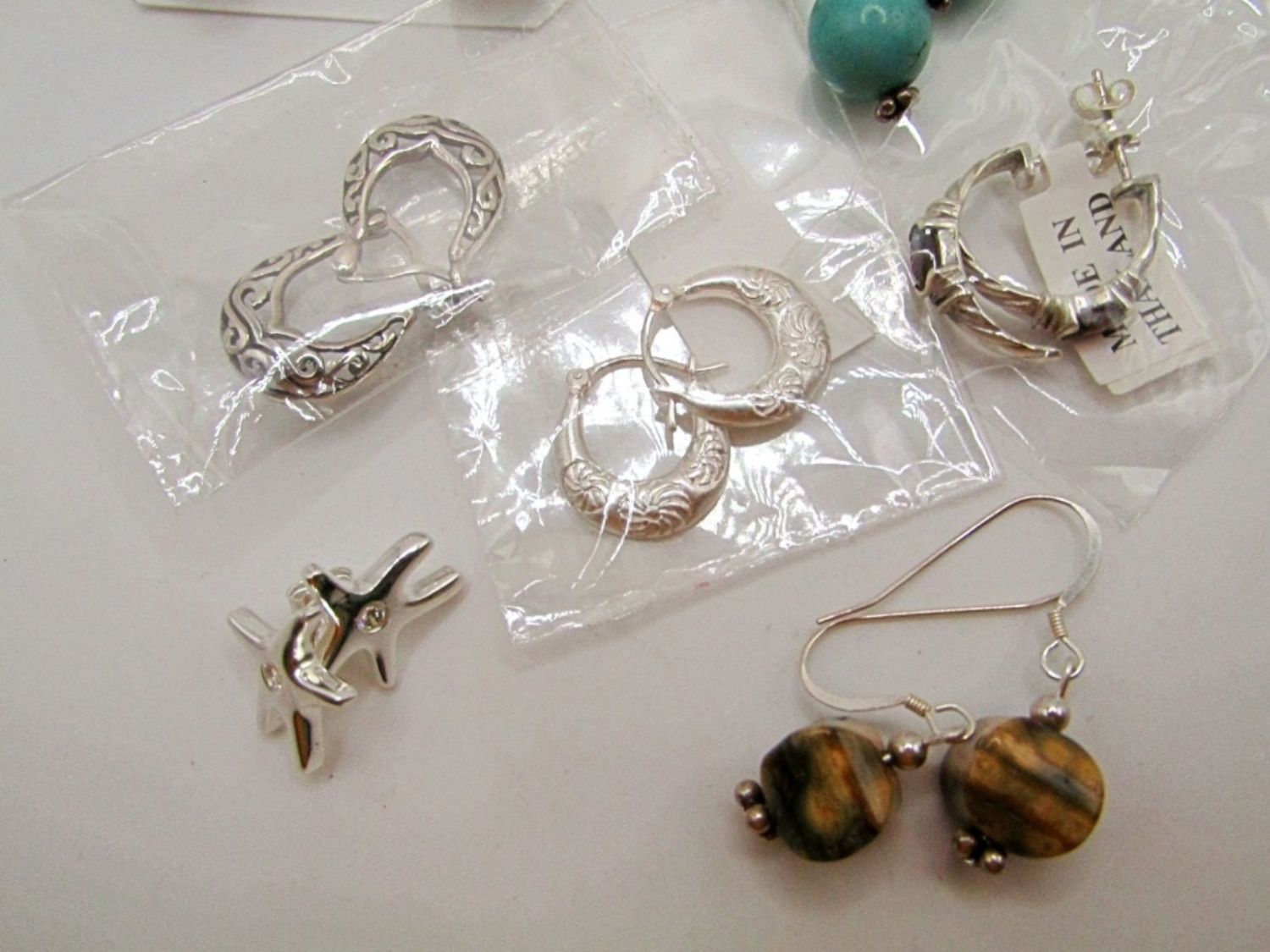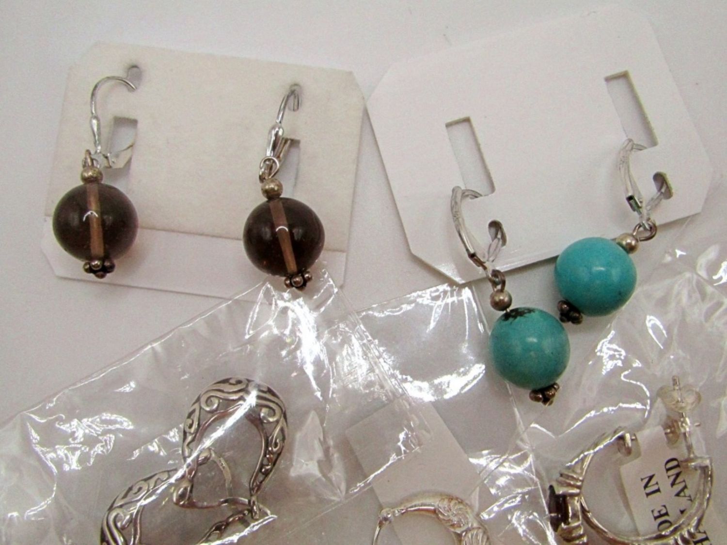 16dwt, 1 pair agate dangles, 1 pair tuquoise and brown ball stones stampes 925,1 pair sterling with a red stone studs,2 pairs of huggies, 1 pair star studs with a clear stone in the middle