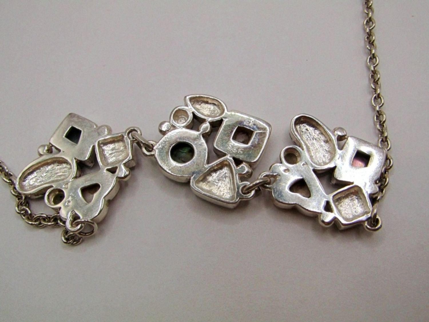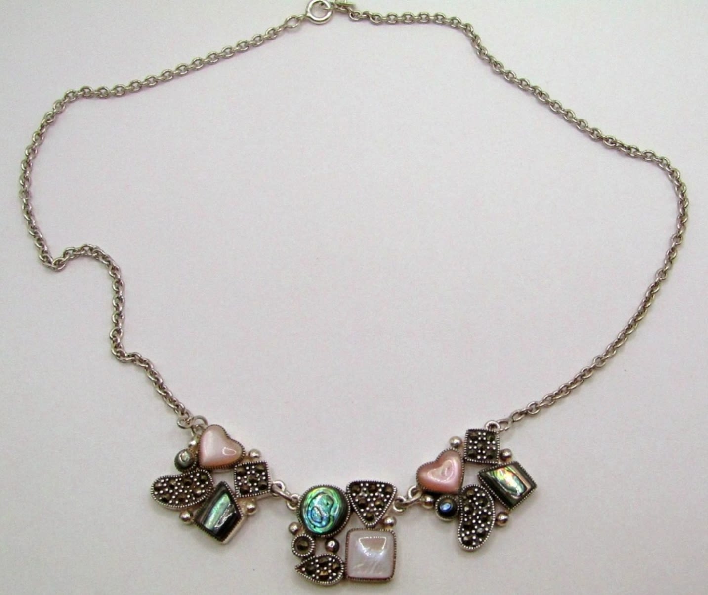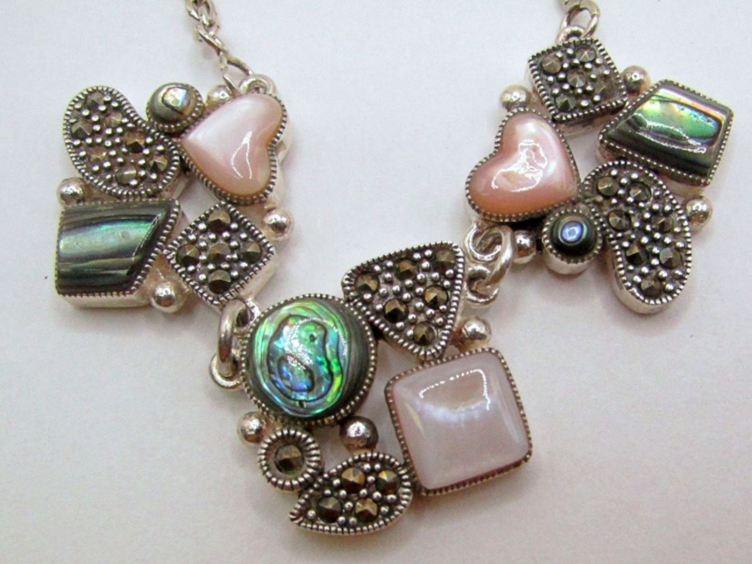 12dwt, 14in chain length 17in with pendant, has abalone,marcasite, and mother of pearl making a stunning a design stamped 925 on back