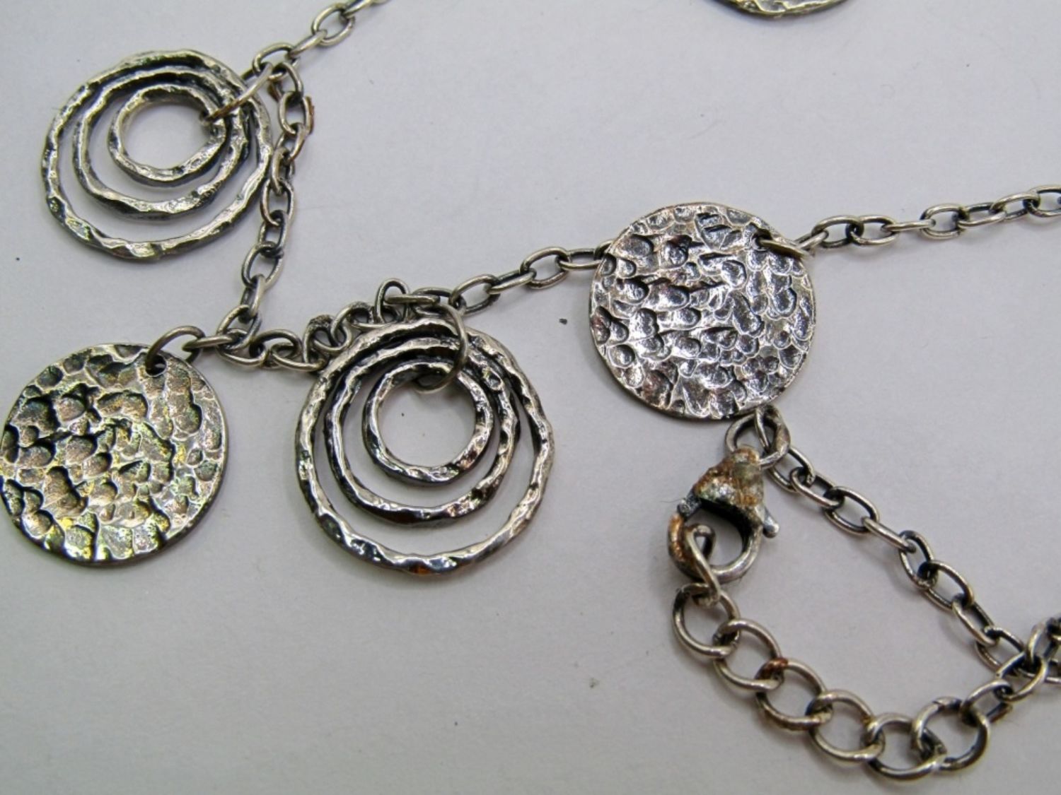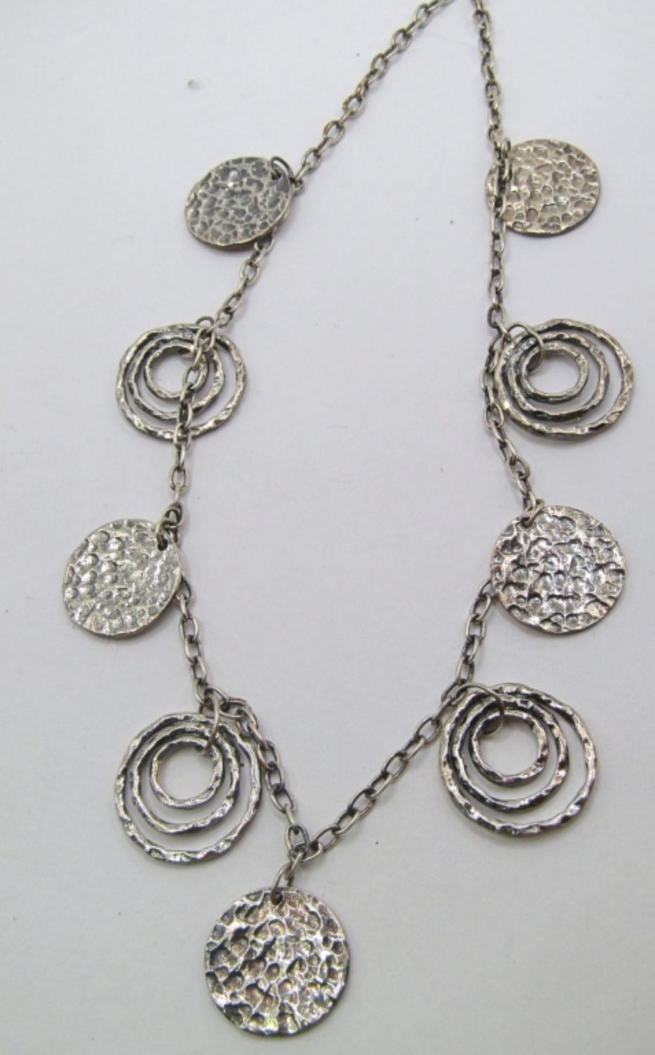 14dwt, 18 1/2in stamped on clasp and on back on circle pendants 925, necklace is adjustable