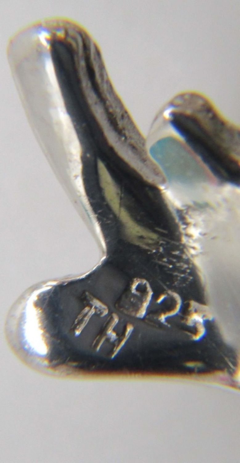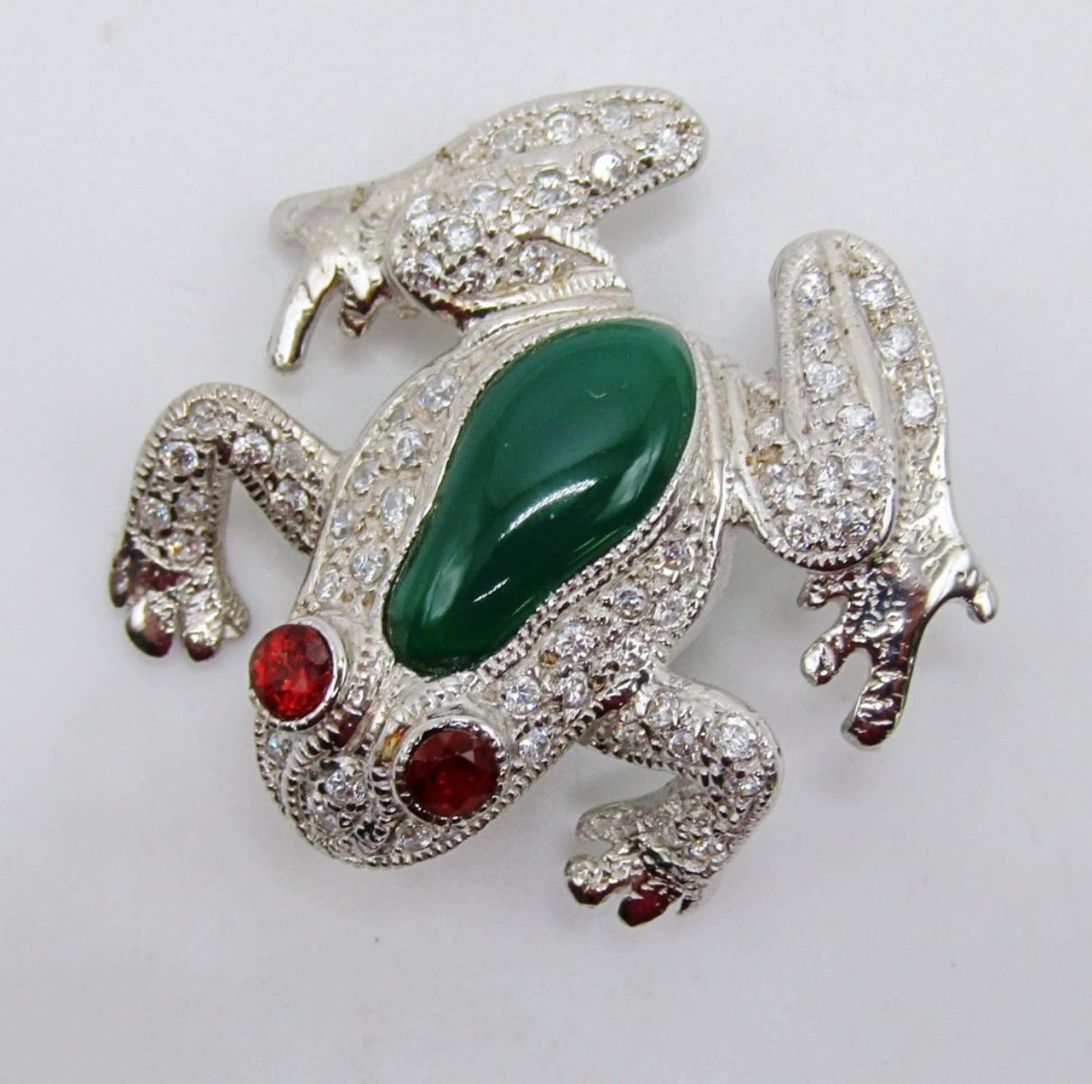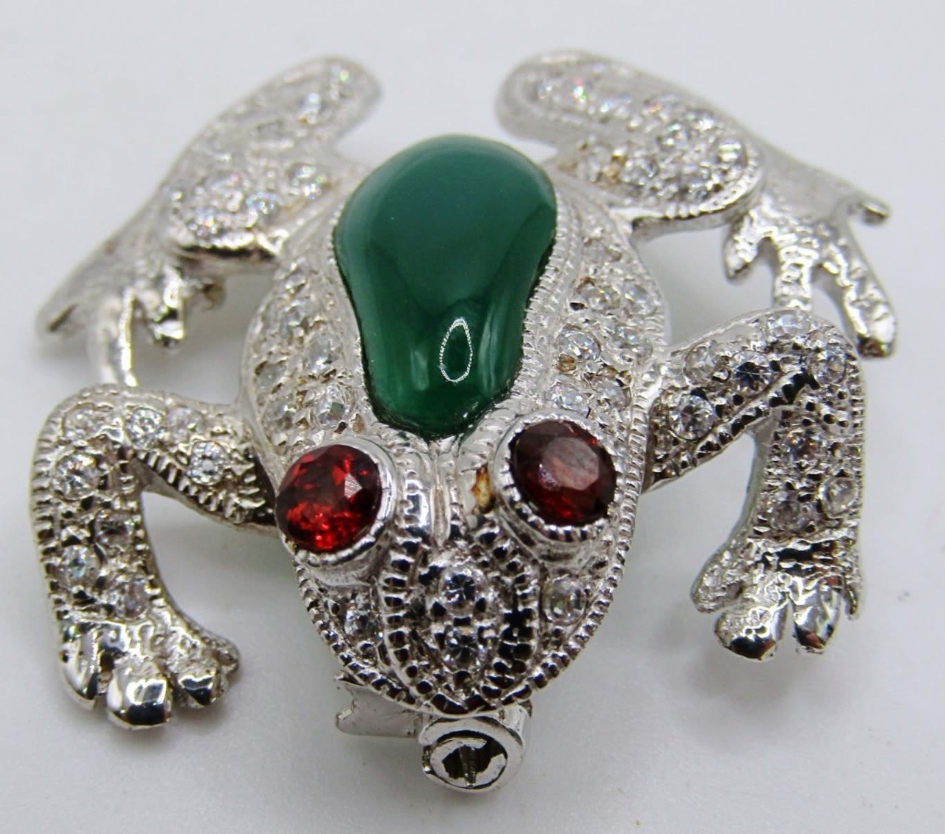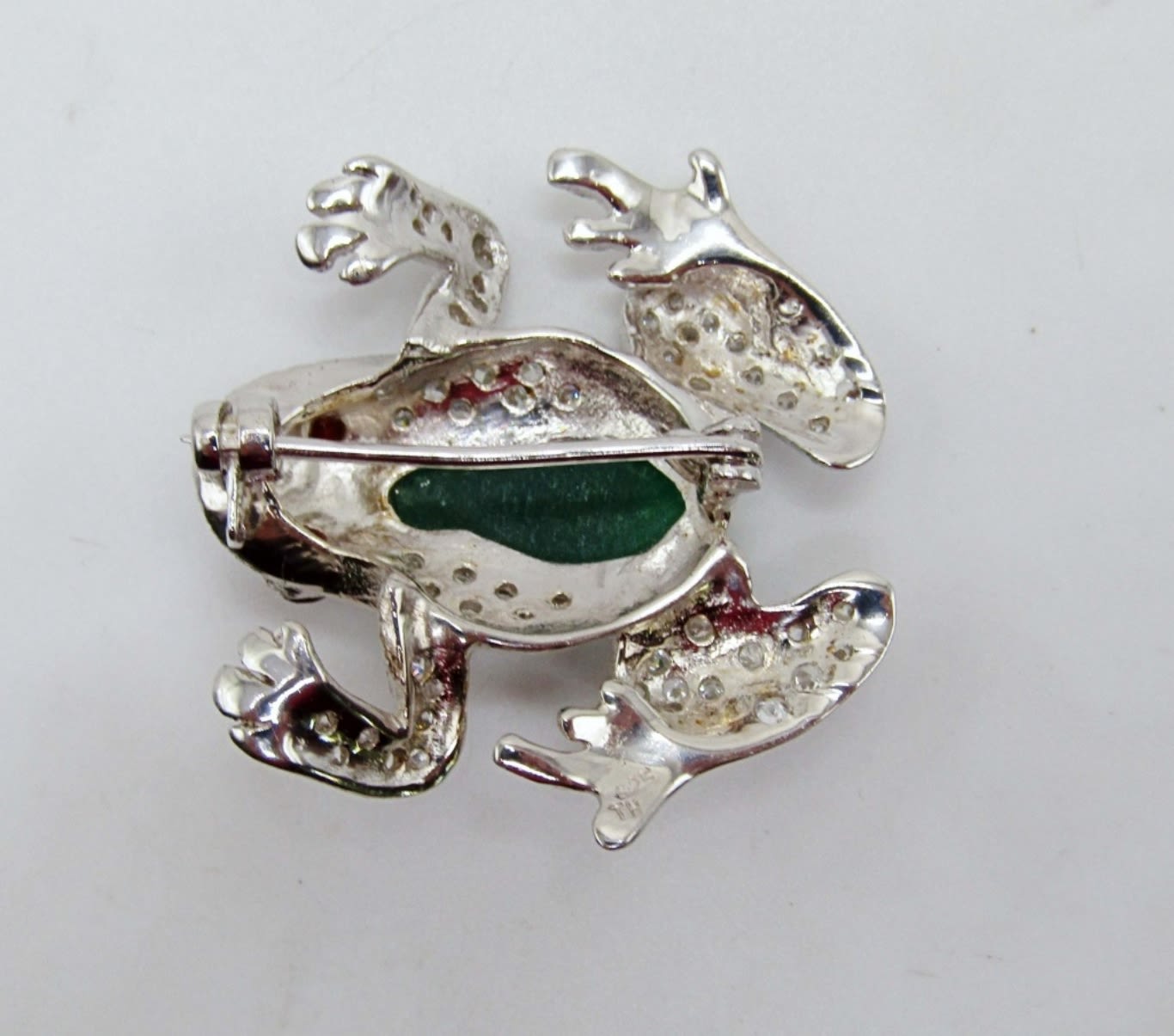 7.6dwt, little over an 1in 1/2 in length, clear stone are long the body with red stones for eyes and jade inlay on its back. Stamped 925TH on back