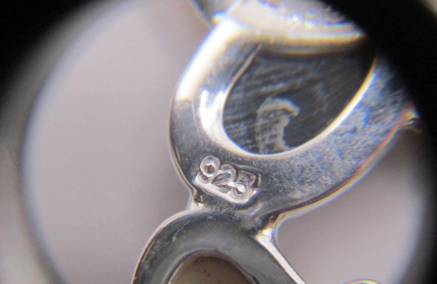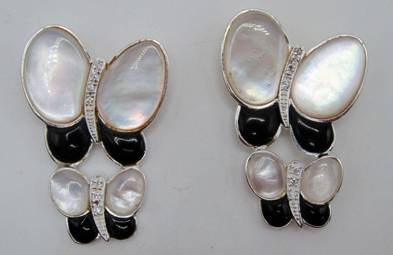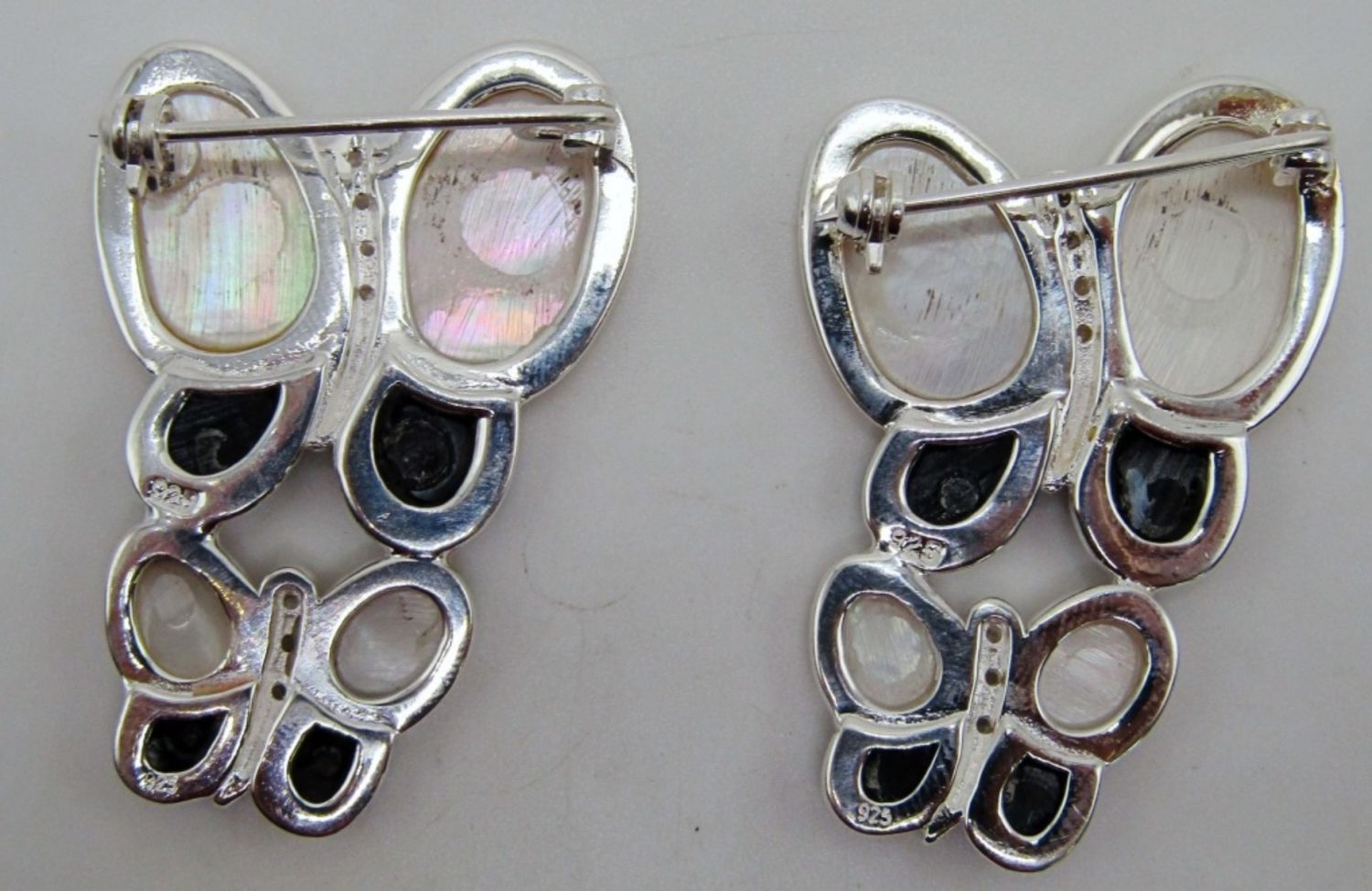 10dwt, mother of pearl and black onyx inlay stones with clear stones in the middle, stamped 925 on the back about 2in in size