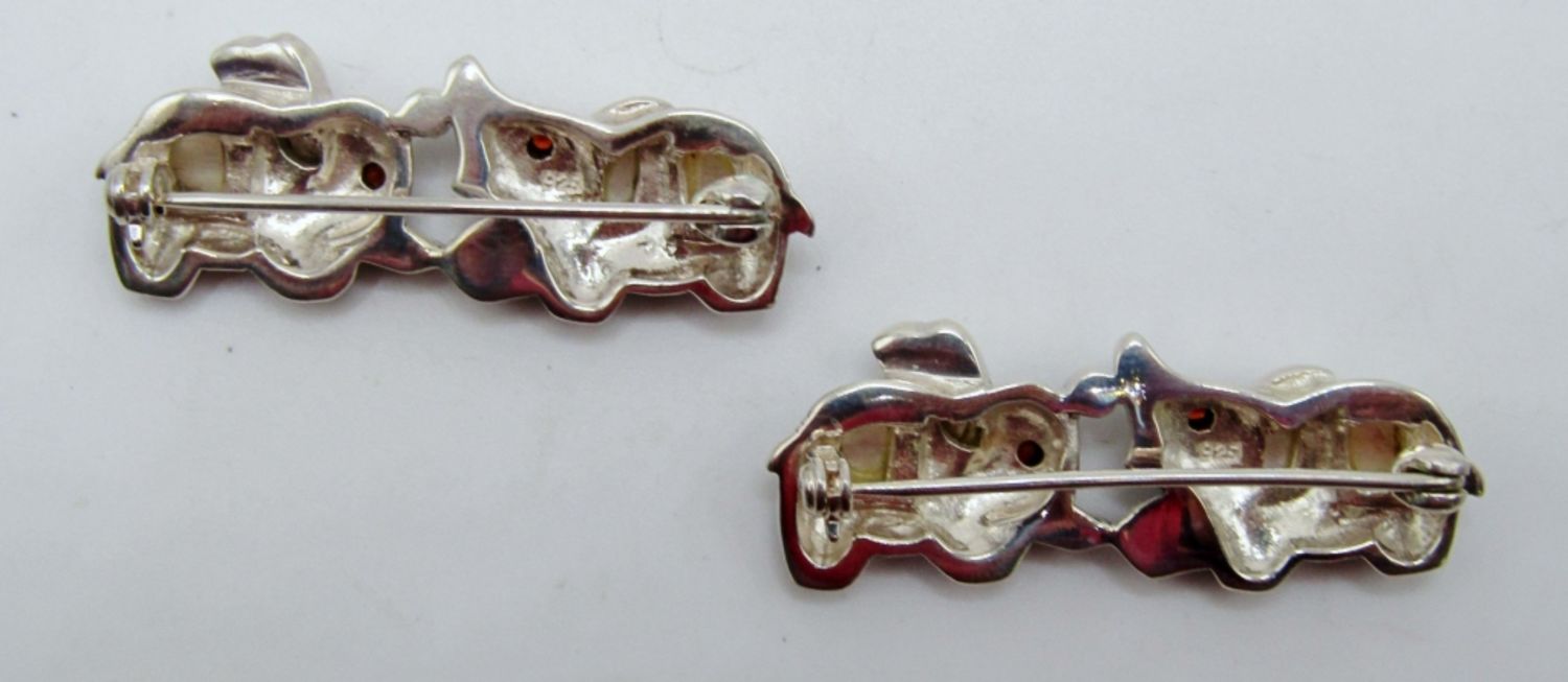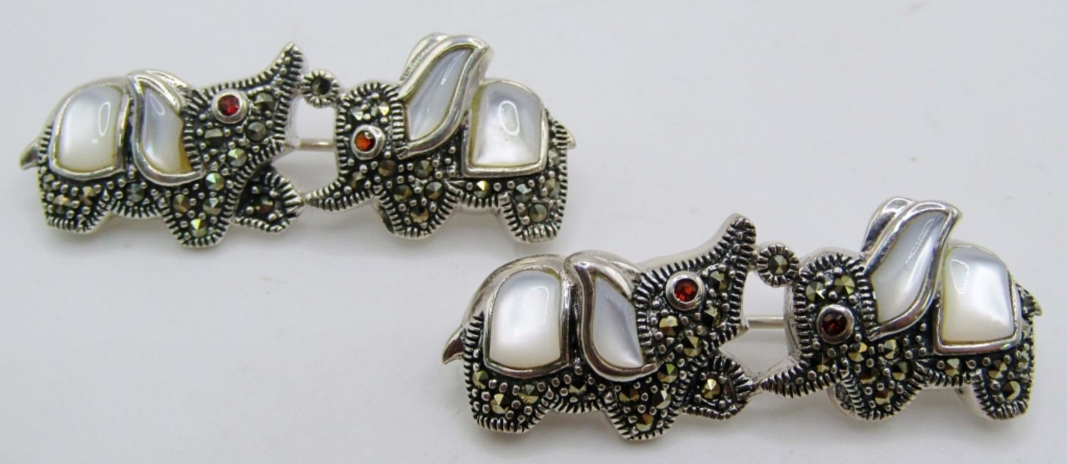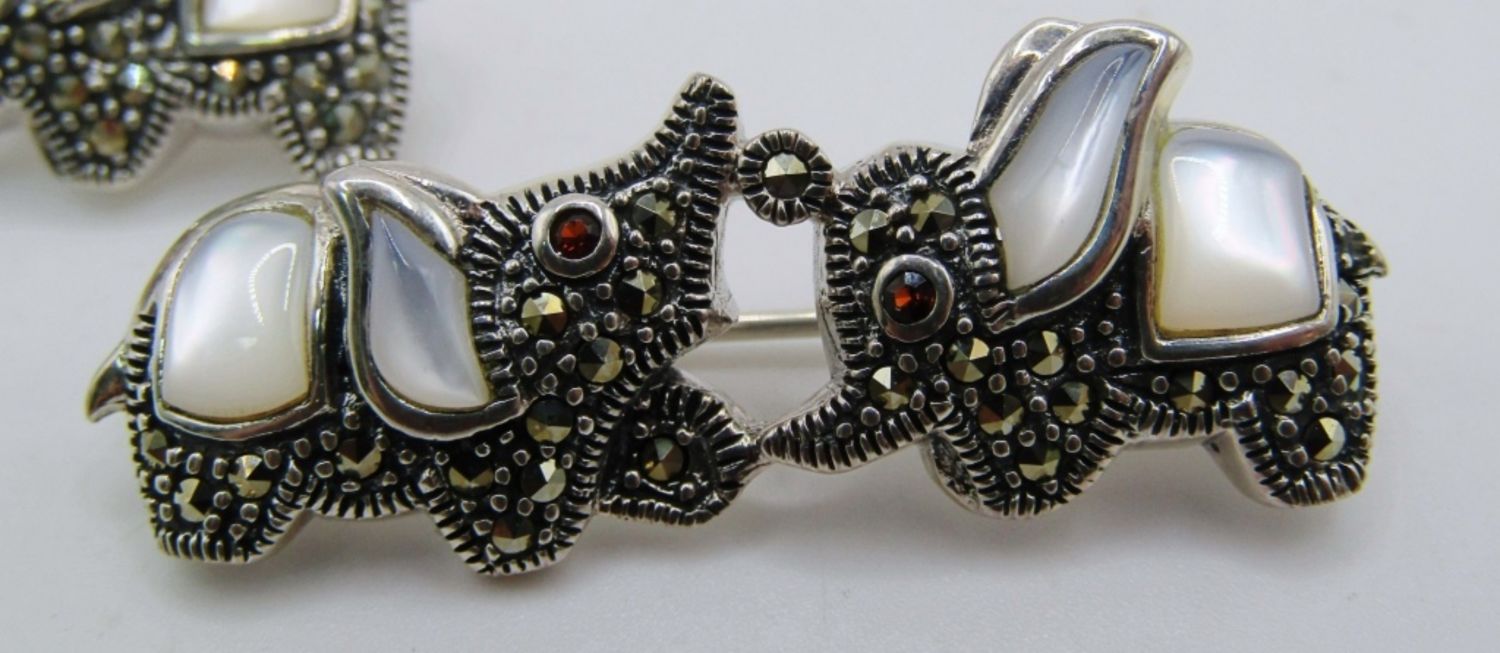 11dwt, 2in, stamped 925, ears are mother of pearl in lay, marcasite make the body with red stones for the eyes
