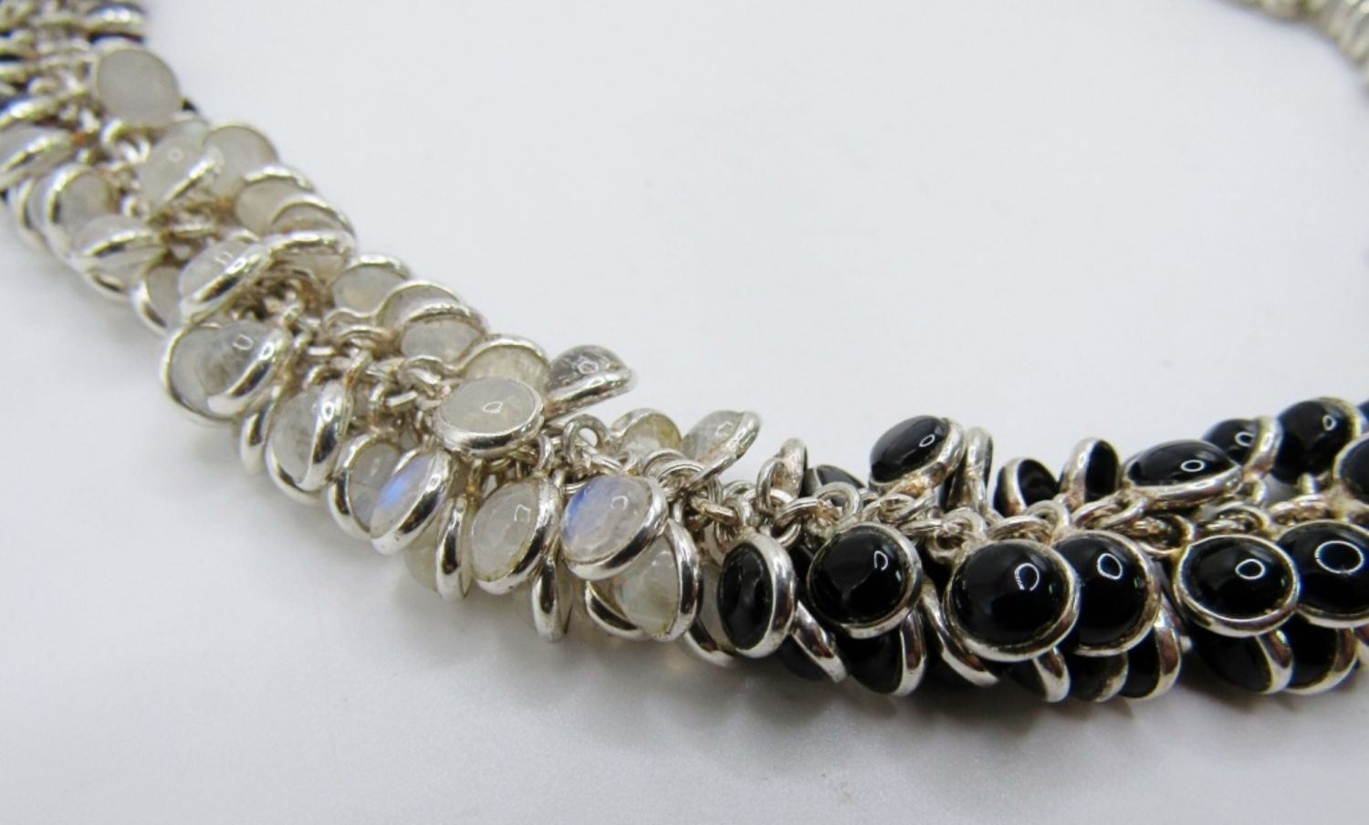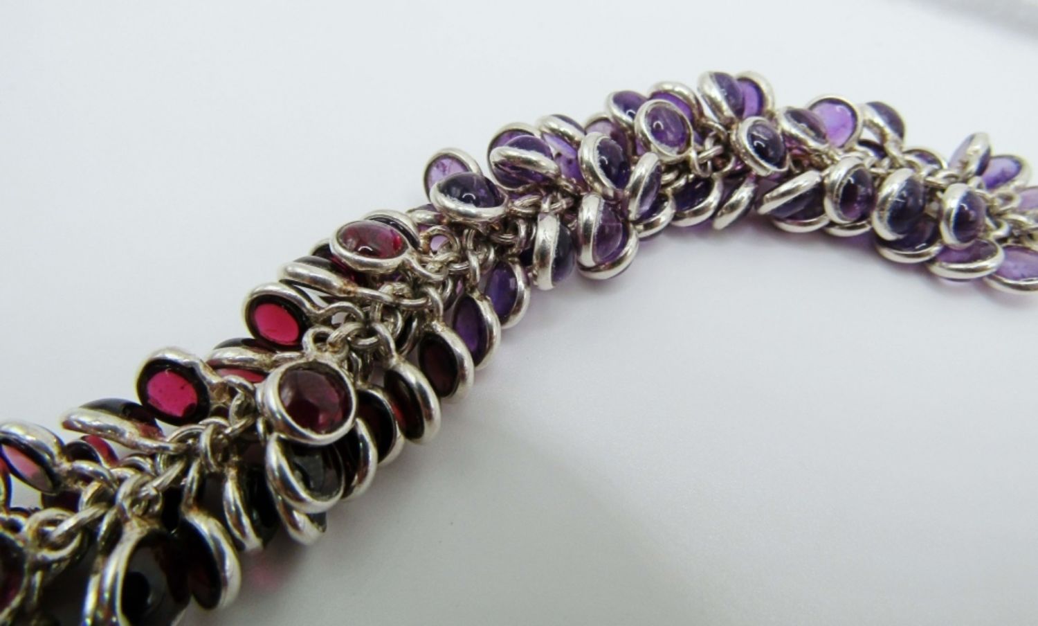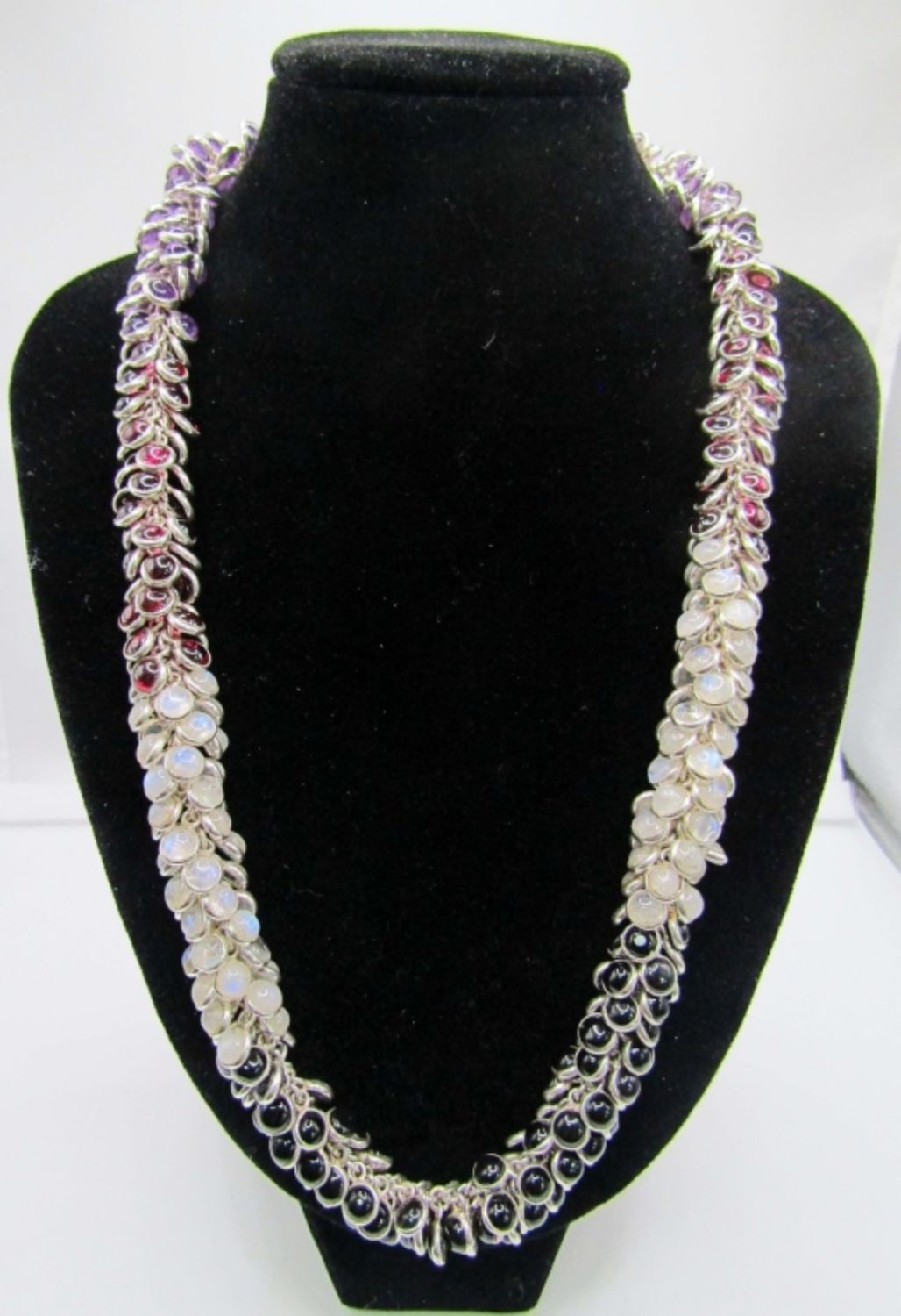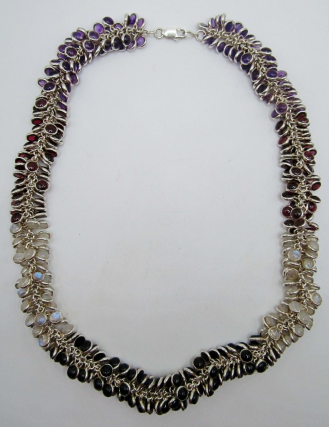 64dwt, 19in in length,purple,red,clear, black stones make this stunning necklace stamped 925 at the lobster clasp