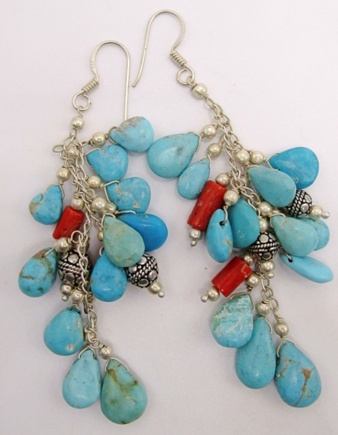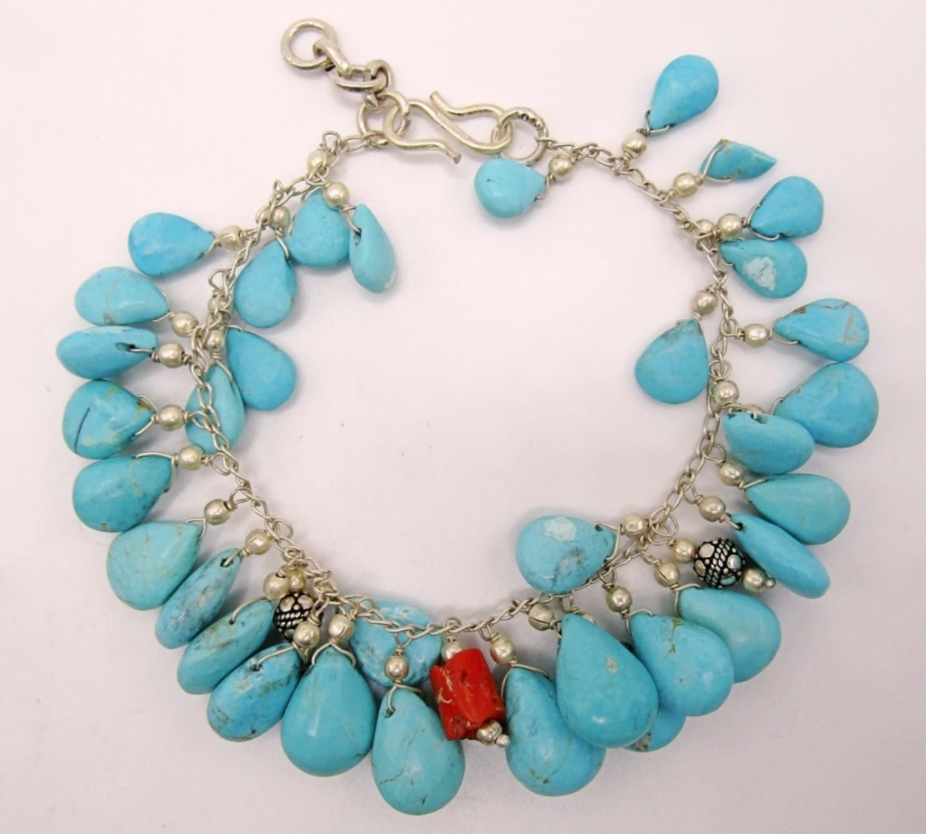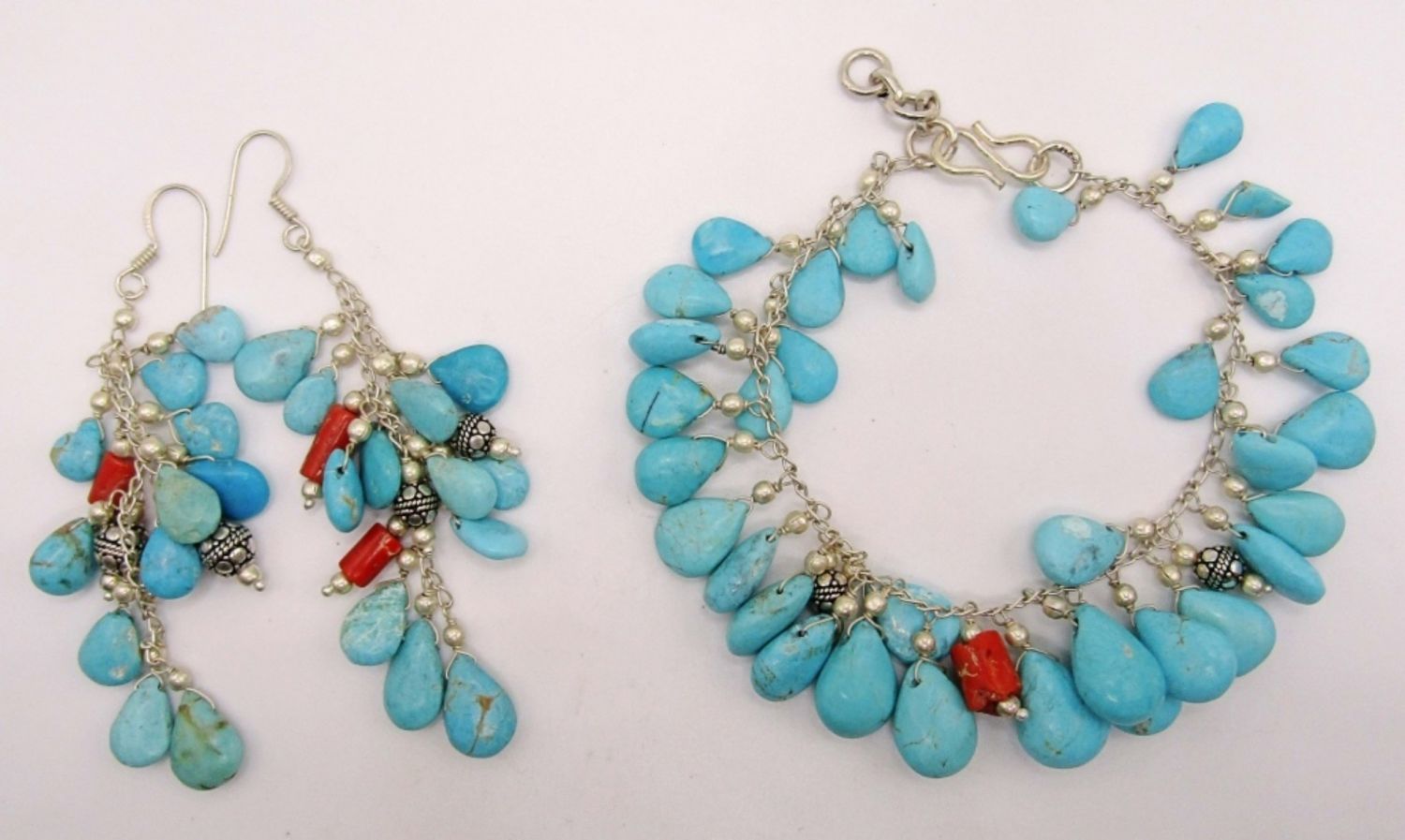 TURQUOISE BEAD CHARMS & RED CORAL ACCENTS WITH MATCHING PAIR OF PIERCED DANGLY EARRINGS-BRACELET MEASURES 8.5 INCHES