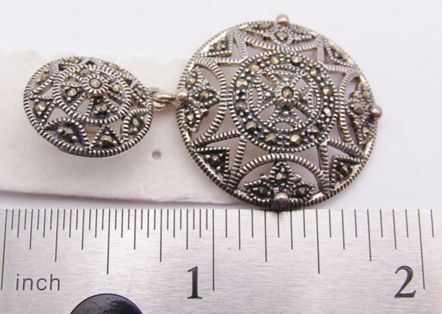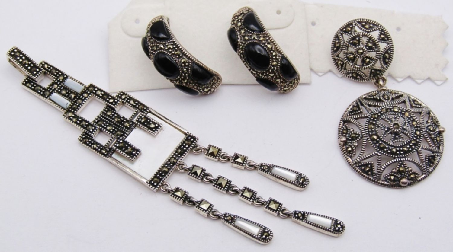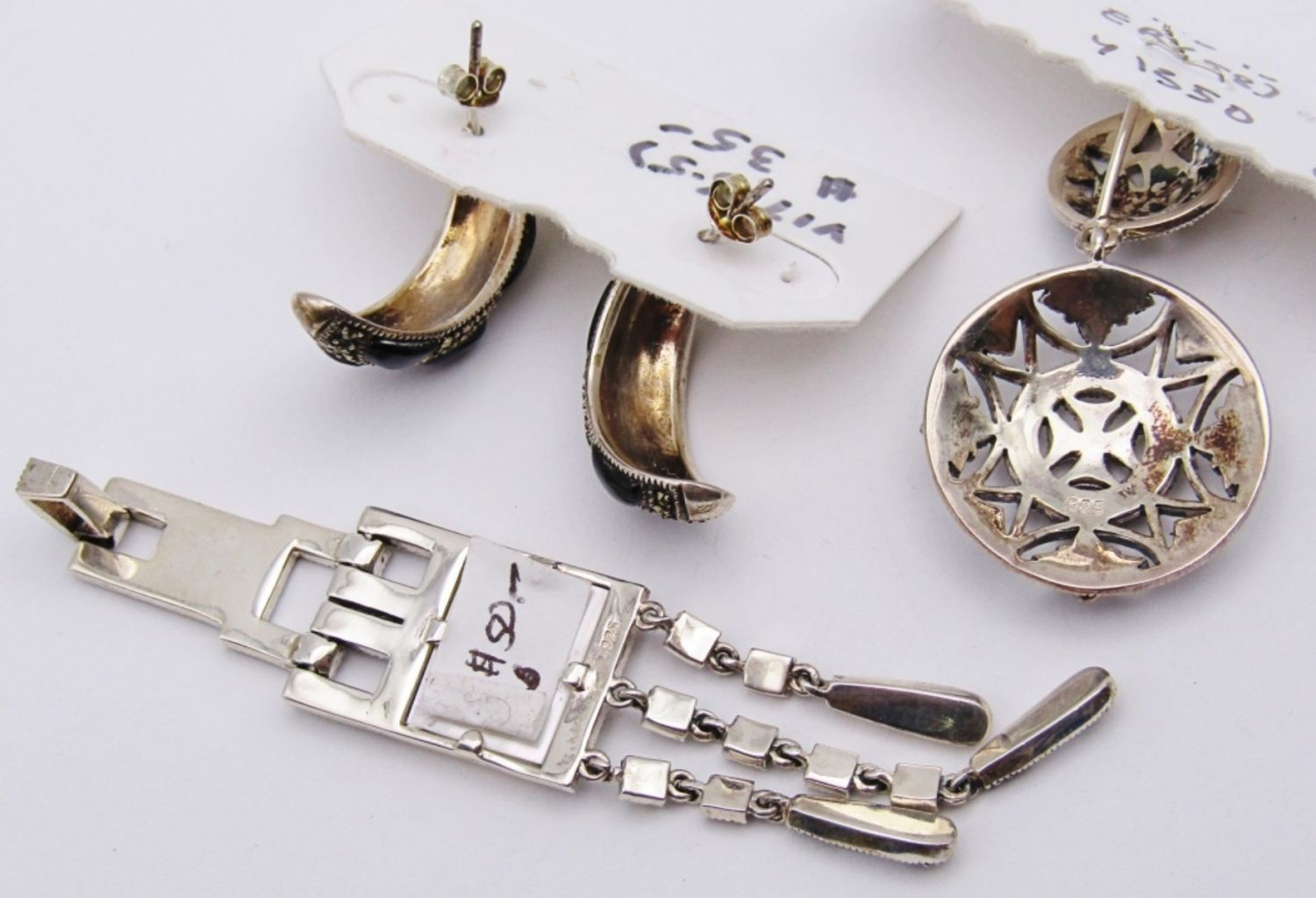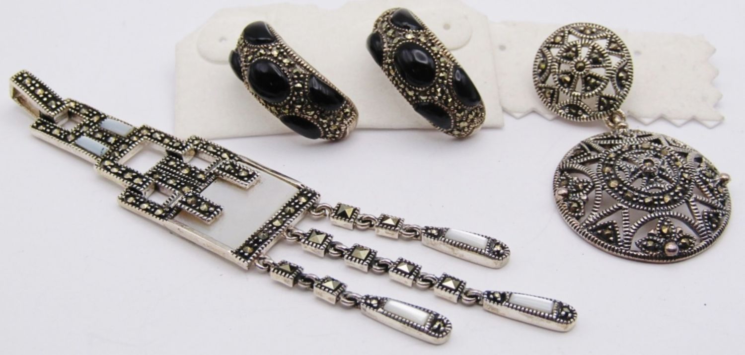 (1) PIERCED EARRING SET (1) LONG PENDANT w/MOTHER of PEARL, (1) CIRCLE PENDANT – ALL VERY PRETTY ( 15 DWT)