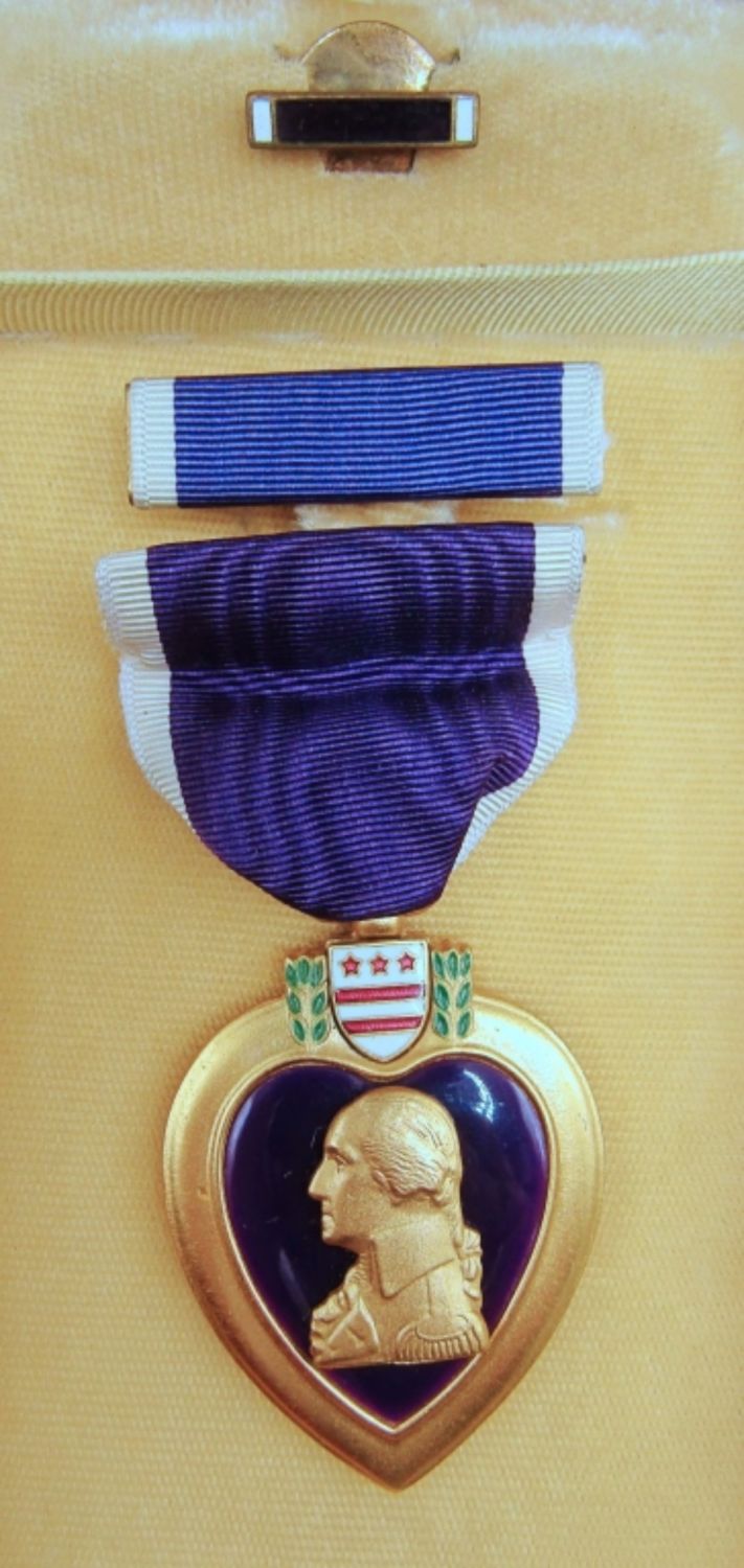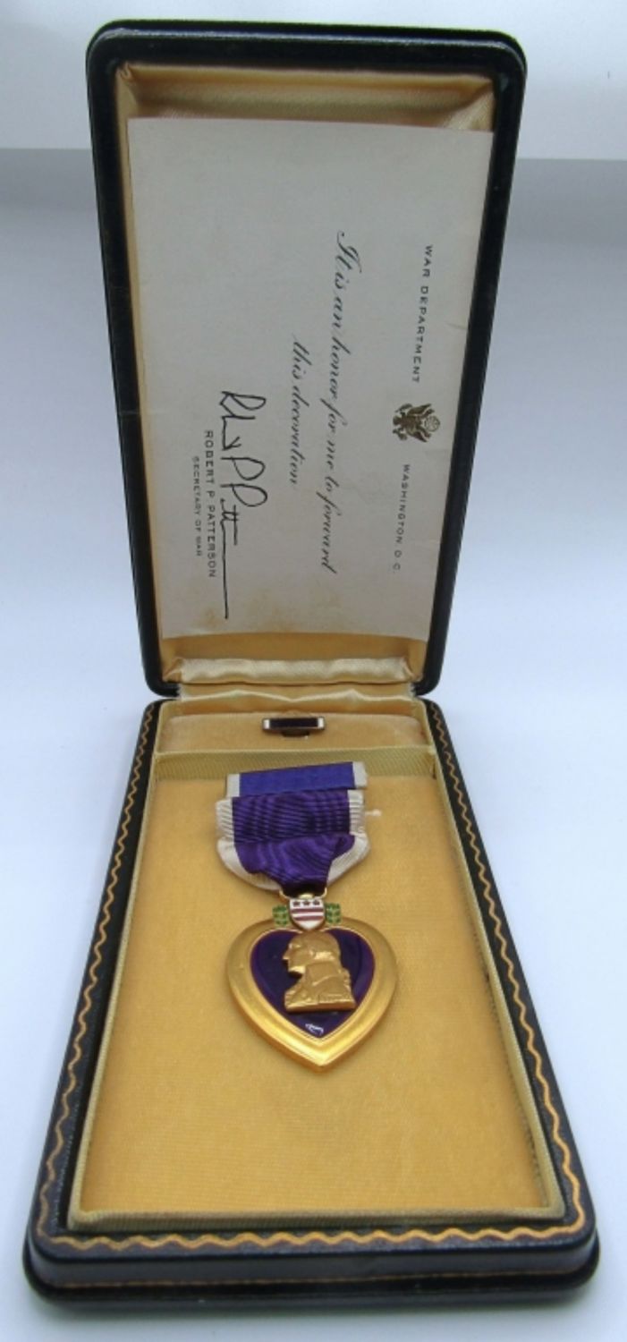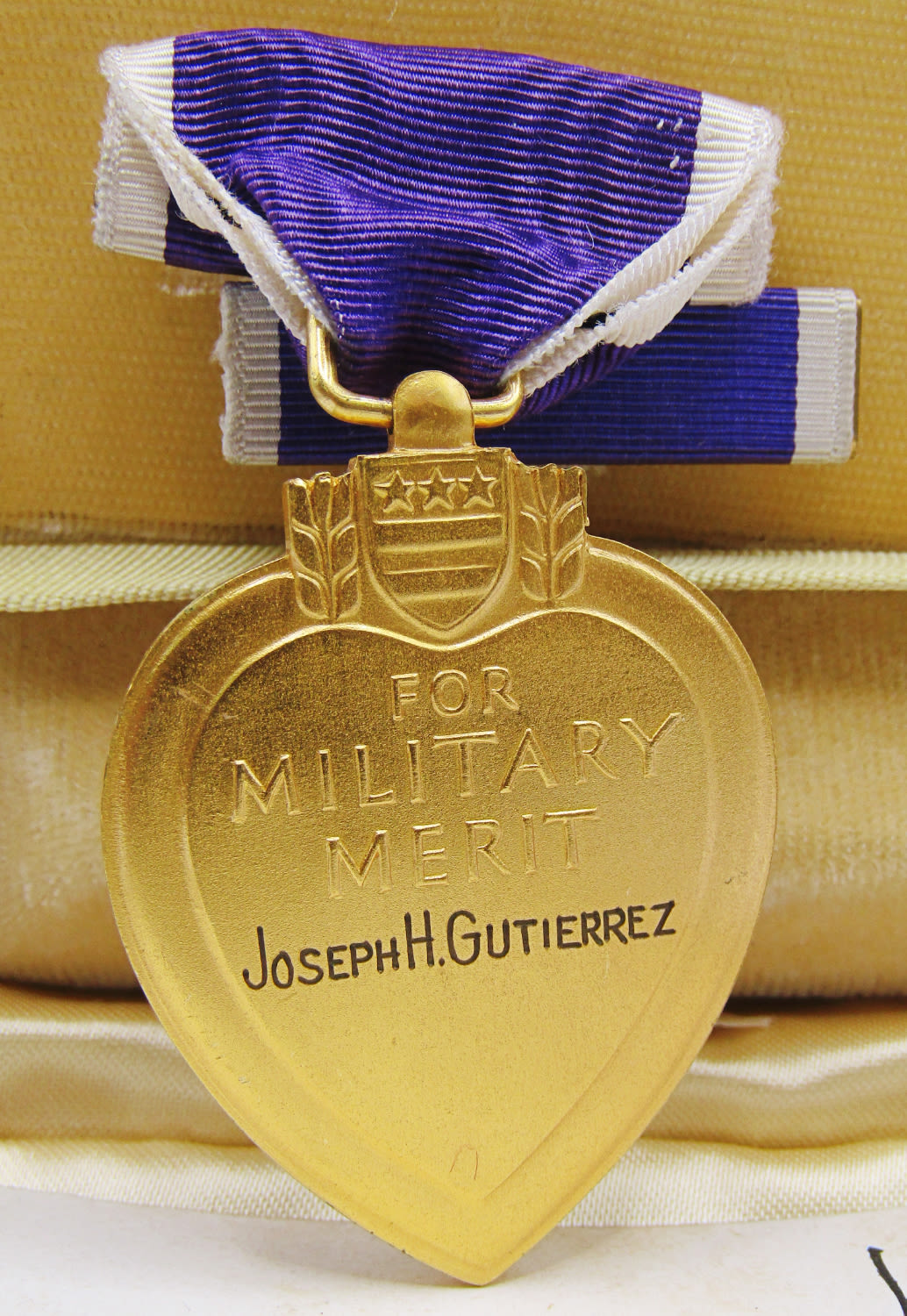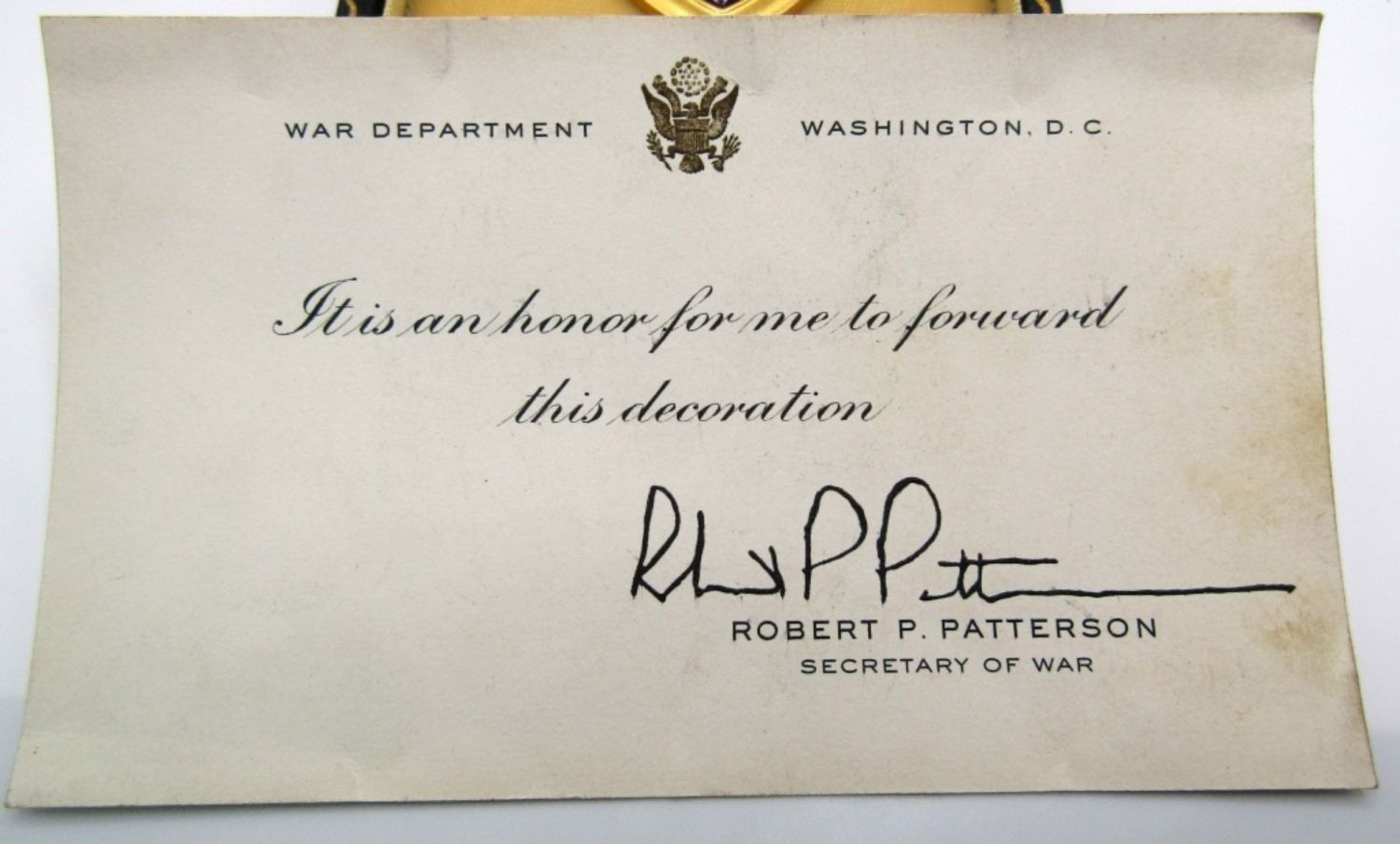 VINTAGE WWII FULL SIZE MEDAL IN CASE WITH RIBBON BAR AND LAPEL PIN. INSCRIBED “JOSEPH H. GUTIERREZ”. INCLUDES ROBERT PATTERSON SIGNED PRESENTATION CARD.