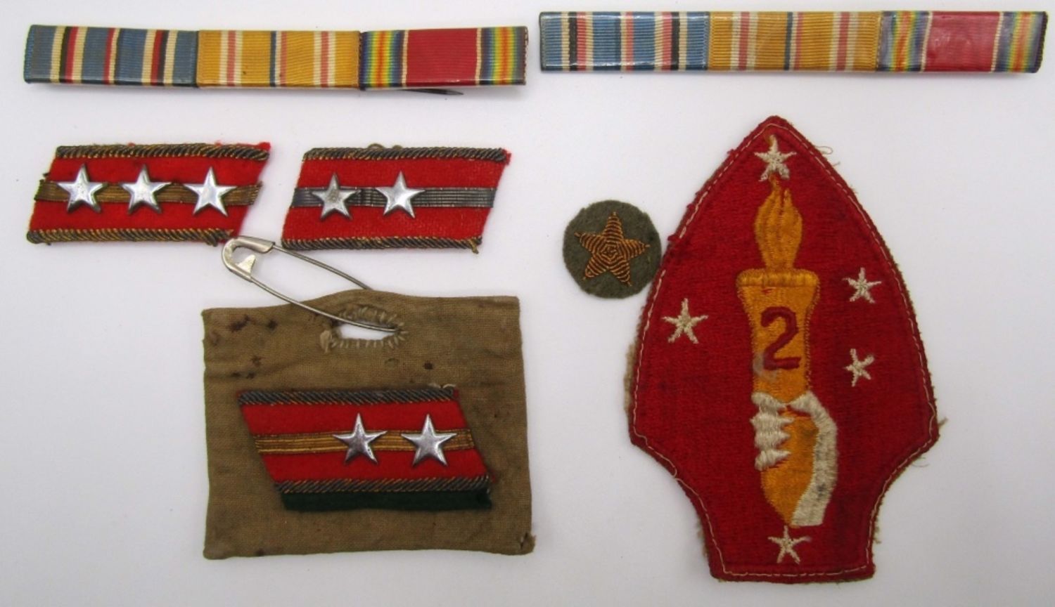 (2) BAR PINS- BENT, (5) DIFFERENT PATCHES.