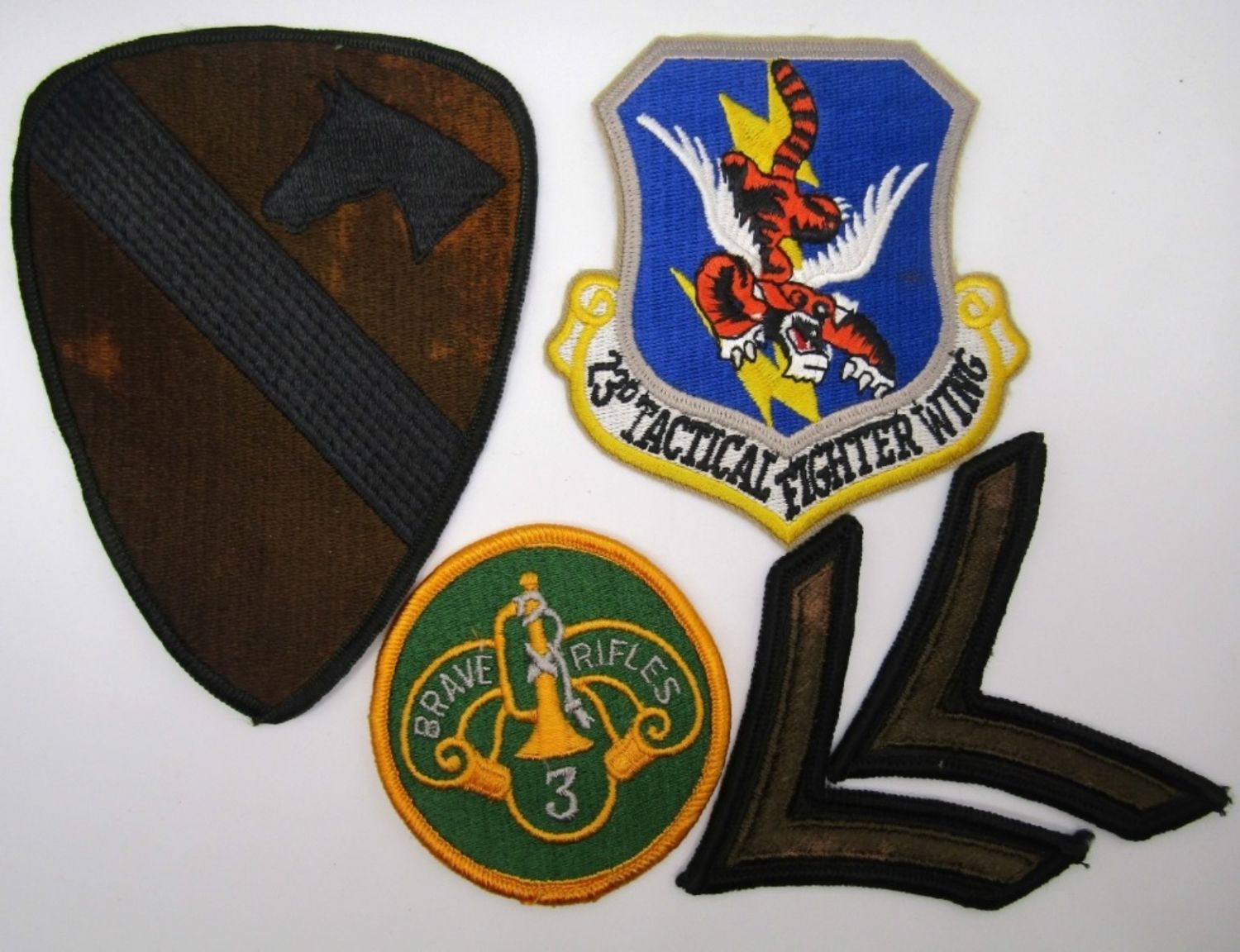 23RD TACTICAL FIGHTER WING FLYING TIGER, BRAVE RIFLES 3, (2) SINGLE CHEVRONS, ARMY FIRST CALVARY.