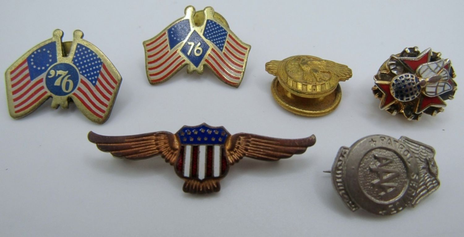 (2) DIFFERENT ’76 FLAGS, SHIELD & WINGS, EAGLE, PEACE DOVE, & AAA PATROL SERVICE.