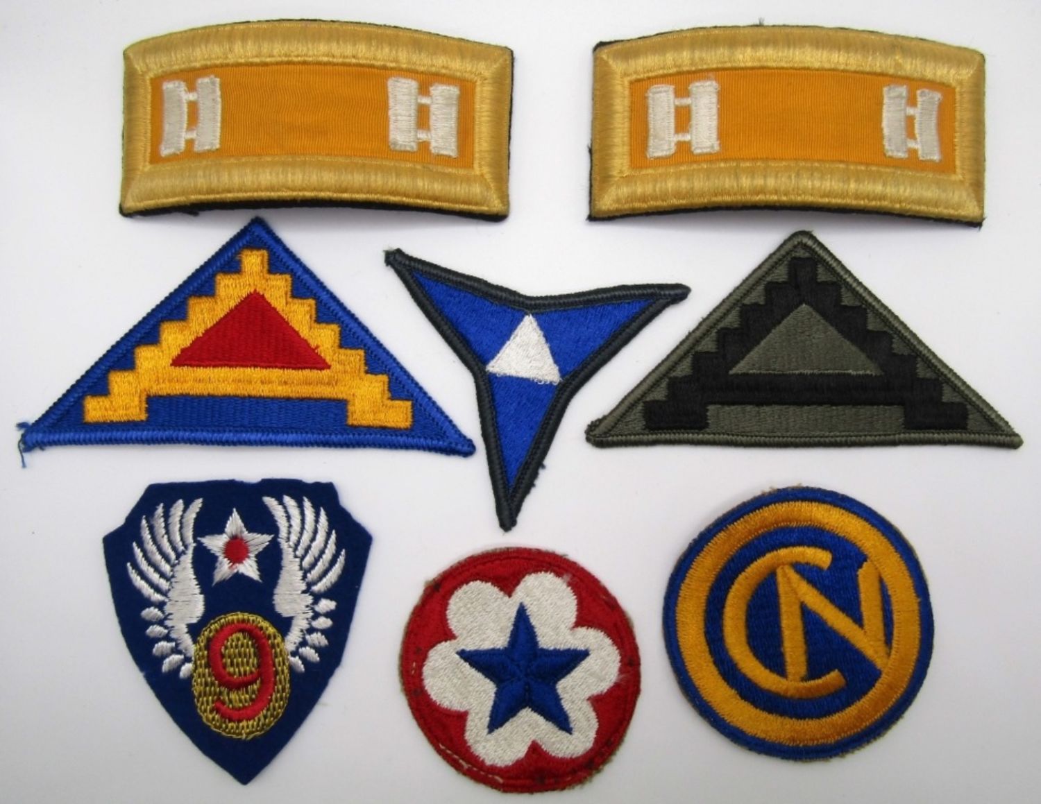 (2) US ARMY SHOULDER BOARDS CAPTAIN ARMOR, 7TH ARMY TRAINING COMMAND, 7TH ARMY SUBDUED, 3RD ARMY CORPS COLOR & OCP, ARMY SERVICE FORCES, 102ND INFANTRY DIVISION, & 9TH AIR FORCE.