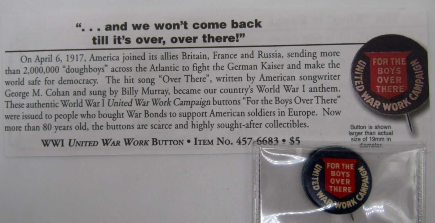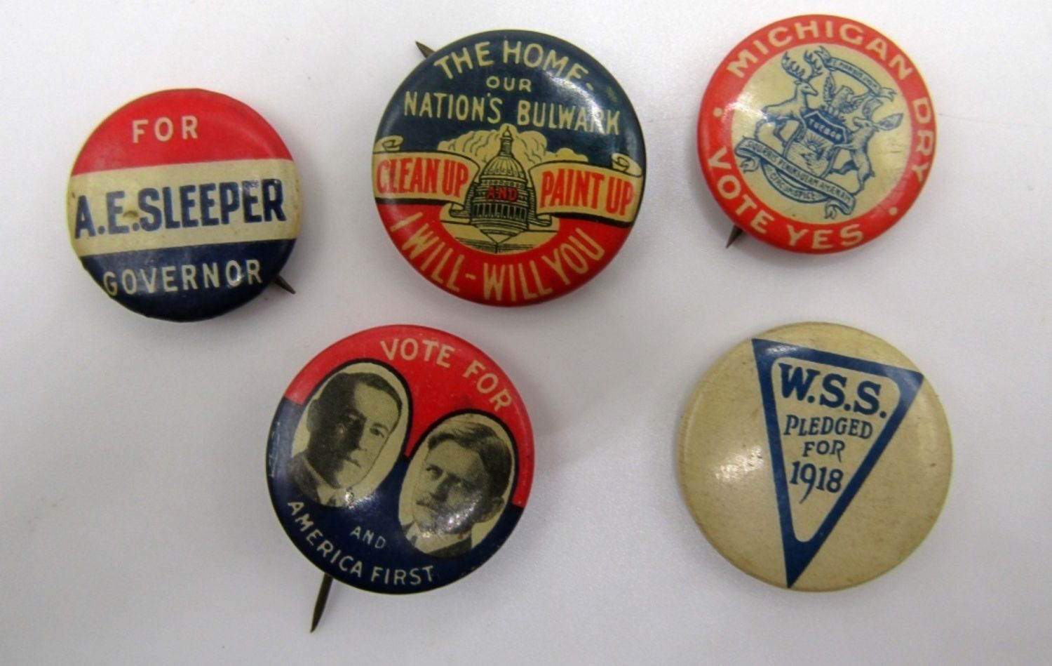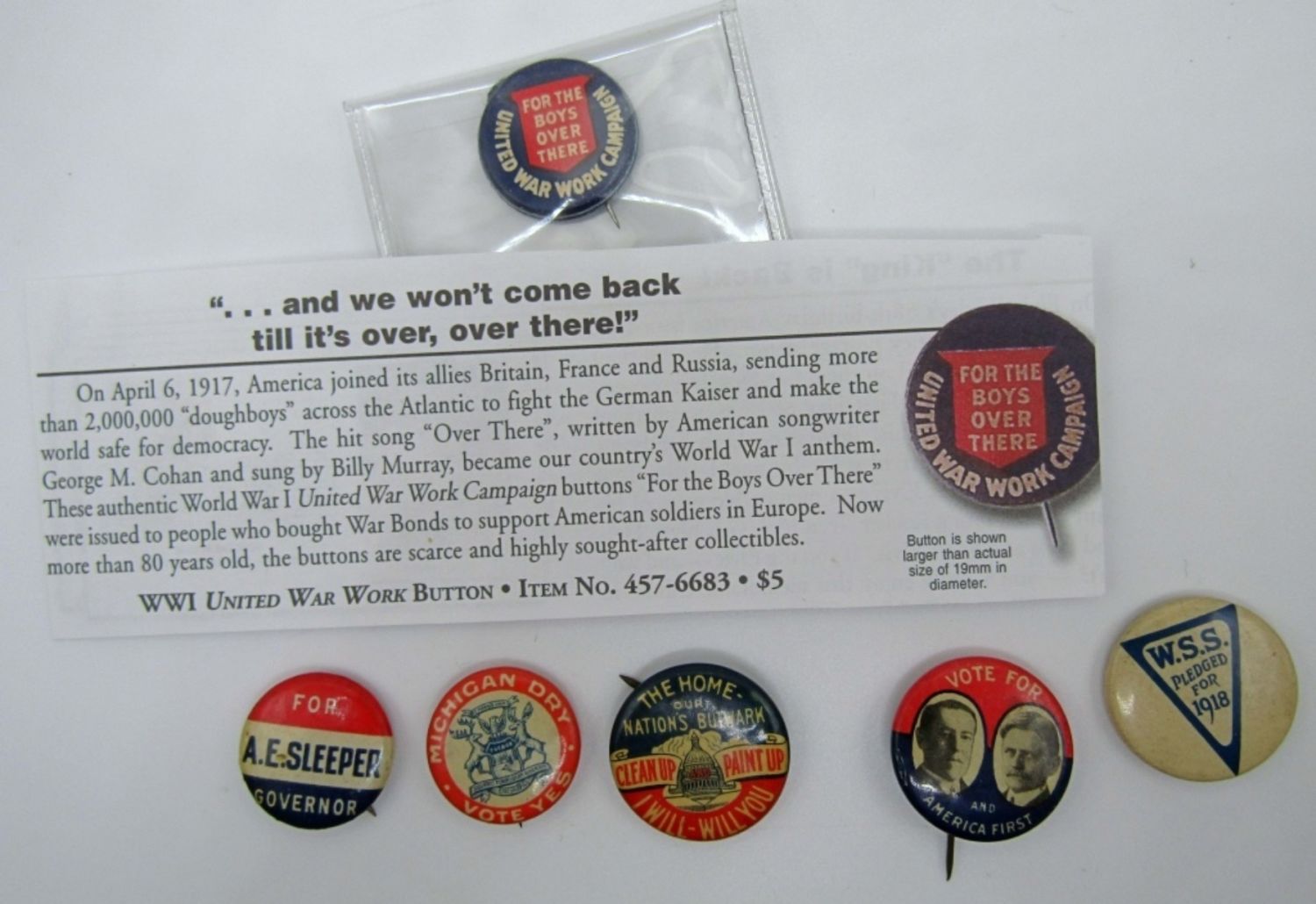 WWI ERA. INCLUDES UNITED WAR WORK CAMPAIGN CARDBOARD PIN, CLEAN UP AND PAINT UP, MICHIGAN DRY, & MORE!