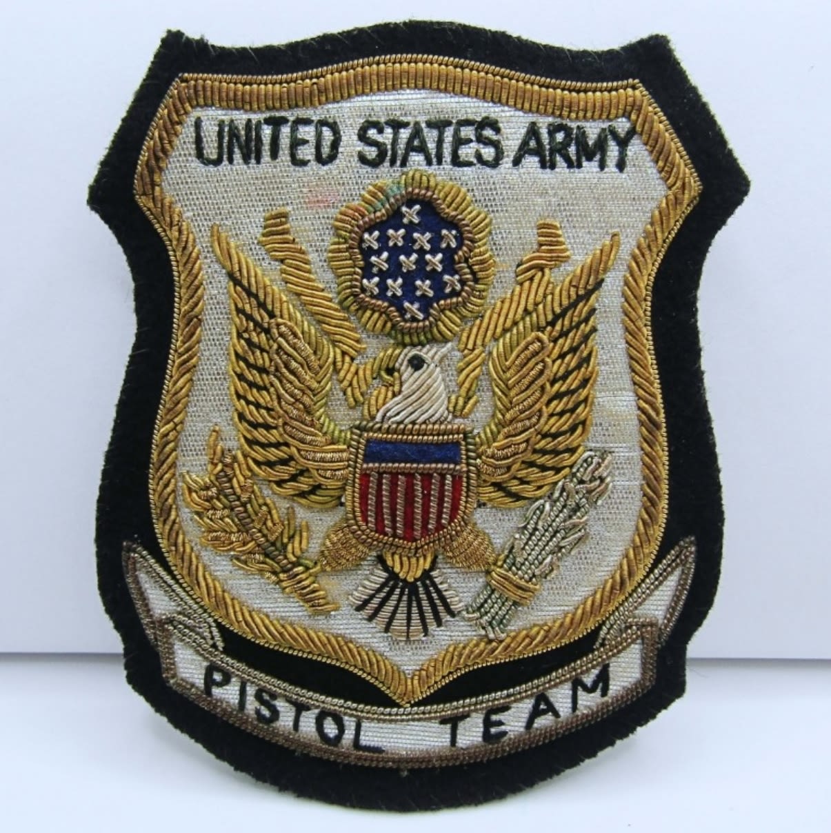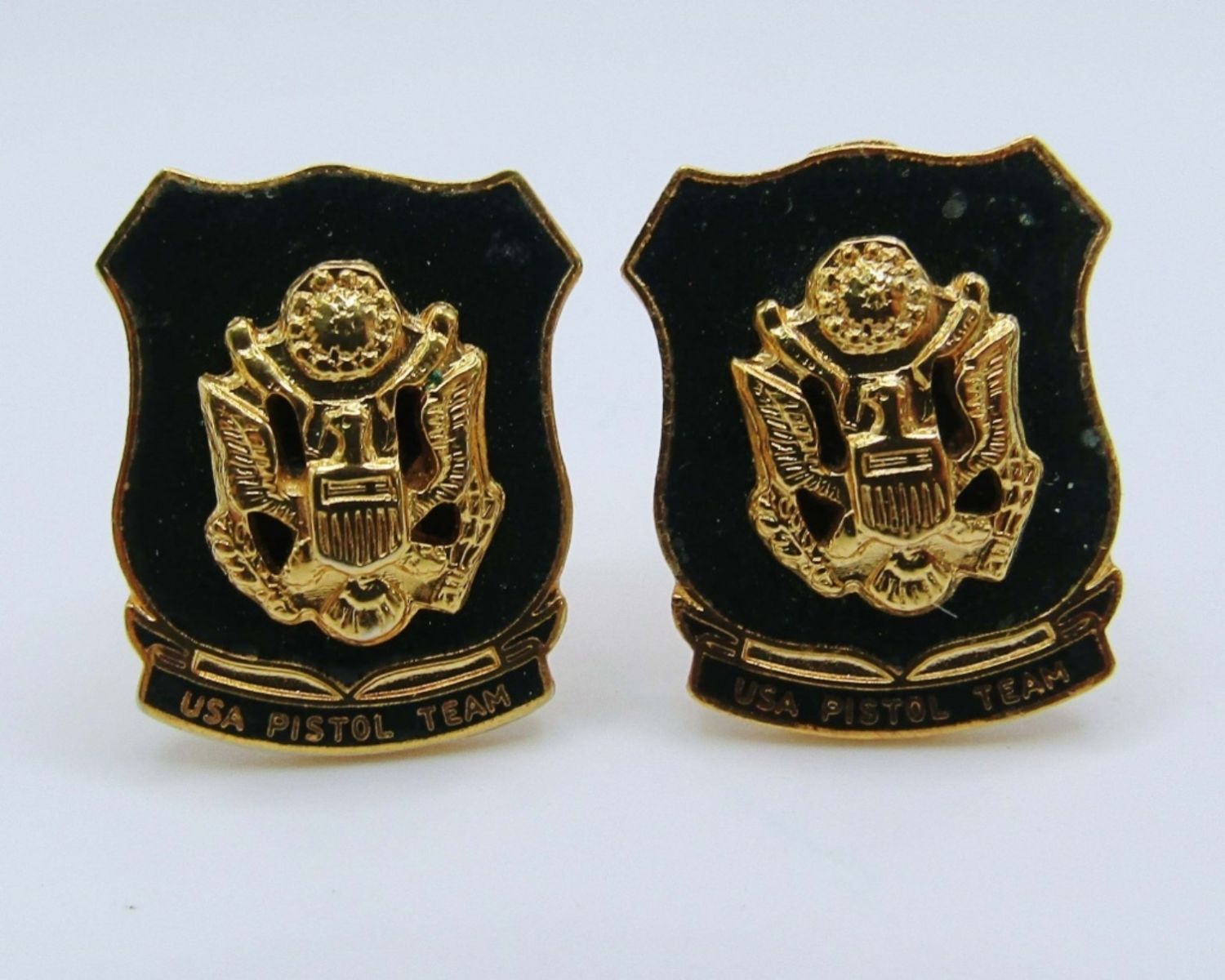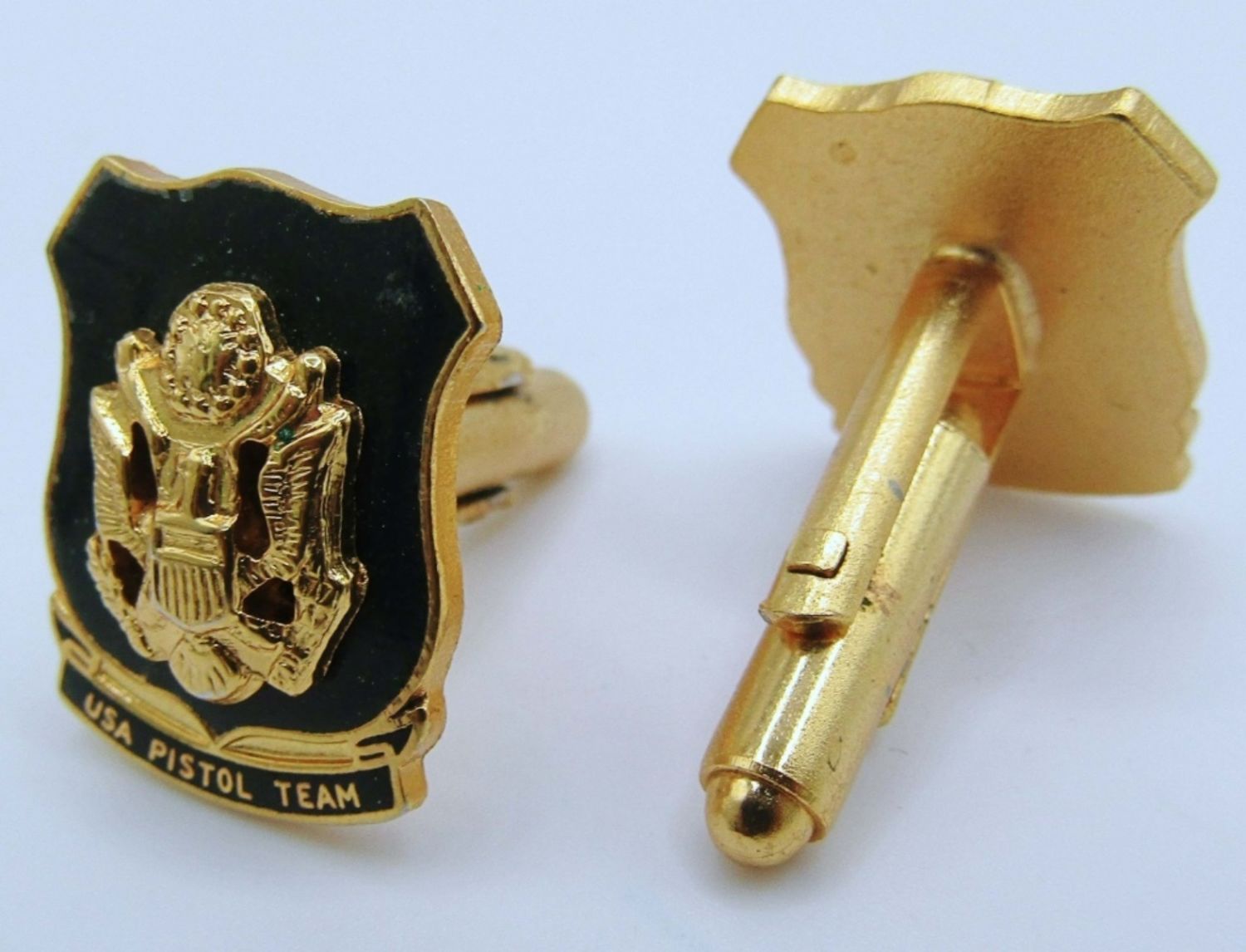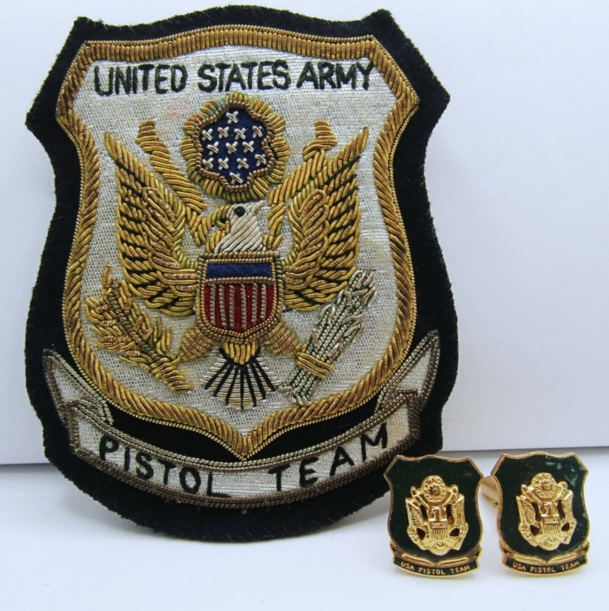 VINTAGE UNITED STATES ARMY PISTOL TEAM LARGE PATCH WITH PIN BACK & (2) ENAMEL USA PISTOL TEAM SHIELD CUFFLINKS.