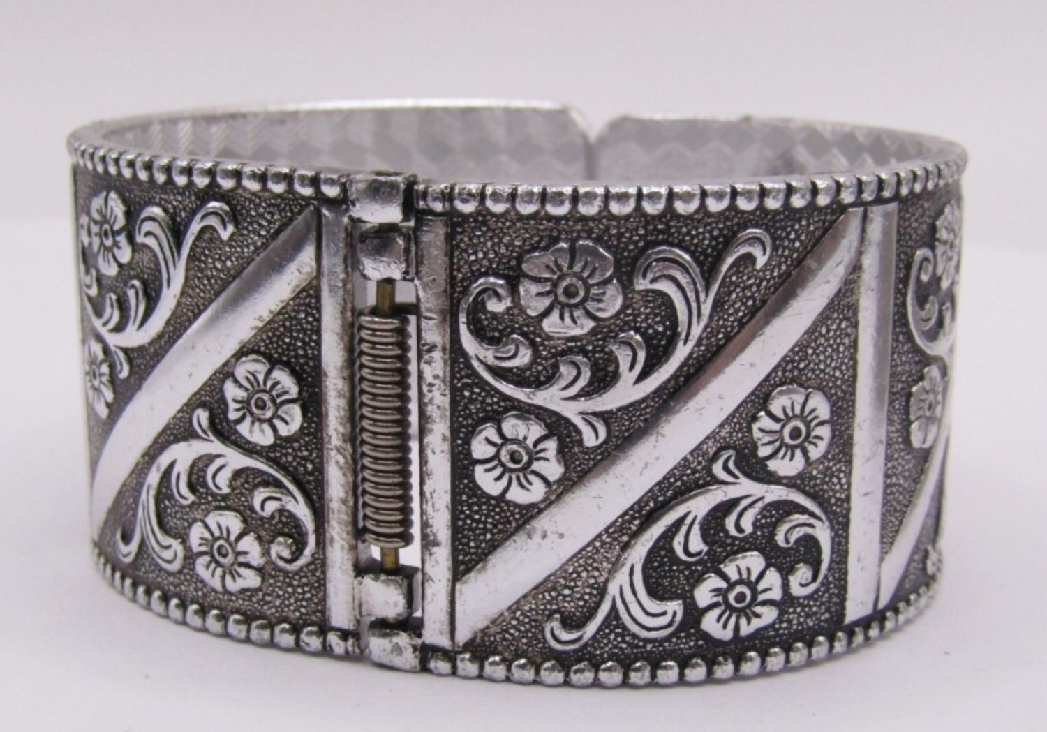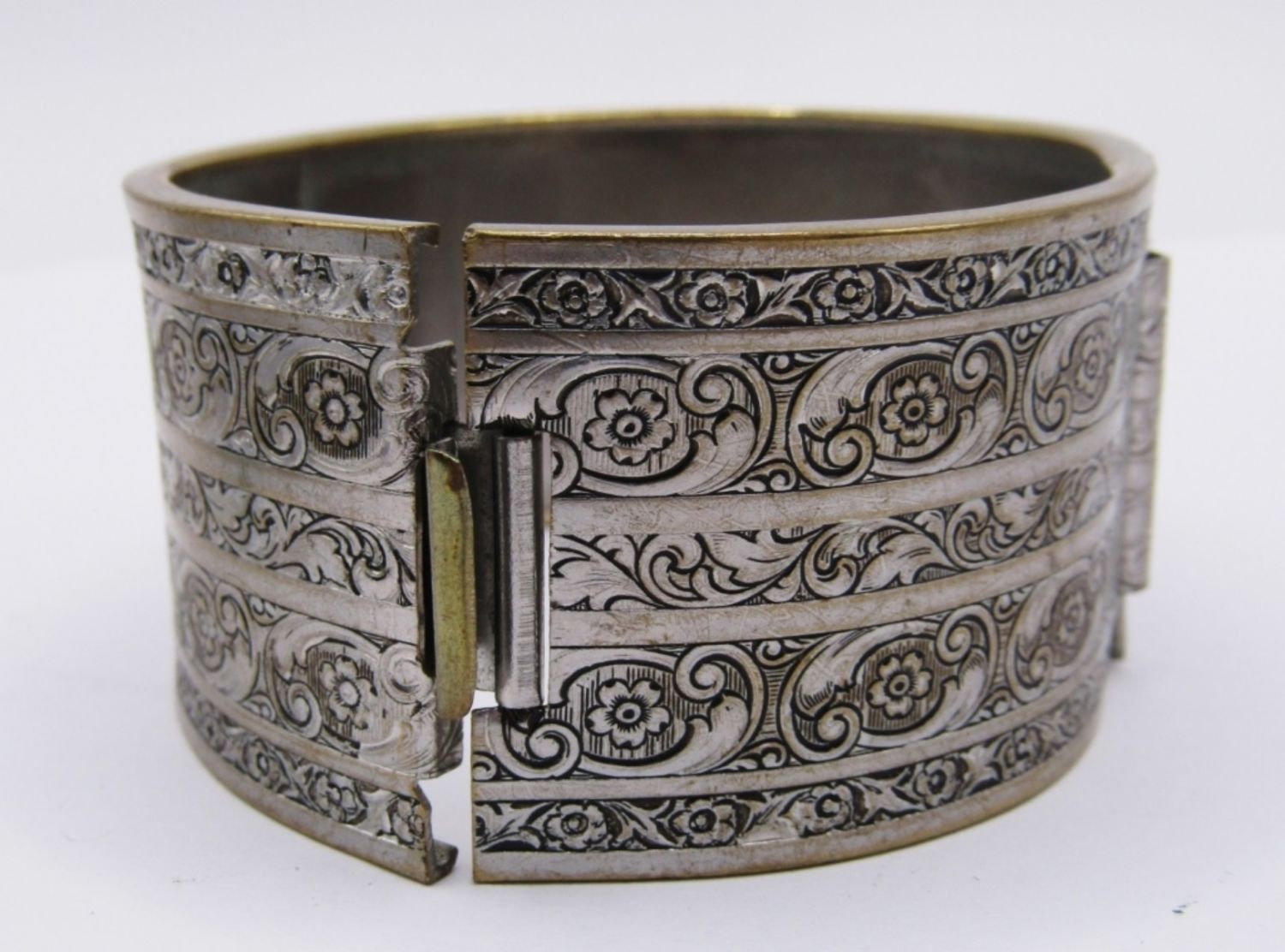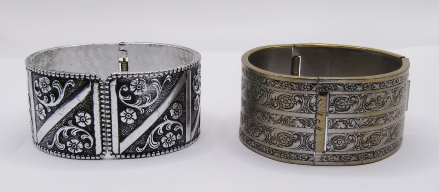 LOT OF 2 HINGE STYLE BRACELETS WITH SILVER BLACK TONE AND BEAUTIFUL ETCHED DESIGNS