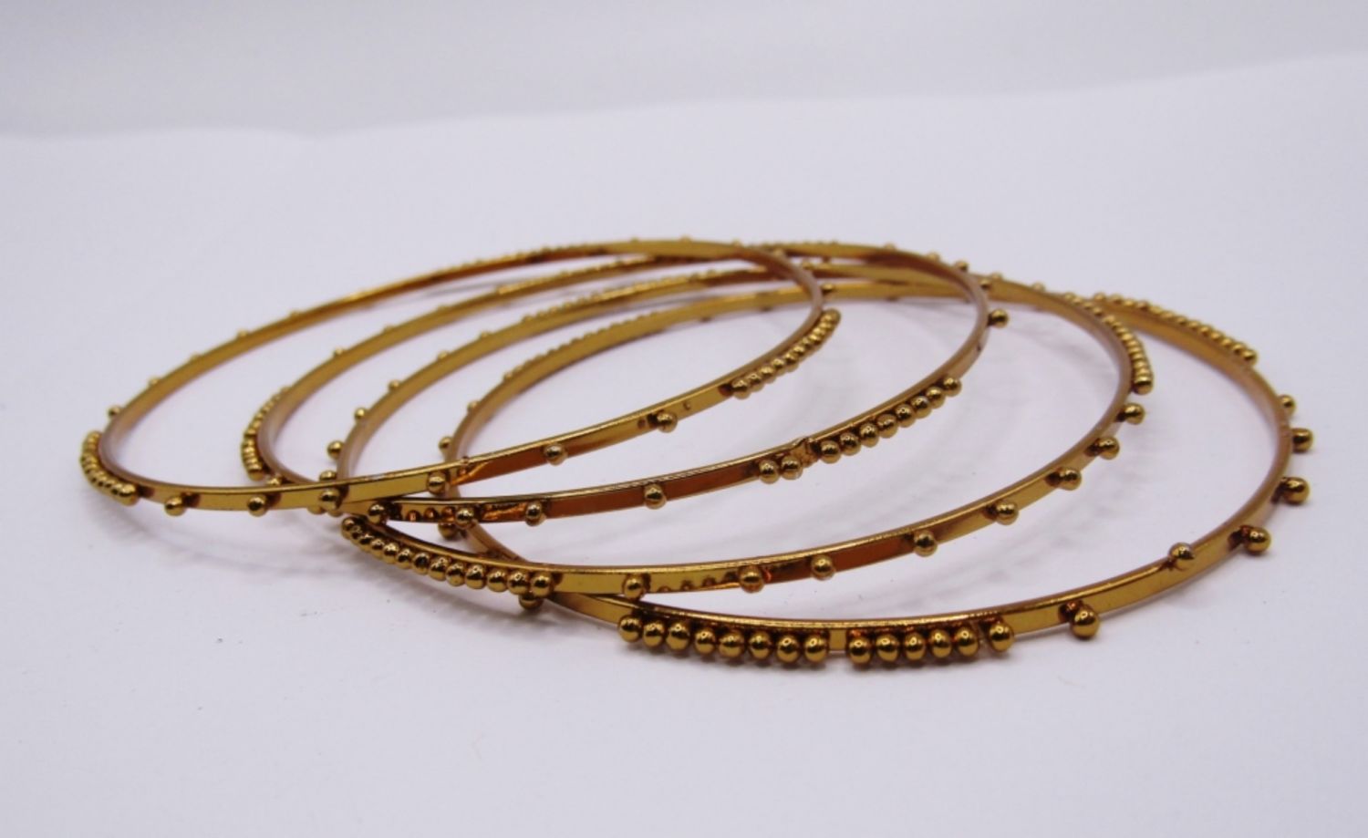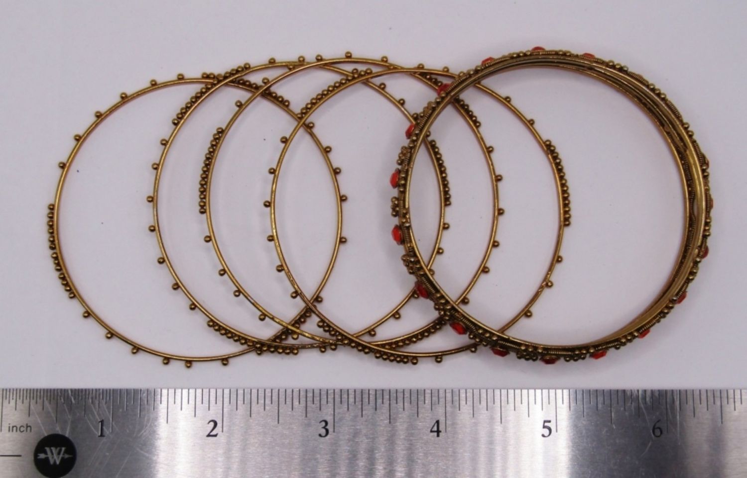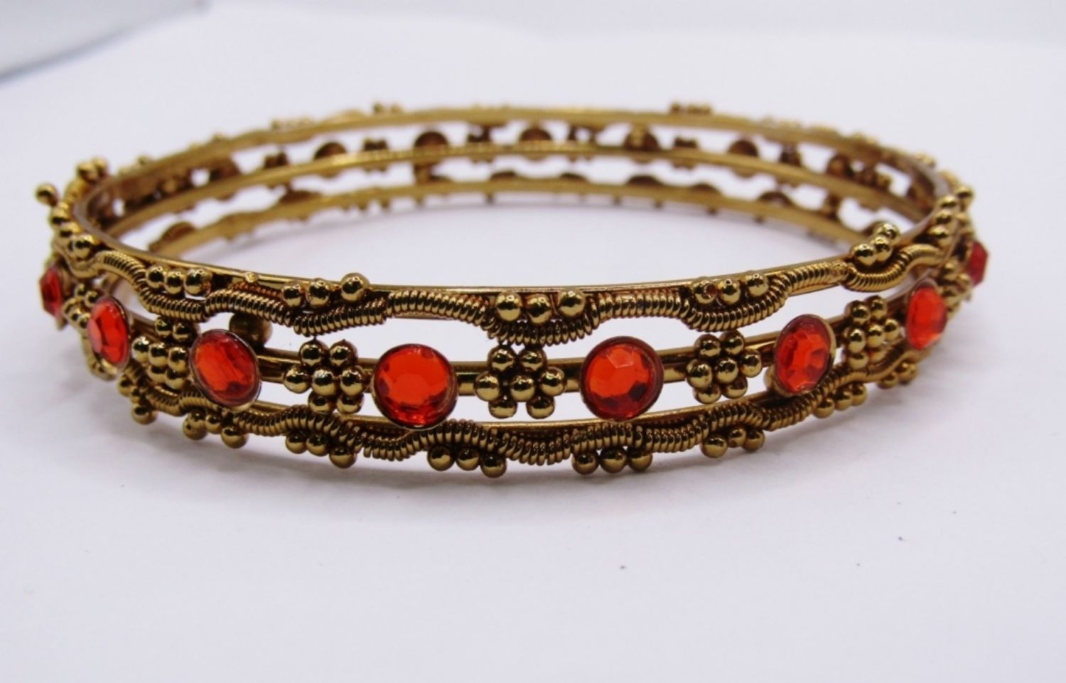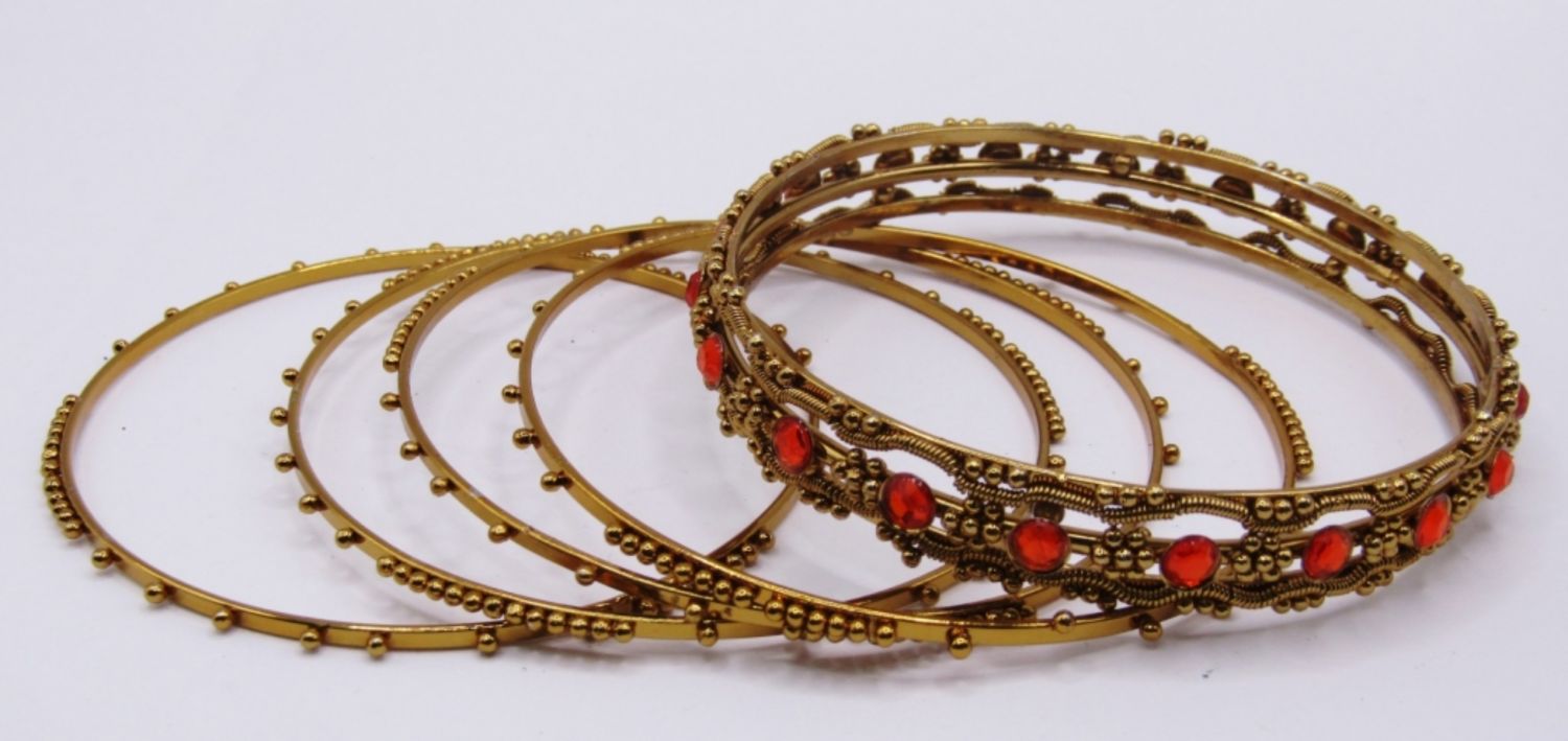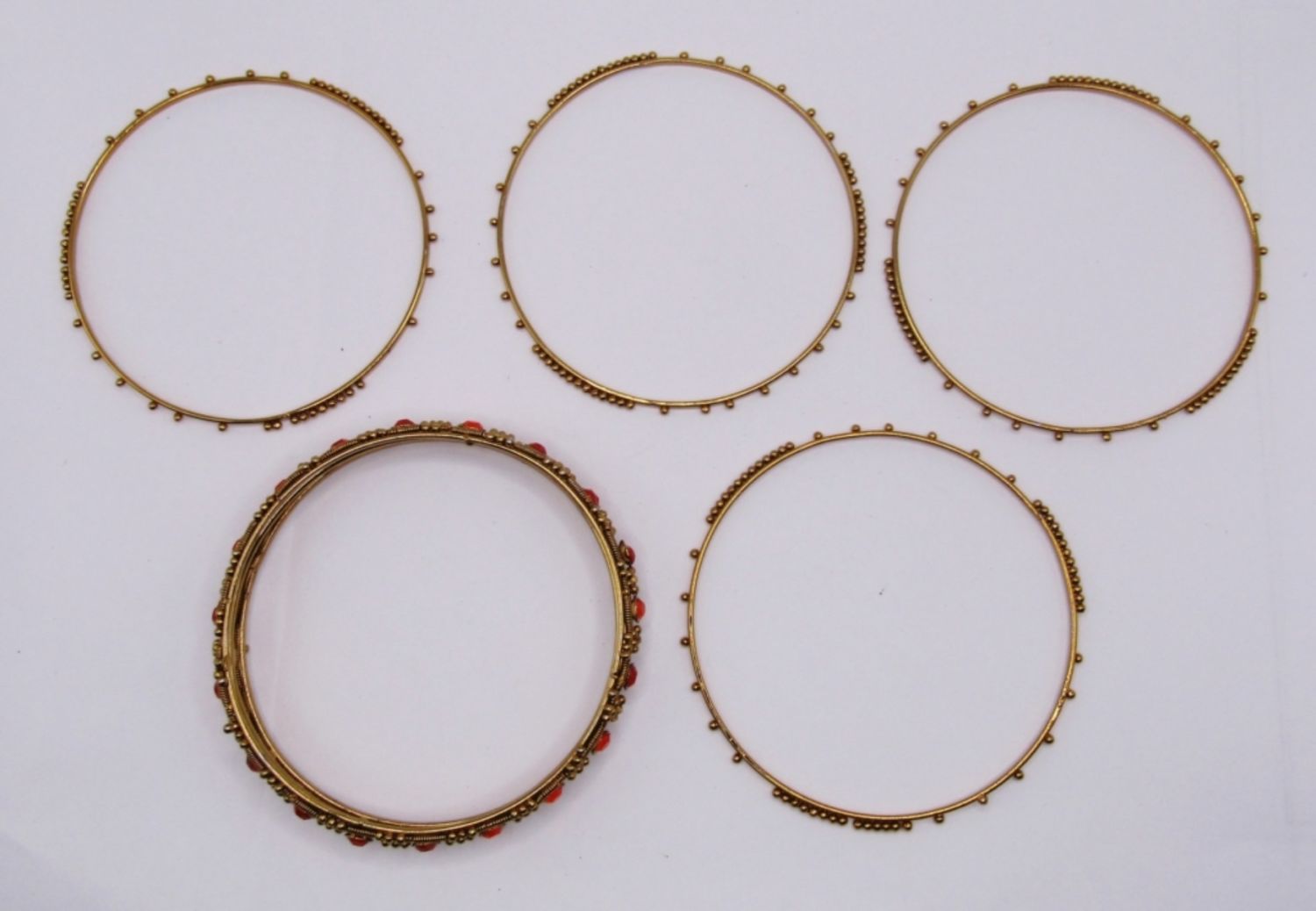 LOT OF 5 BANGLE BRACELETS WITH GOLD TONE AND UNIQUE DESIGNS, 1 WIDE WITH ORANGE STONES, 4 SKINNY WITH GOLD TINY BEADED DESIGN