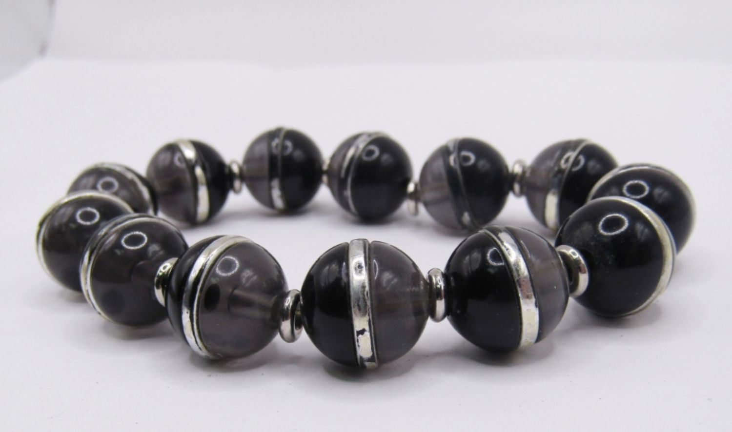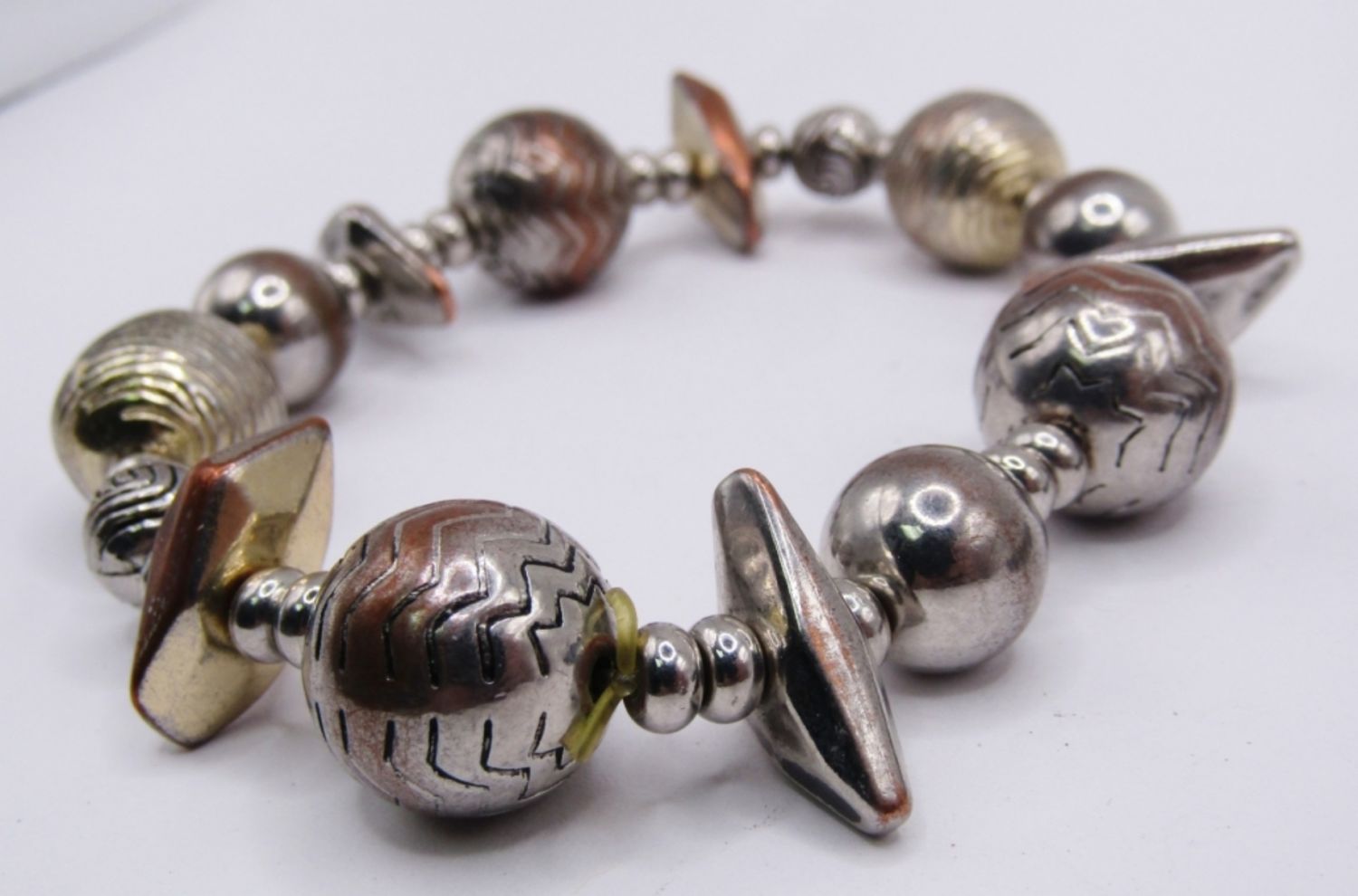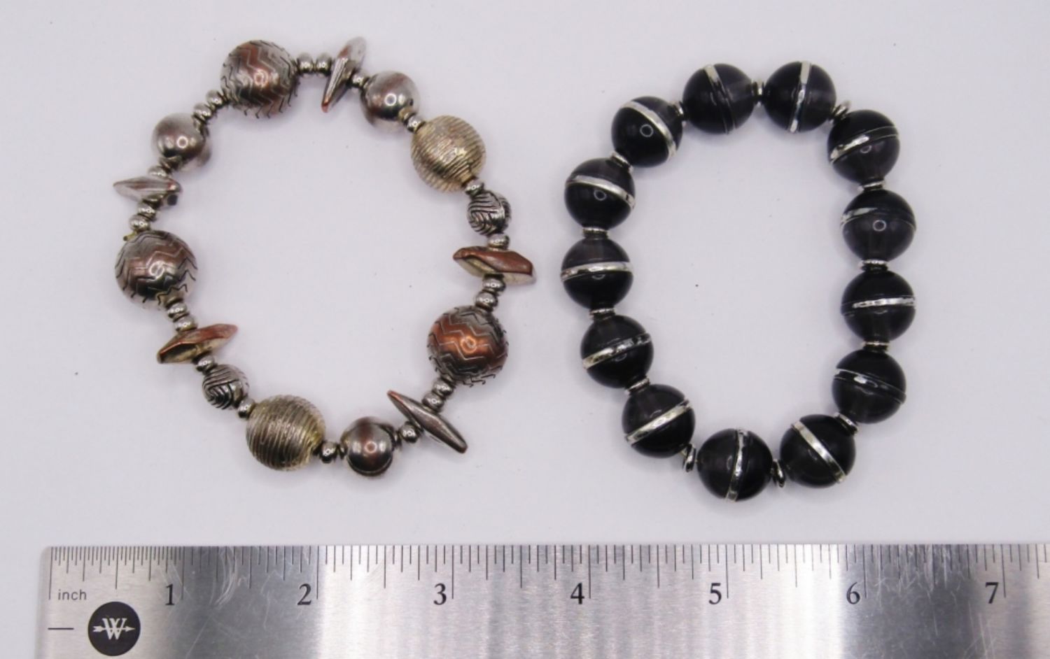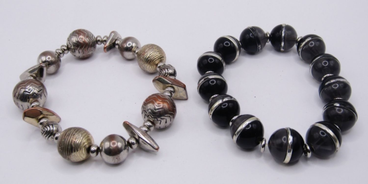 LOT OF 2 VINTAGE STRETCH STYLE BRACELETS WITH LARGE BEAD DESIGNS, 1 WITH BLACK AND SILVER TONE, 1 WITH COPPER AND SILVER TONE