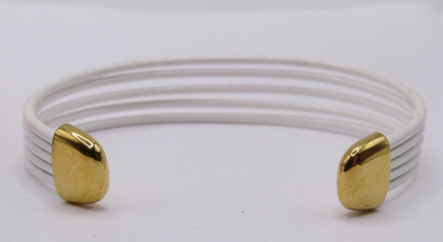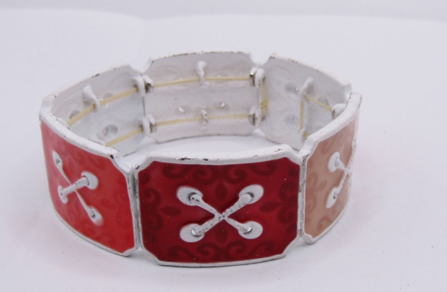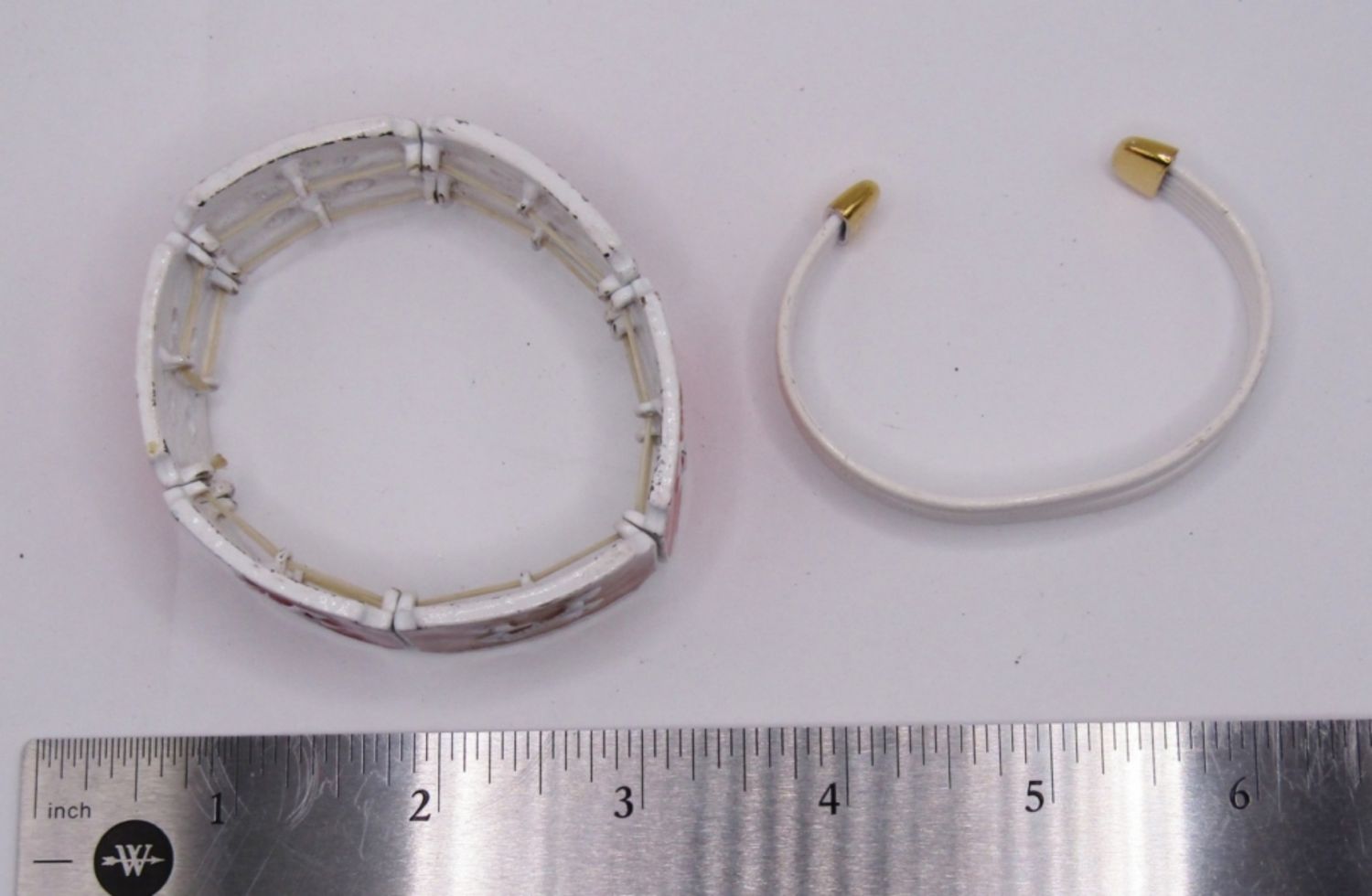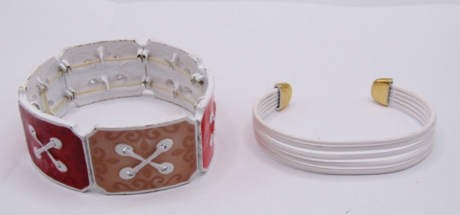 LOT OF 2 VINTAGE WHITE METAL BRACELETS, 1 CUFF STYLE, 1 STRETCH STYLE WITH UNIQUE COLORED TILE DESIGN