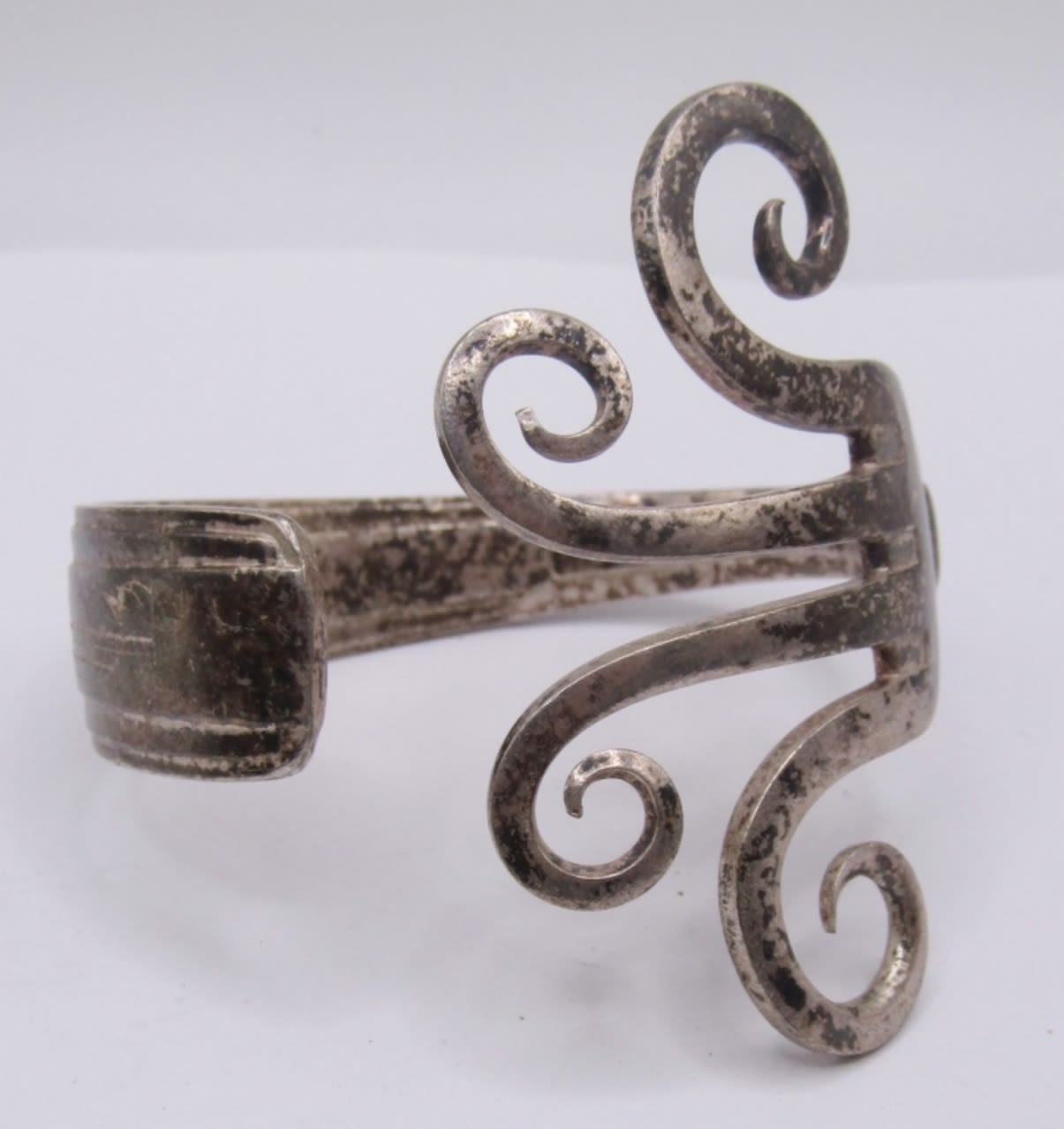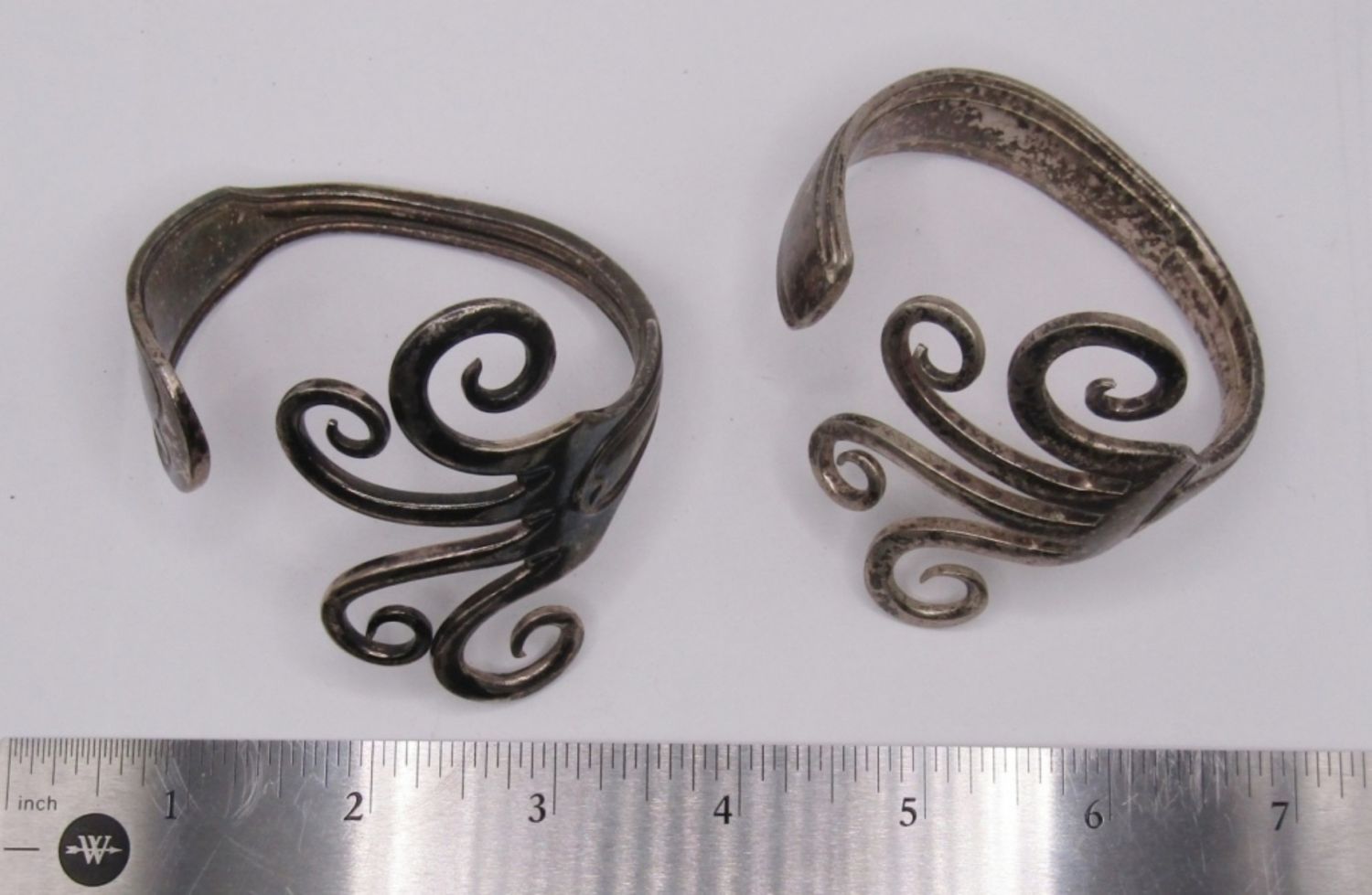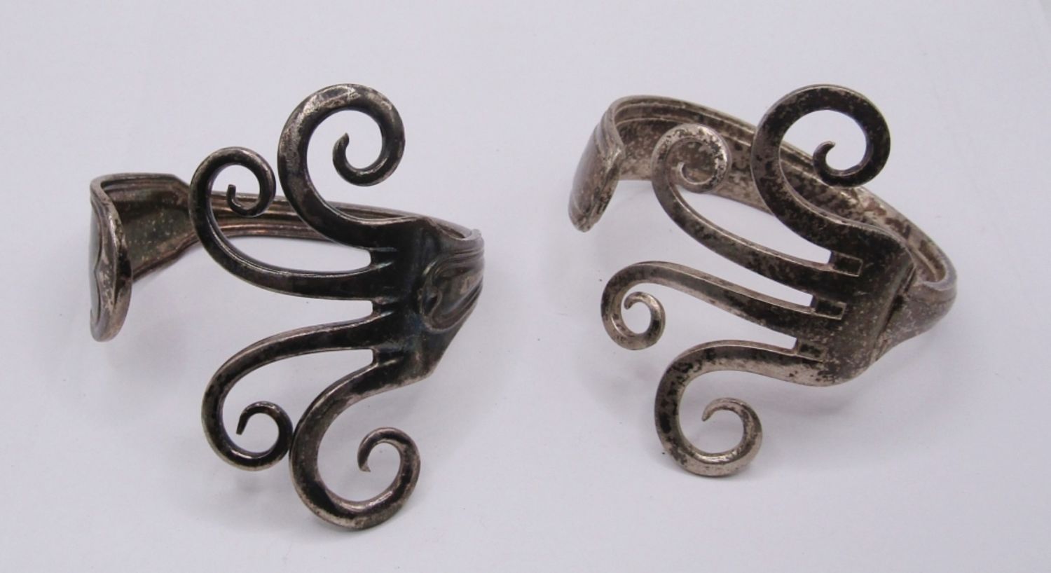 LOT OF 2 MATCHING ANTIQUE SILVER FORK BRACELETS, CUFF STYLE, HEAVY WITH A UNIQUE EYE CATCHING DESIGN