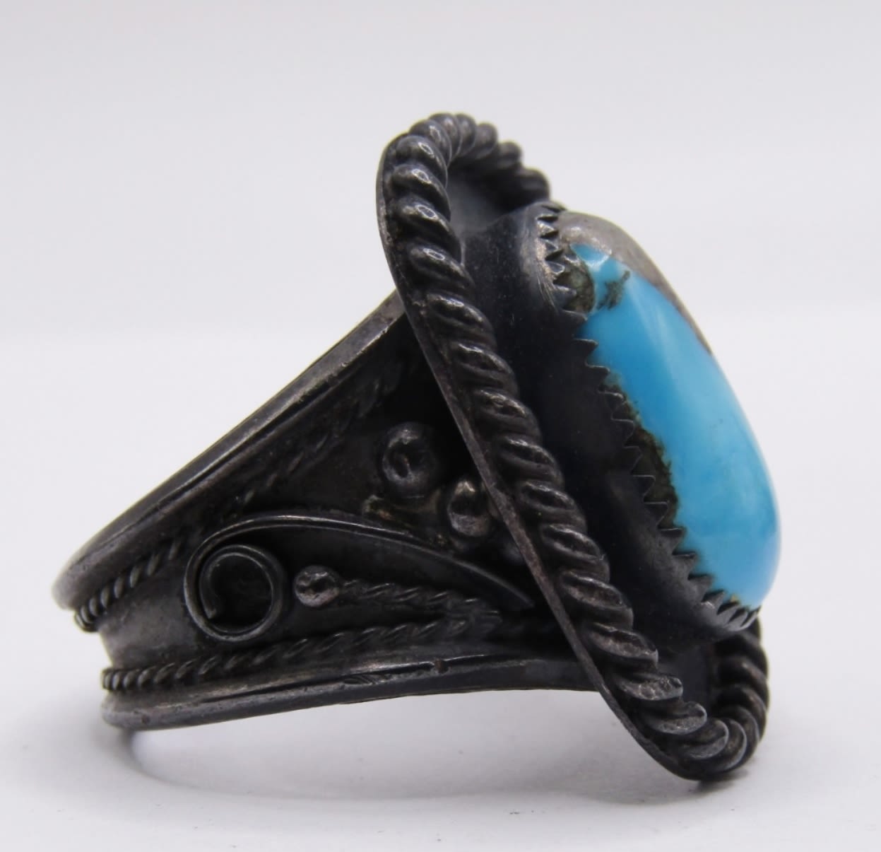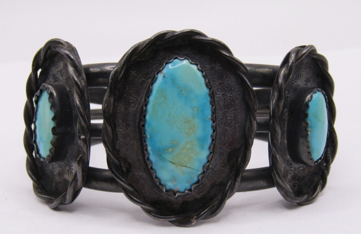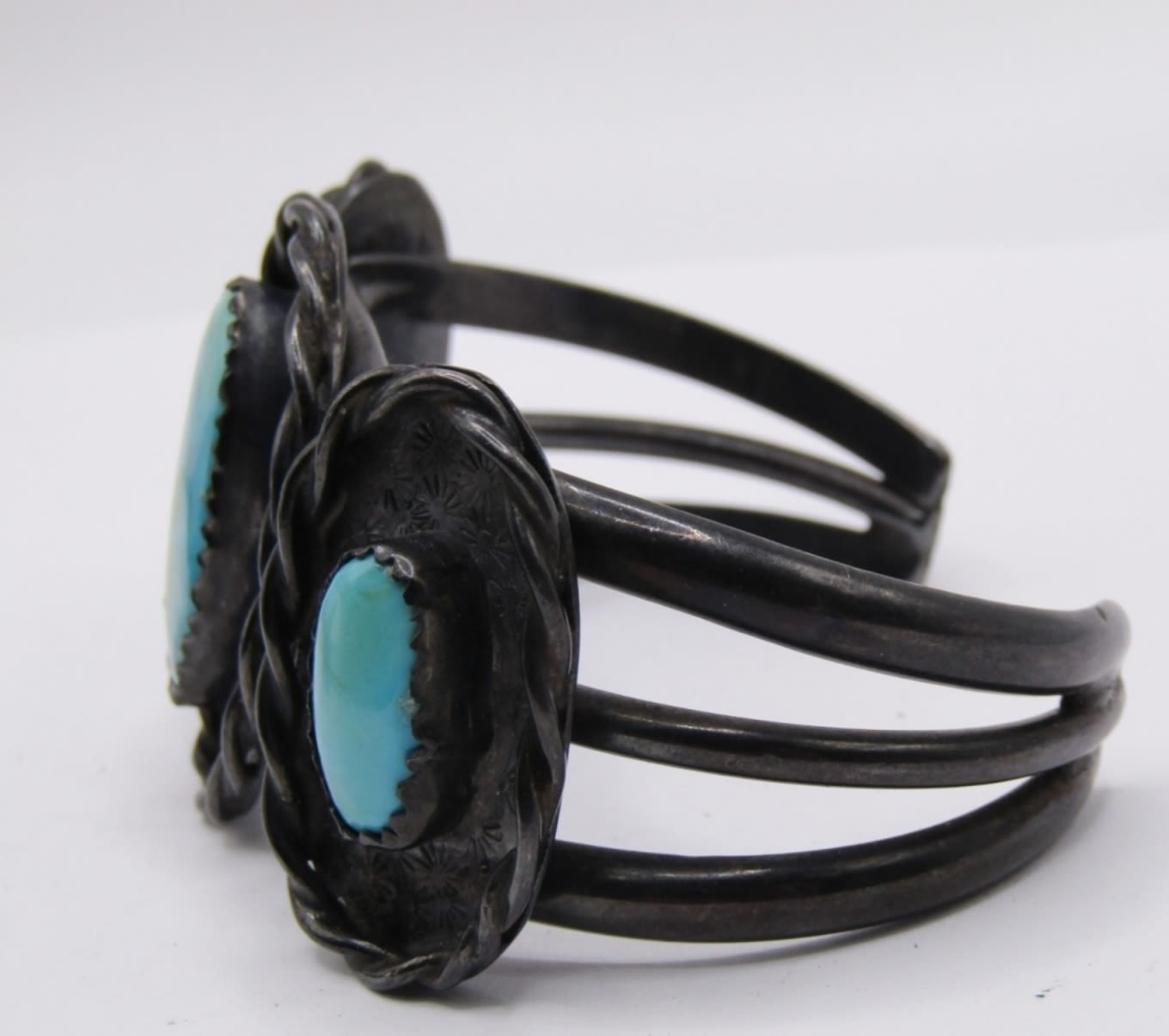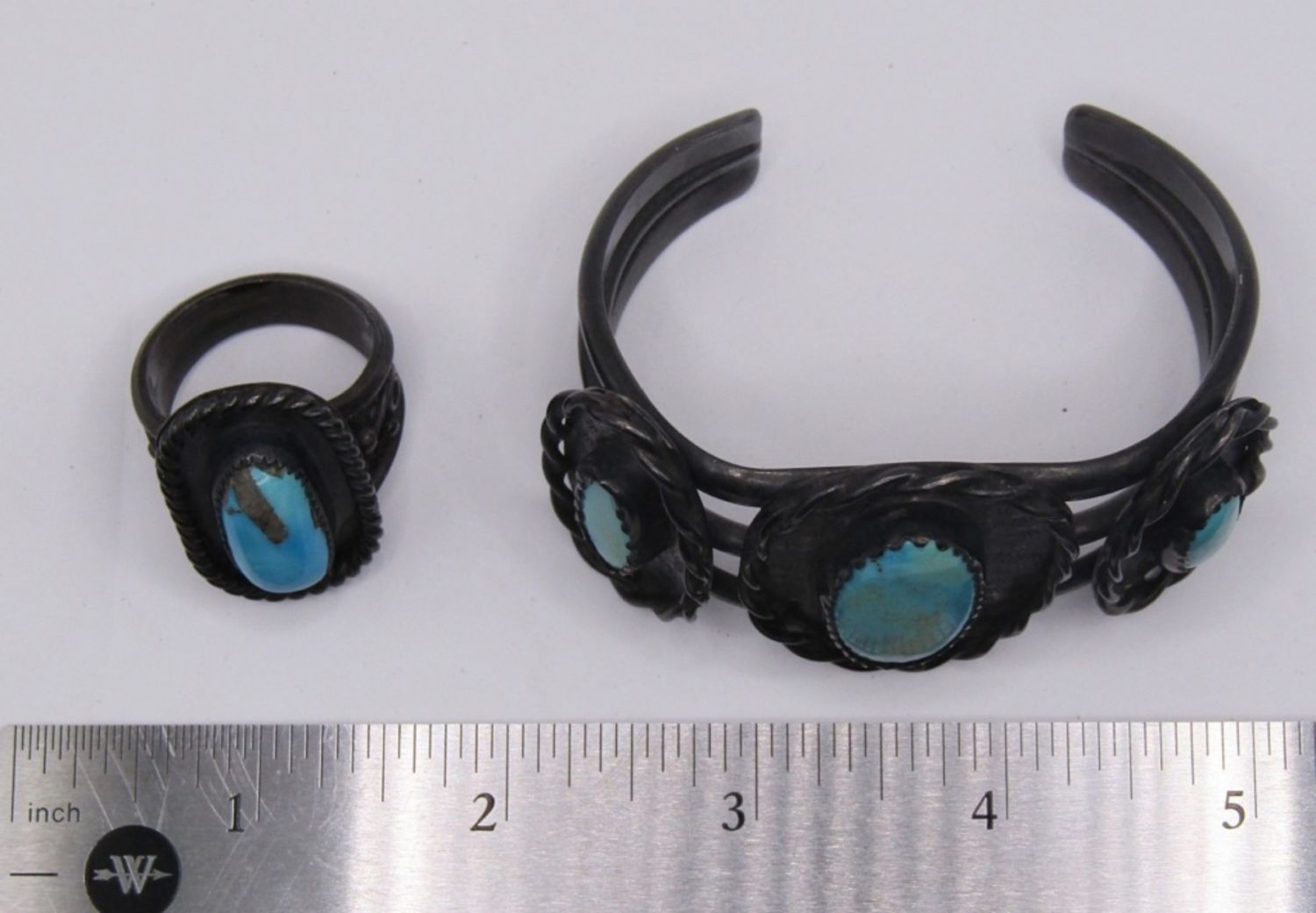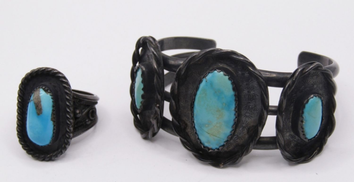 MATCHING CUFF BRACELET AND RING SET, BEAUTIFUL LARGE TURQUOISE STONES, WIDE SET WITH BLACK TONE METAL
