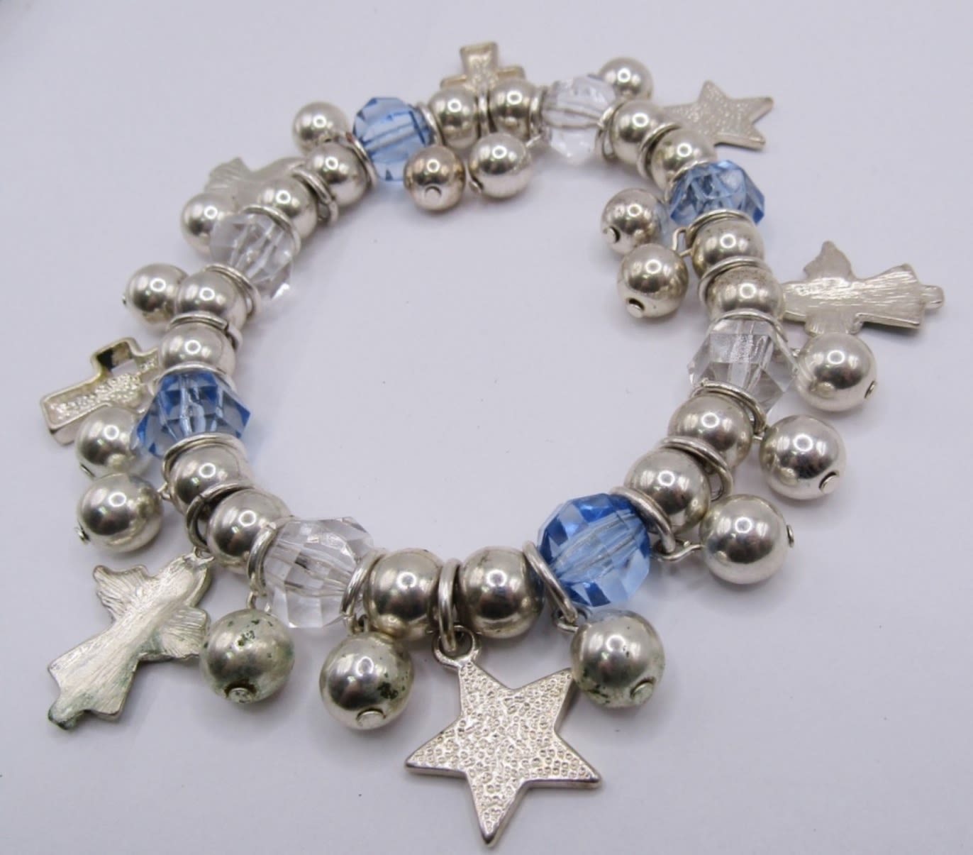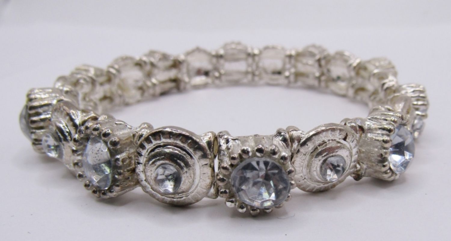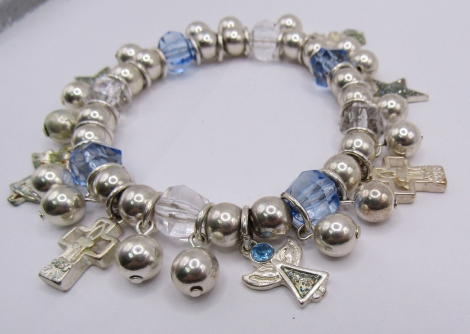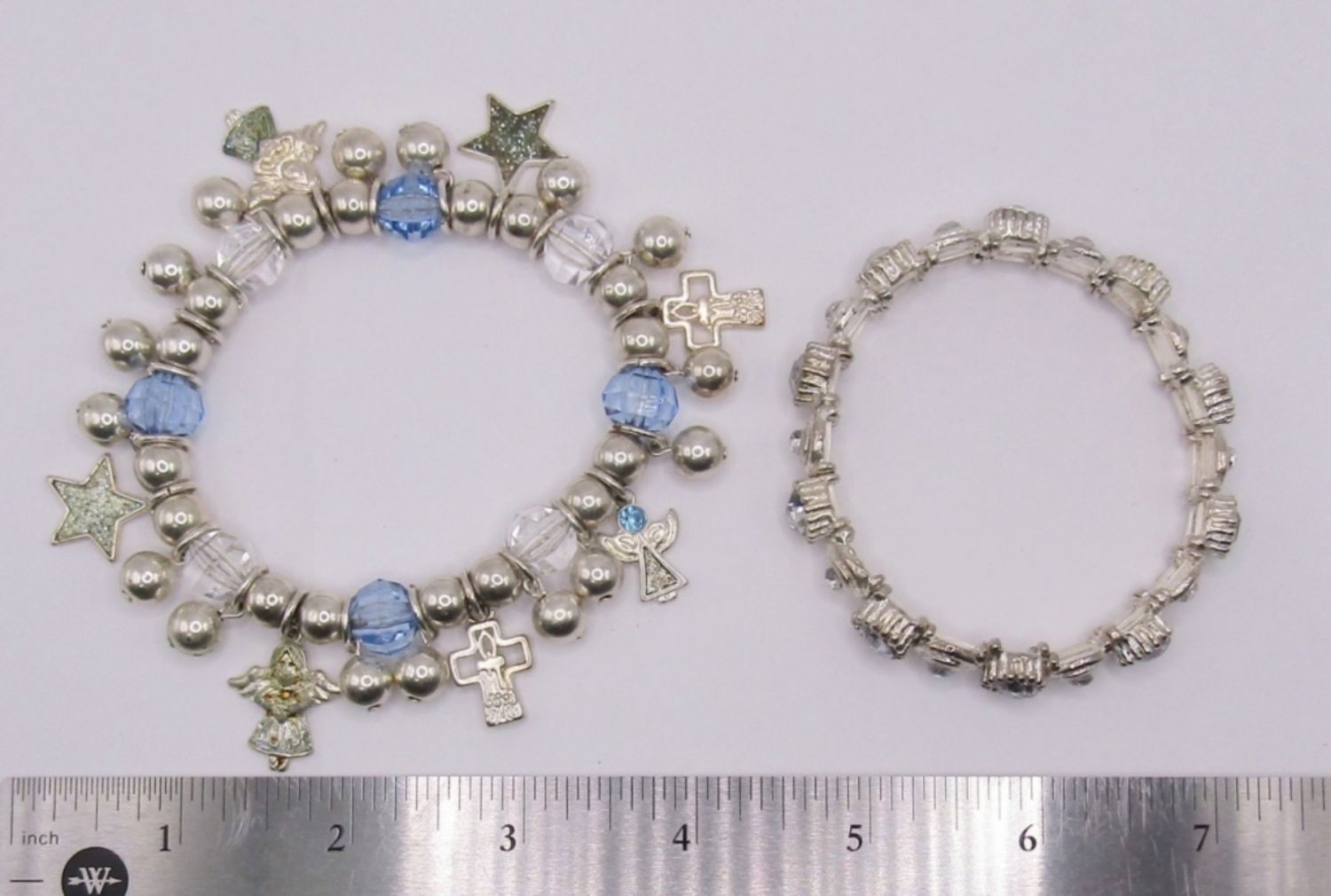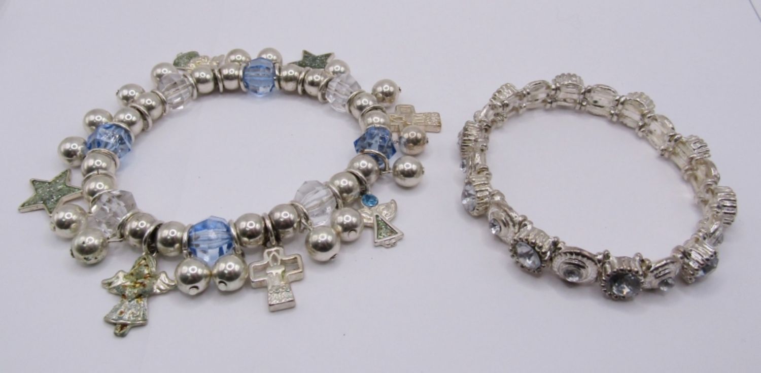 SET OF 2 STRETCH BRACELETS, SILVER TONE, 1 BEADED CHARM BRACELET, 1 SHINY RHINESTONE STYLE